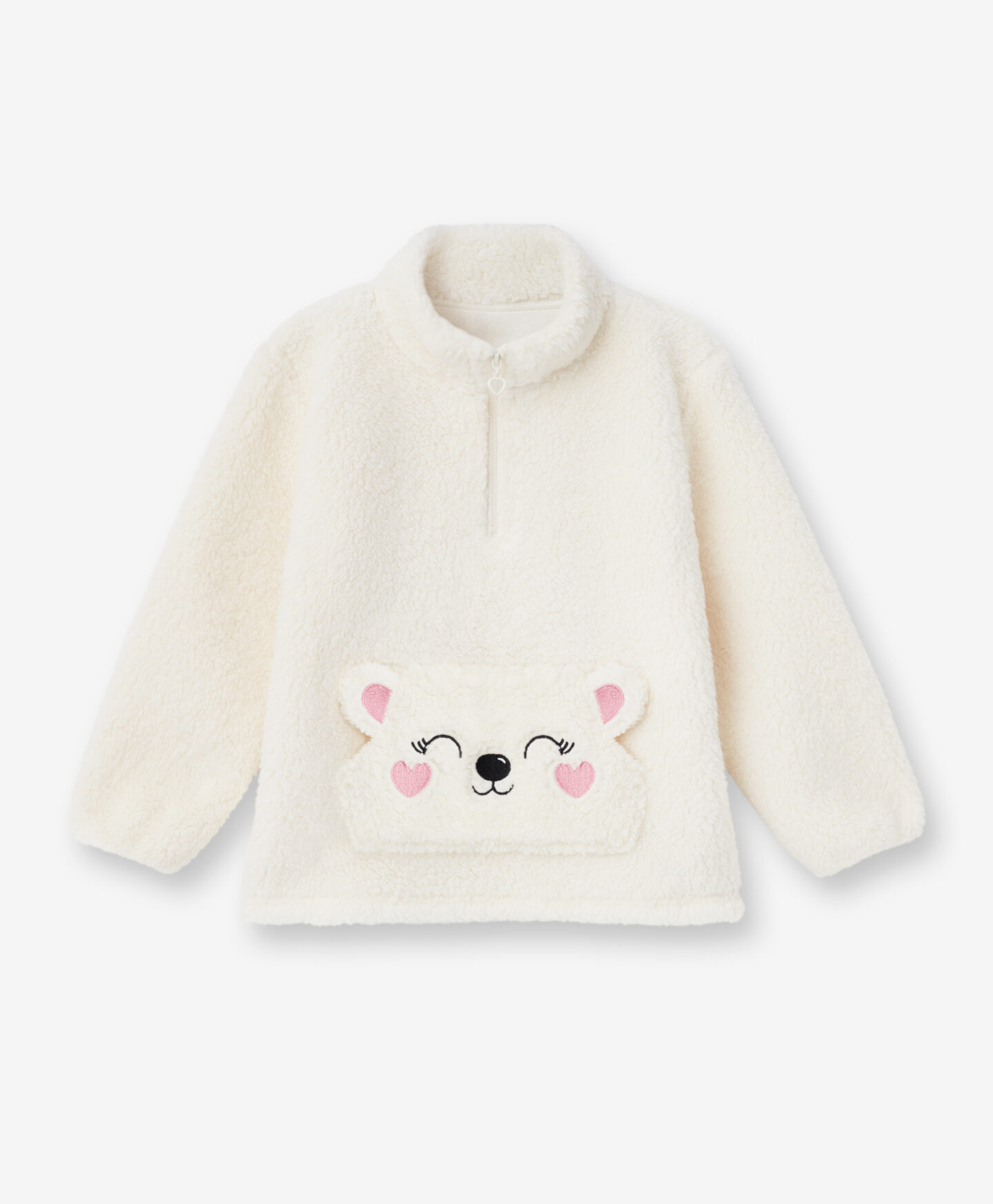 Bel pulover iz flisa sherpa za deklice je popolna izbira za male ljubiteljice udobja. Zadrga na vratu otroku olajša samostojno oblačenje in slačenje, prednji žep s prikupnim medvedkom in 3D detajli pa pogreje mrzle roke v hladnih dneh. Ohlapen kroj zagotavlja udobje pri nošenju, prijeten material pa toplino. Pulover je popoln za zimske večere doma ali za aktivnosti na prostem.