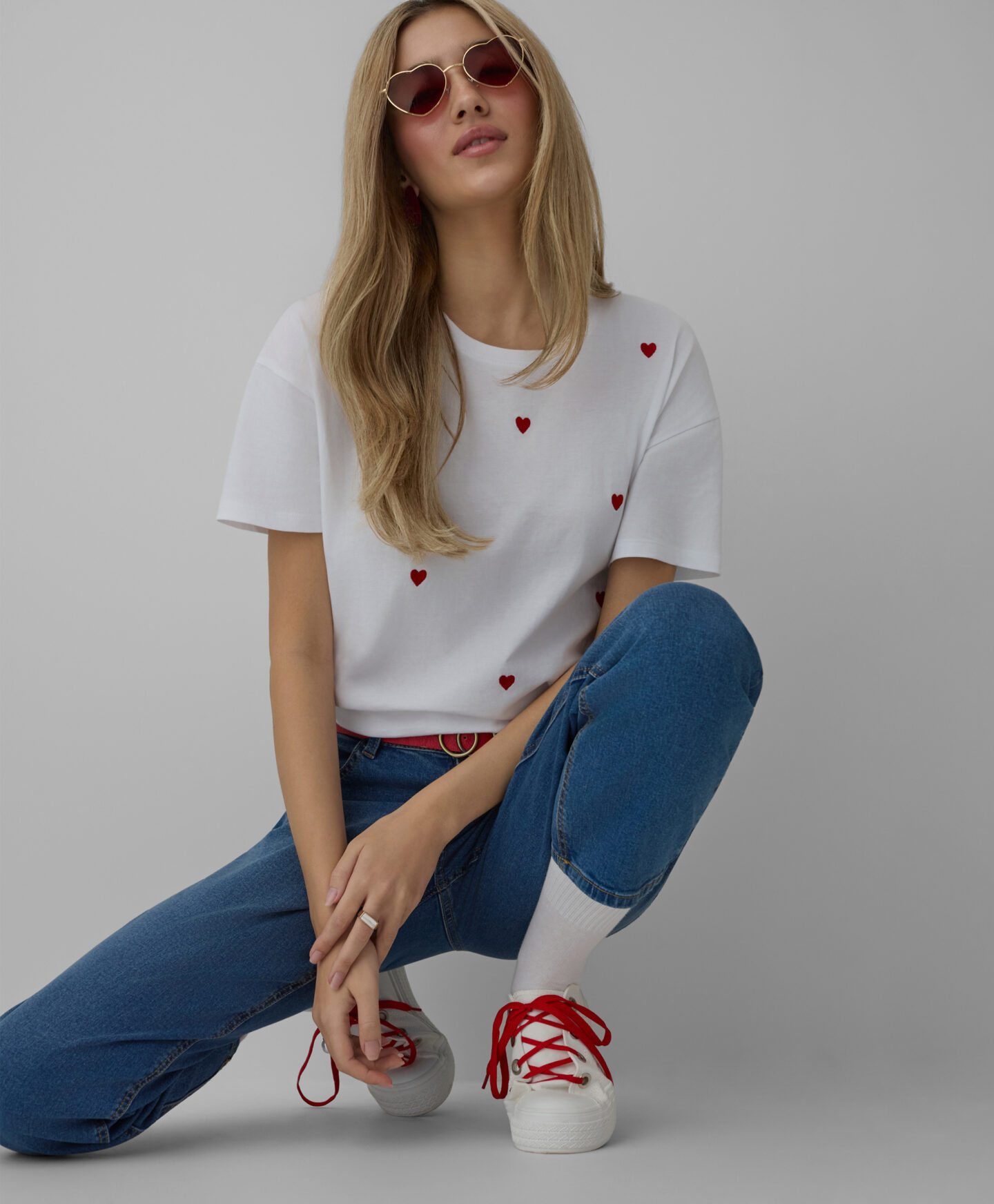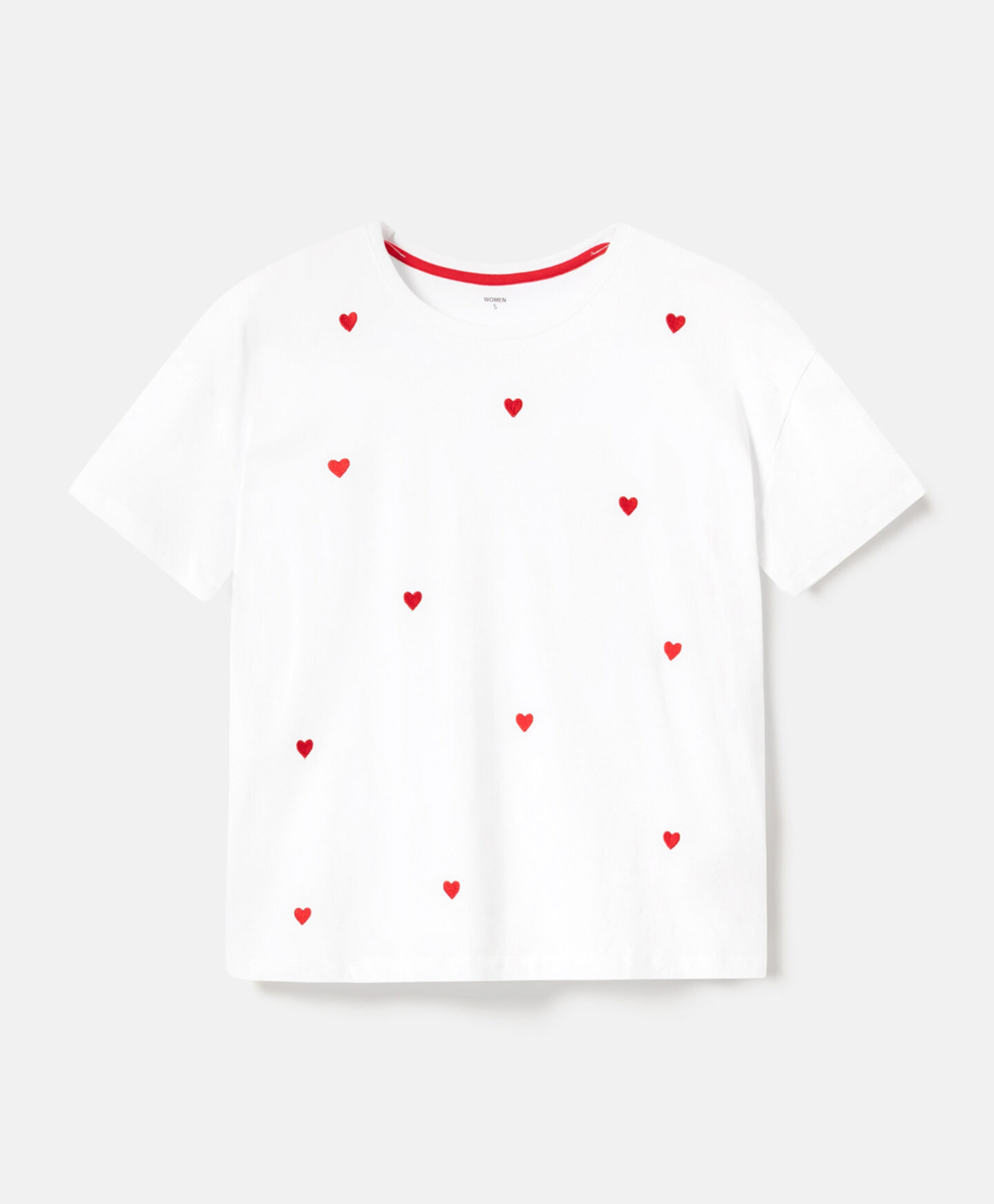 Bela majica za ženske 100% bombaž s srčastim vzorcem je ustvarjena za ljubiteljice udobja. Klasičen kroj, mehak material in čudovit vzorec ustvarjajo popolno kombinacijo za vsakdan. Na voljo v dveh barvah.