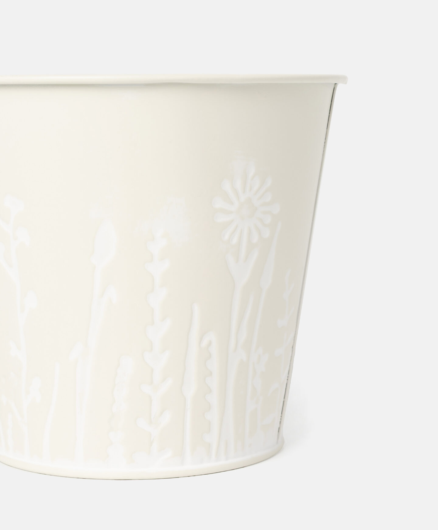 Beli kovinski cvetlični lonec z vzorcem je lahek, vzdržljiv in odporen na različne vremenske razmere. Krasi ga spomladanski vzorec, ki bo na vašo teraso ali balkon vnesel pridih svežine. Lonec bo odličen za manjše rastline, zelenjavo ali rože. Je enostaven za čiščenje: enostavno ga obrišete z vlažno krpo in že mu boste povrnili sijaj. V ponudbi je na voljo več vzorcev.