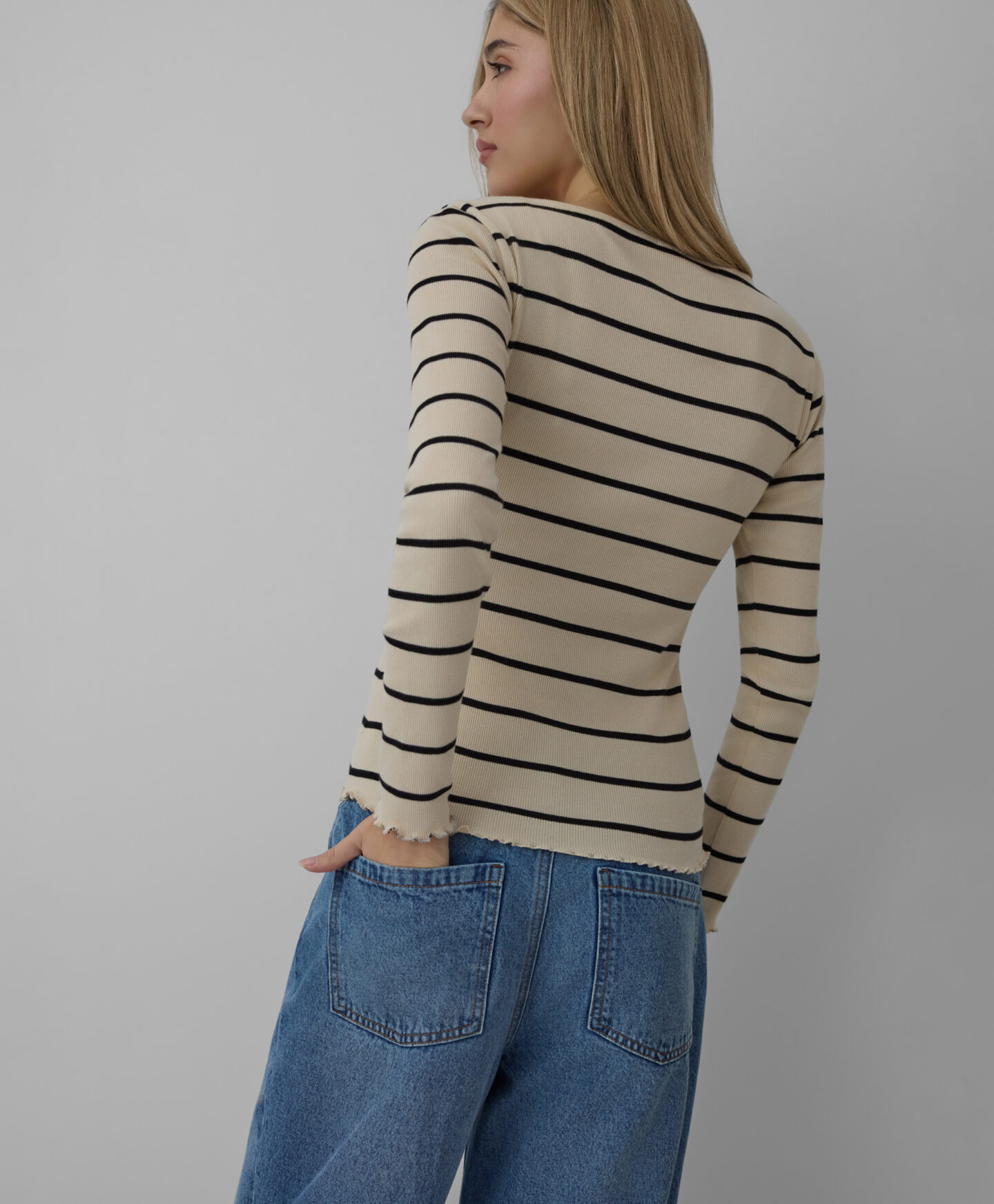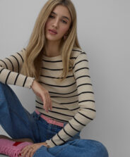 Bež črtasta majica za ženske z visoko vsebnostjo bombaža in elastana se popolnoma prilega postavi. Dekorativni zaključek bo vsakemu outfitu dodal piko na i. Majica lahko kombinirate tako s kavbojkami kot tudi elegantnimi hlačami. Na voljo je v dveh barvah.