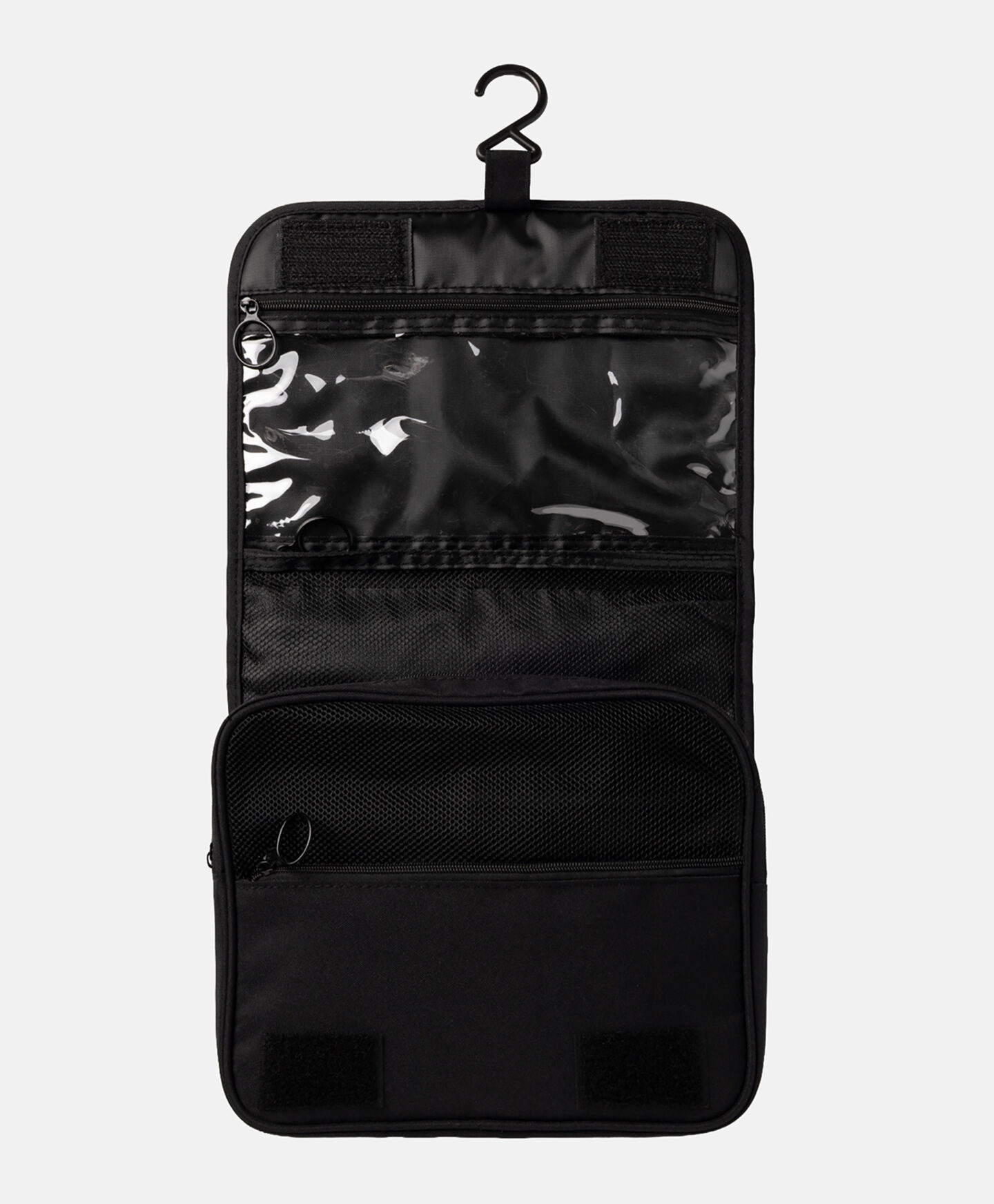 Črna kozmetična torbica s kavljem za obešanje je nepogrešljiv pripomoček na počitnicah. Številni razdelki, mrežasti žepi in elastični trakovi zagotavljajo, da je vse na svojem mestu, poleg tega pa hitro dostopno. Kozmetična torbica je izdelana iz materiala, ki je odporen na umazanijo.
