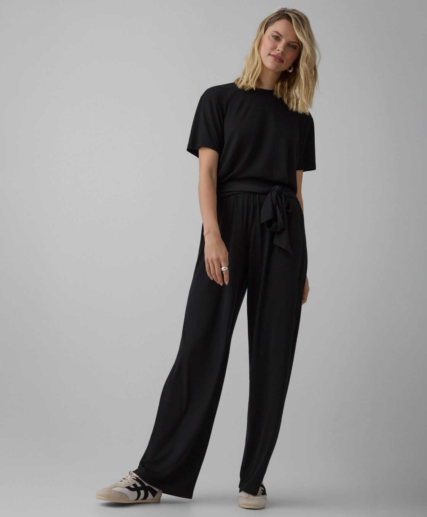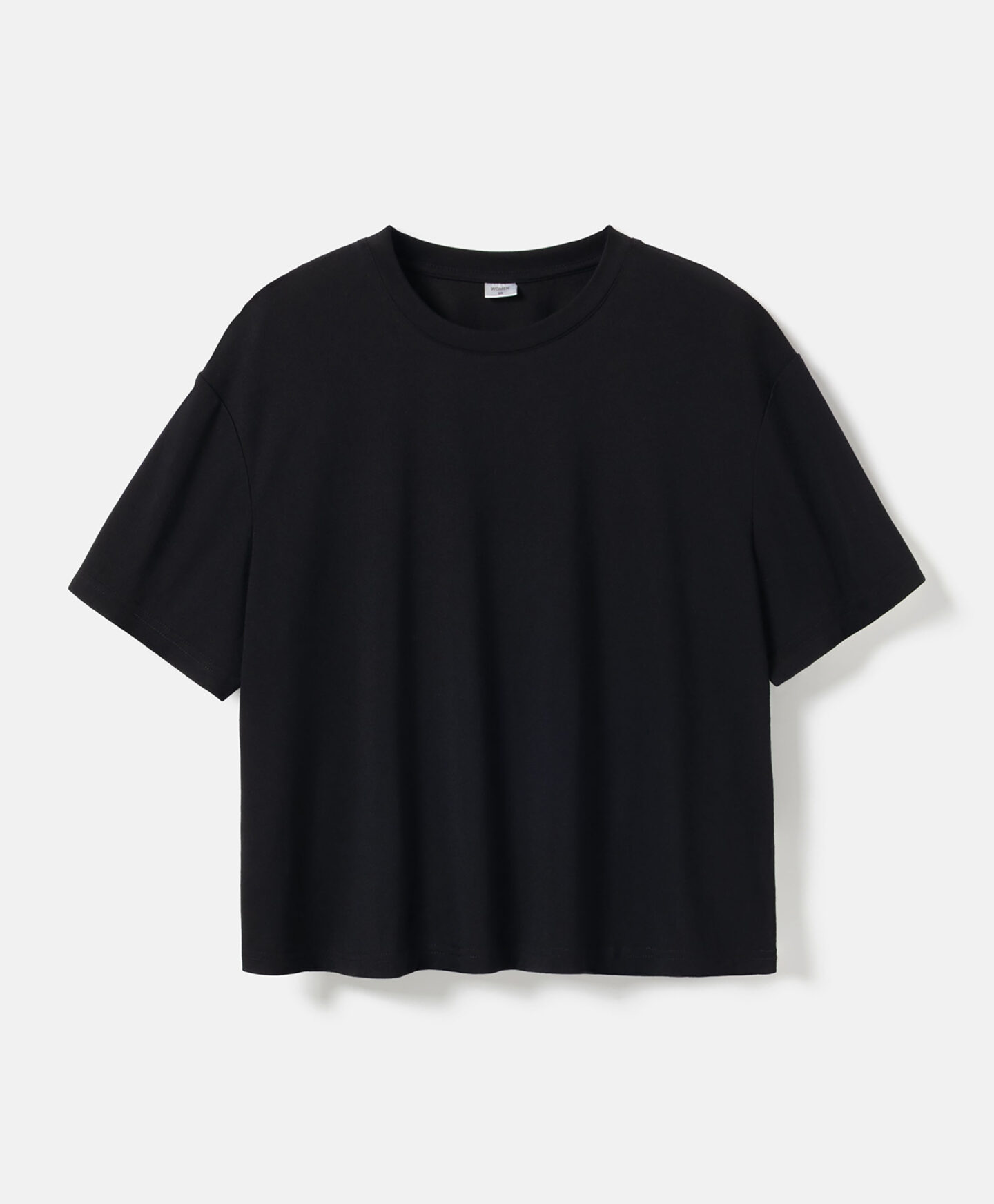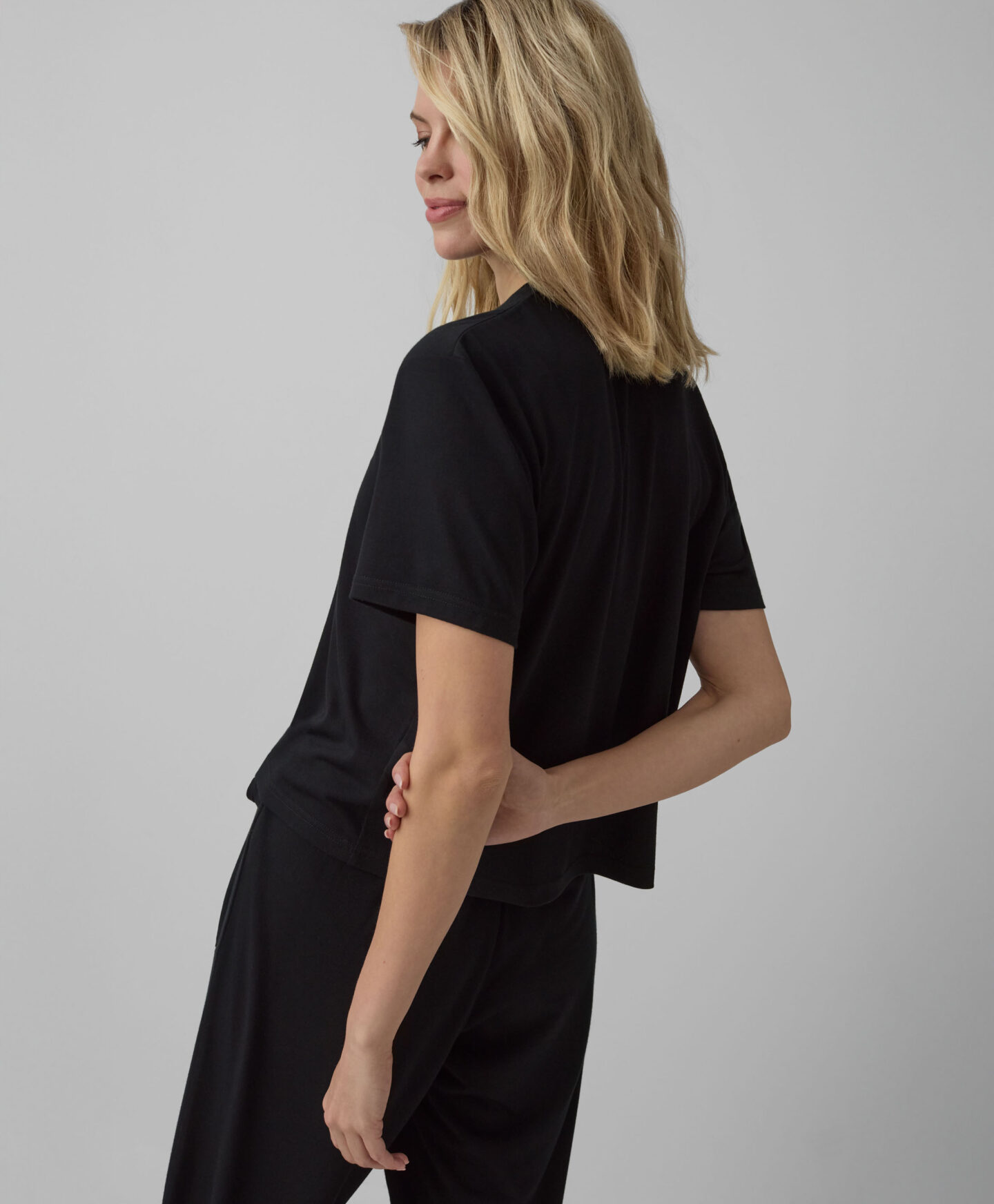 Črna majica za ženske s kratkimi rokavi skupaj s hlačami z zavezovanjem v pasu tvori komplet. Lepo pa se bo podala k večini kosov v vaši garderobi. Za to poskrbi klasičen kroj in brezčasna barva, ki nikoli ne gre iz mode. Lahkoten material z viskozo je lahek in prijeten na dotik. Majica vam bo zagotavljala celodnevno udobje. V kolekciji sta na voljo dve različici.