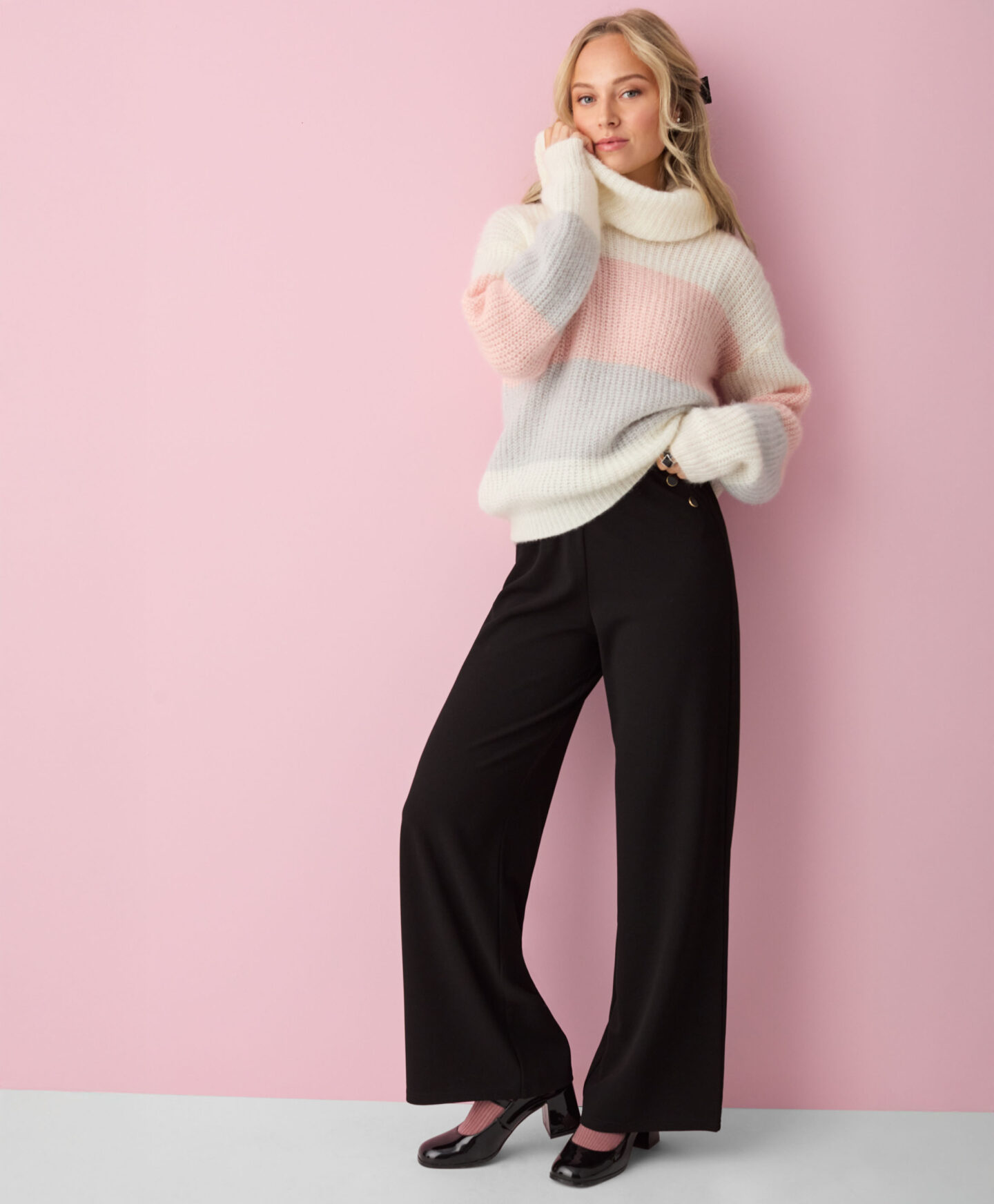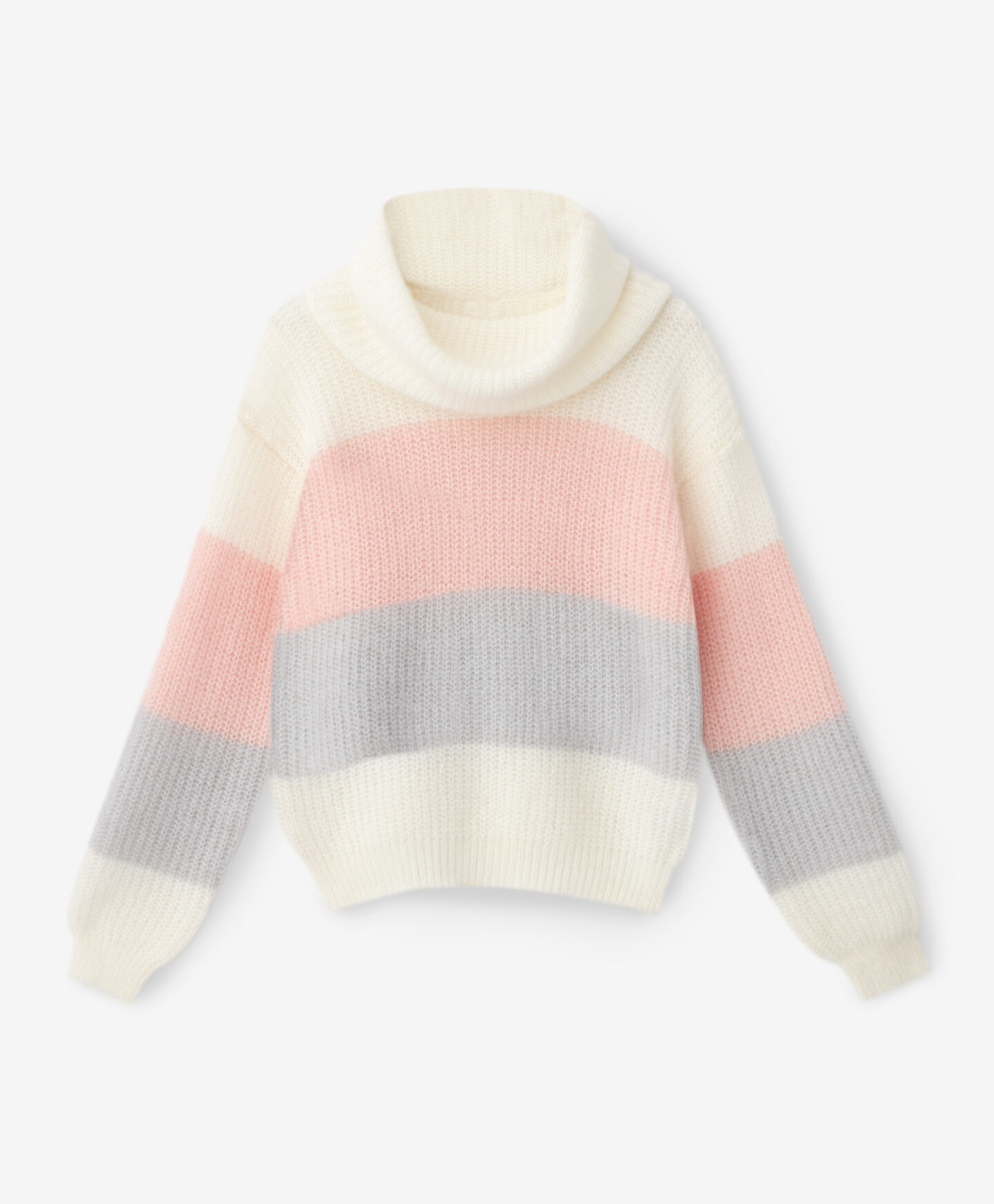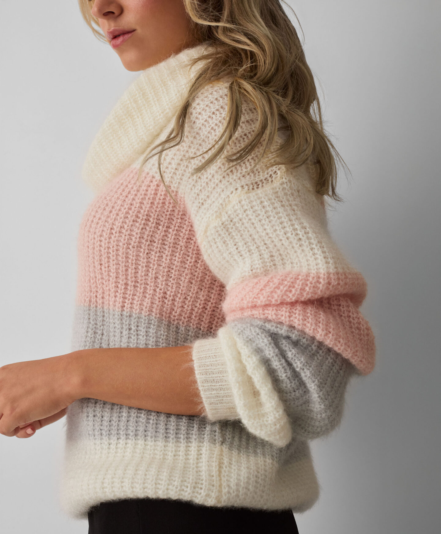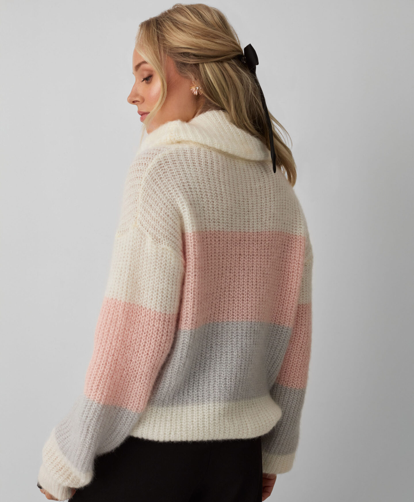 Črtast pulover z ovratnikom za ženske vas bo pogrel v hladnih dneh. Je mehek na dotik in udoben za nošenje. Široke črte v pastelnih barvah mu dodajo nežnost. Odlično bo videti v kombinaciji tako s klasičnimi kavbojkami kot tudi z elegantnimi ali športnimi hlačami.