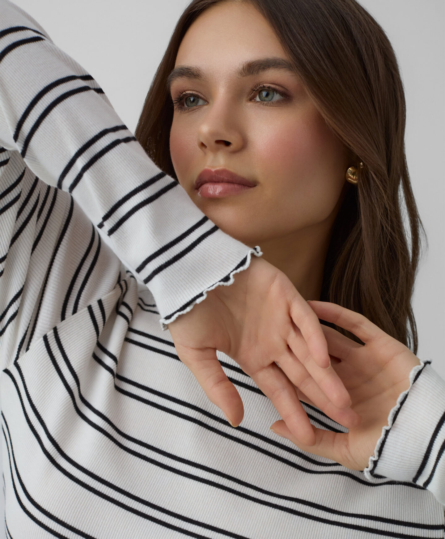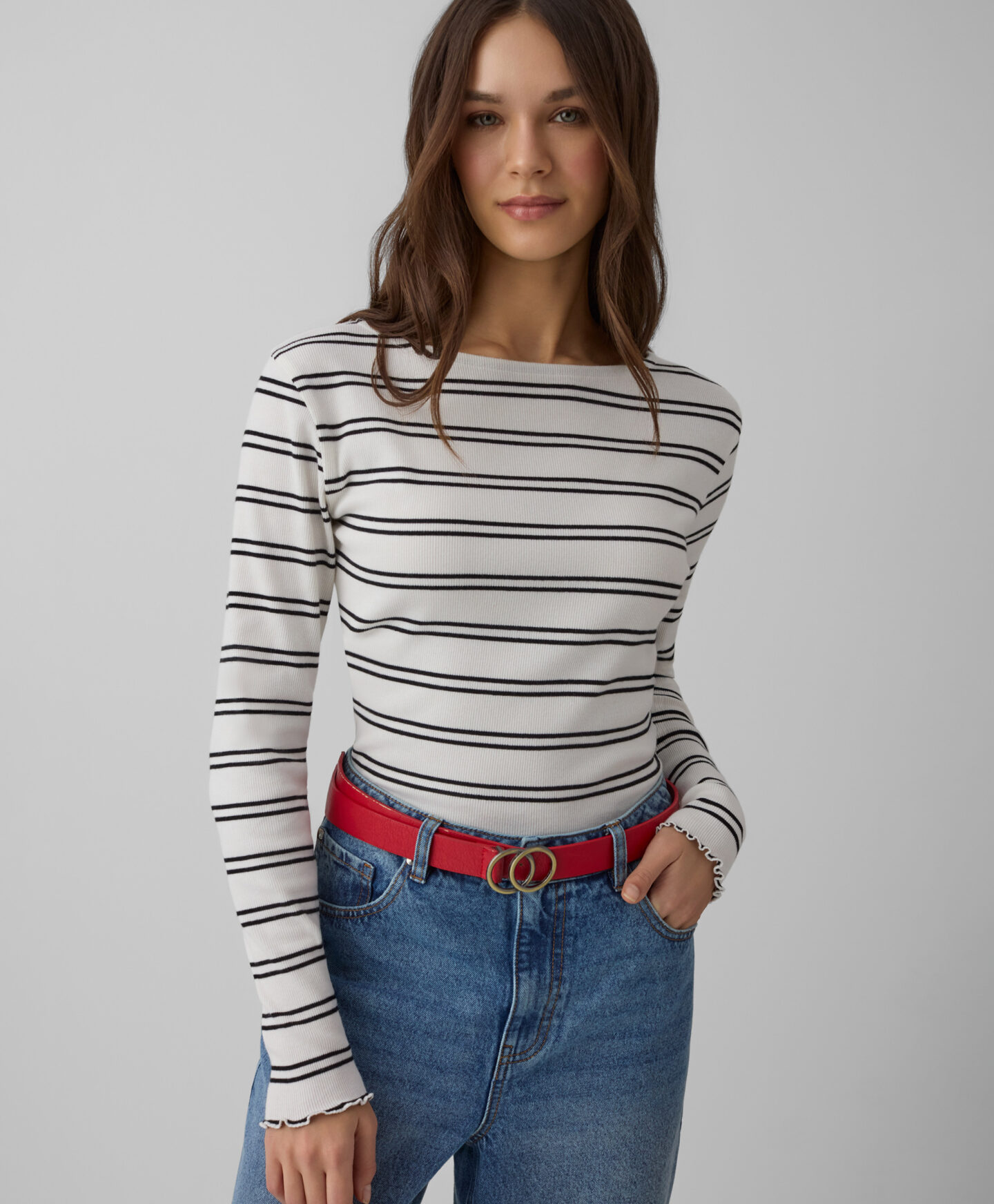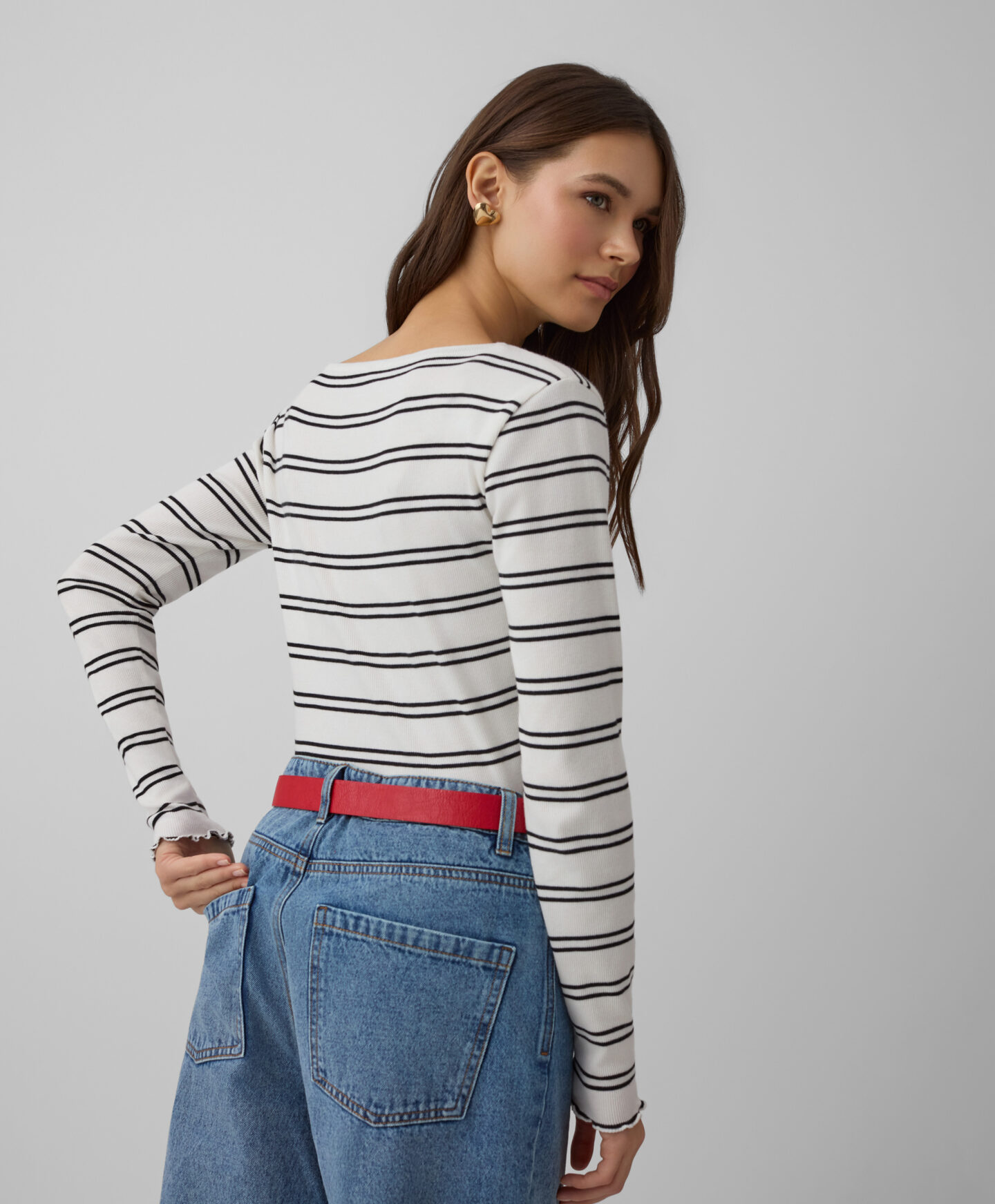Črtasta majica za ženske z visoko vsebnostjo bombaža in dodatkom elastana se popolnoma prilega postavi. Okrasni zaključek bo eleganten poudarek najrazličnejših stajlingov. Majica se odlično poda tako h kavbojkam kot elegantnim hlačam. Na voljo v dveh barvah.