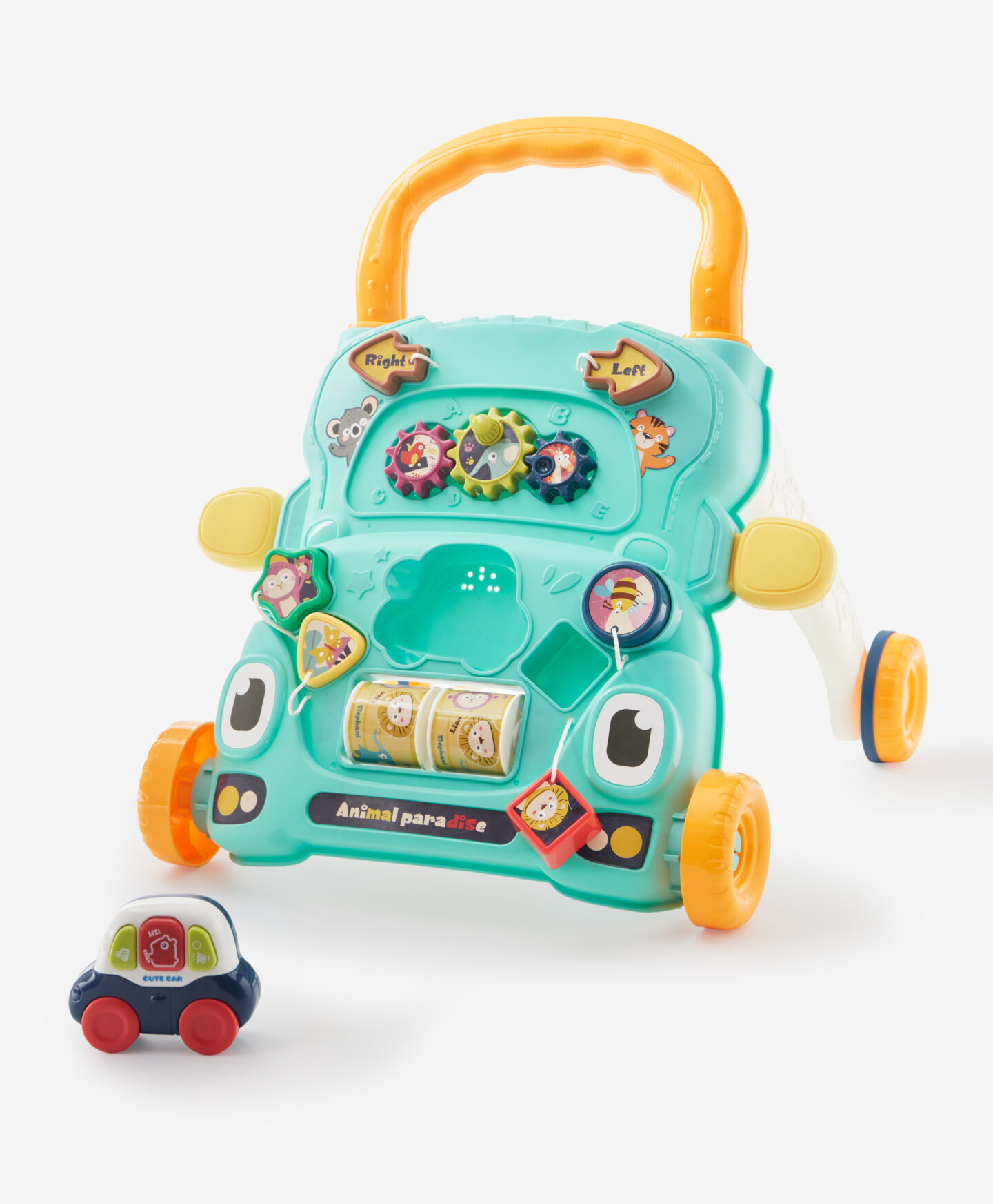 Didaktična hojica podpira otrokove prve korake, prednji del pa omogoča raznovrstvne aktivnosti. Pisani elementi spodbujajo premikanje in vrtenje, kar pomaga pri razvoju spretnosti in koordinacije. Zaradi stabilne konstrukcije igralnik zagotavlja varnost in spodbuja gibanje. Baterije so naprodaj posebej.