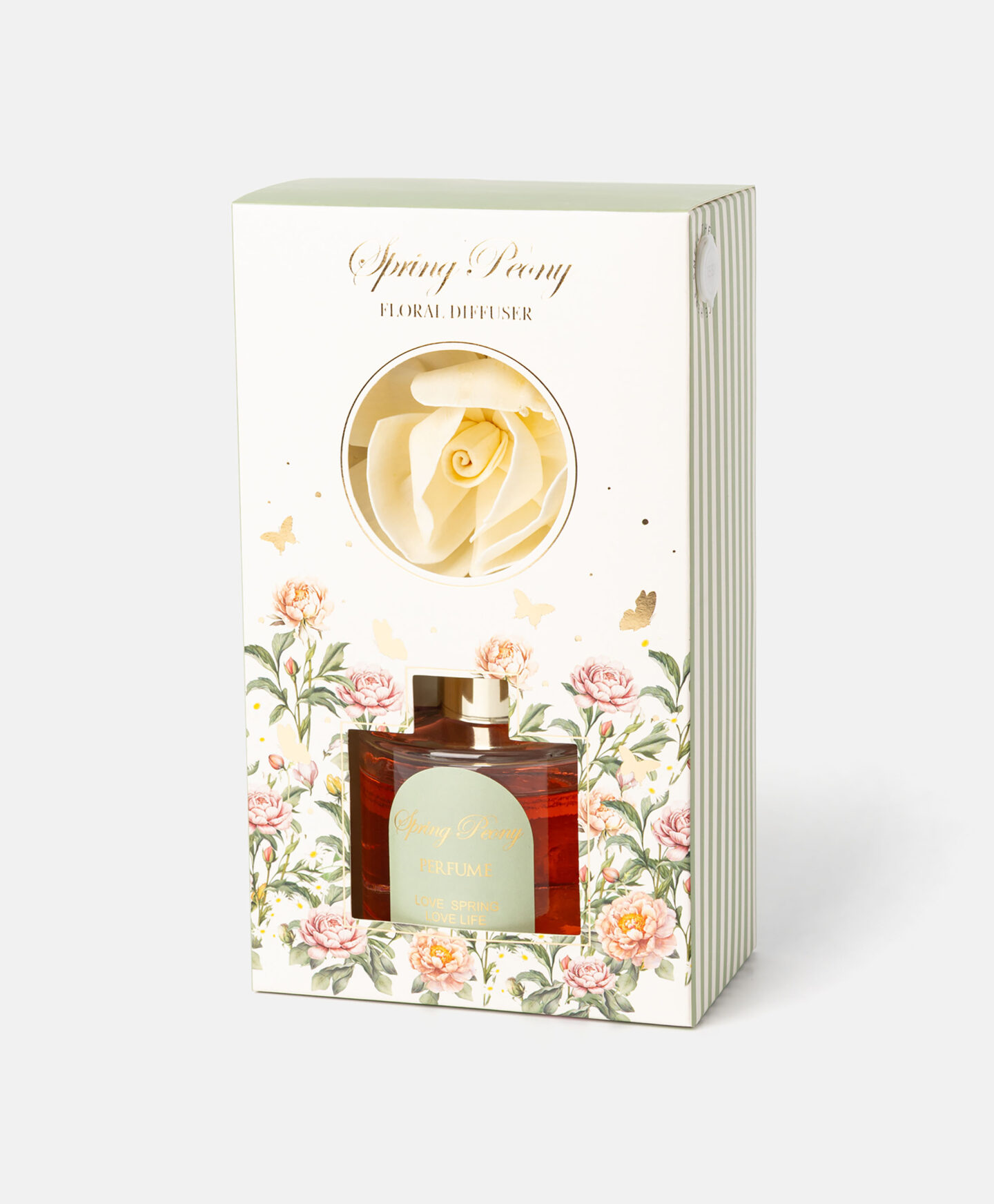 Difuzor dišav s cvetličnim motivom razveseli oči in nos. Elegantna embalaža spominja na stekleničko parfuma. Lahko ga postavite na okrasni pladenj ali leseno površino mize ali komode, od koder bo širil prijeten vonj. Zaradi izvirnega dizajna je difuzor odlična ideja za darilo.