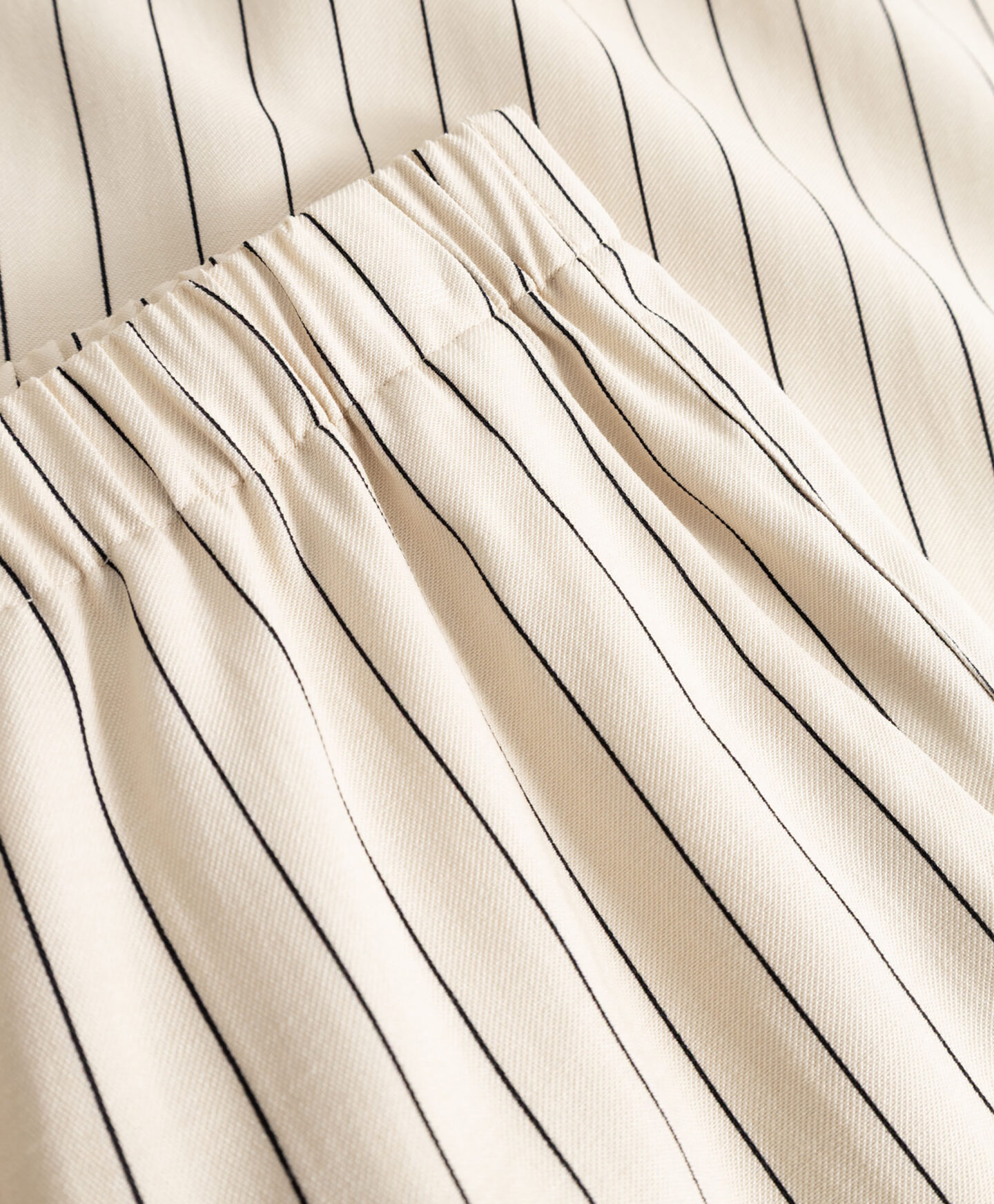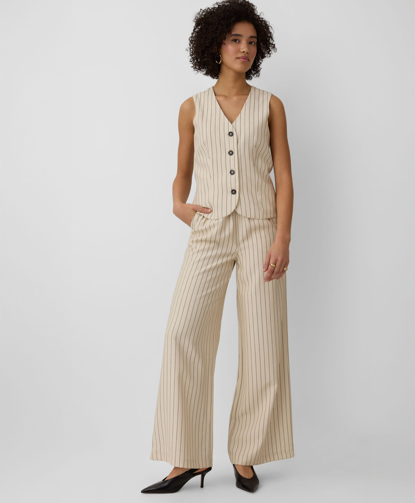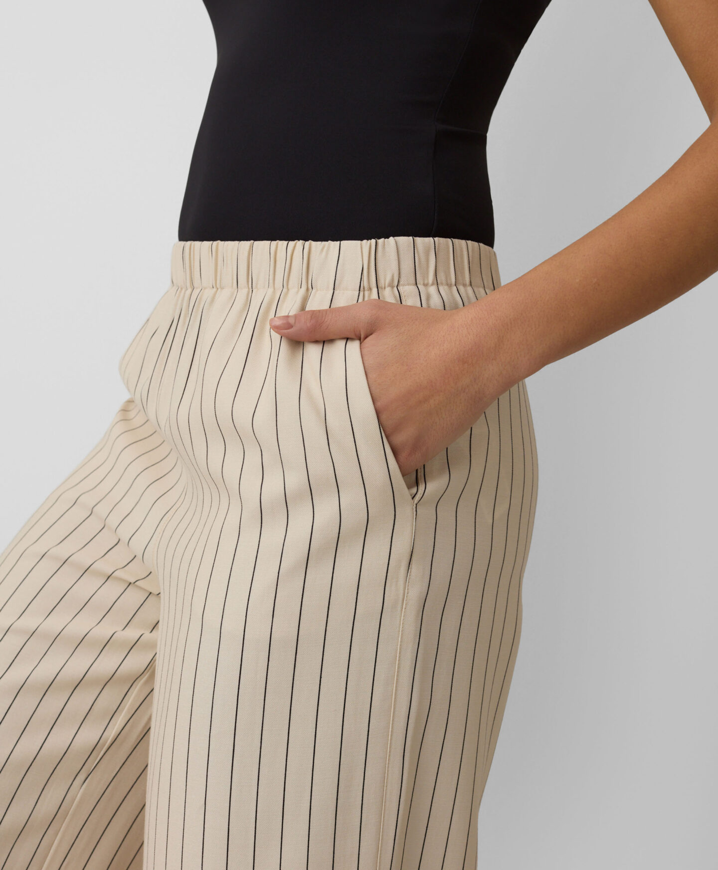 Črtaste hlače za ženske lahko kombinirate s telovnikom z istim vzorcem. Zaradi visoke vsebnosti viskoze so lahke, zračne in lepo padejo. Zaradi nevtralnih barv jih lahko enostavno kombinirate z enobarvnimi zgornjimi deli, od bluz do elegantnih srajc.