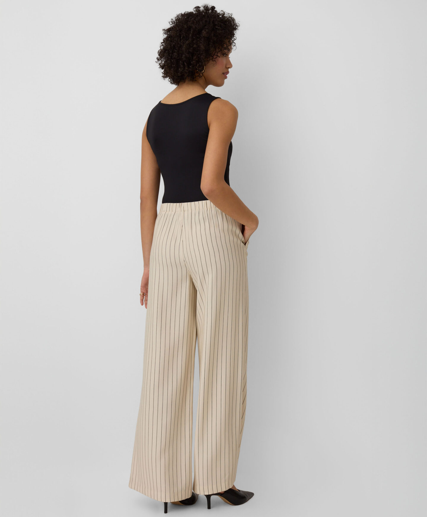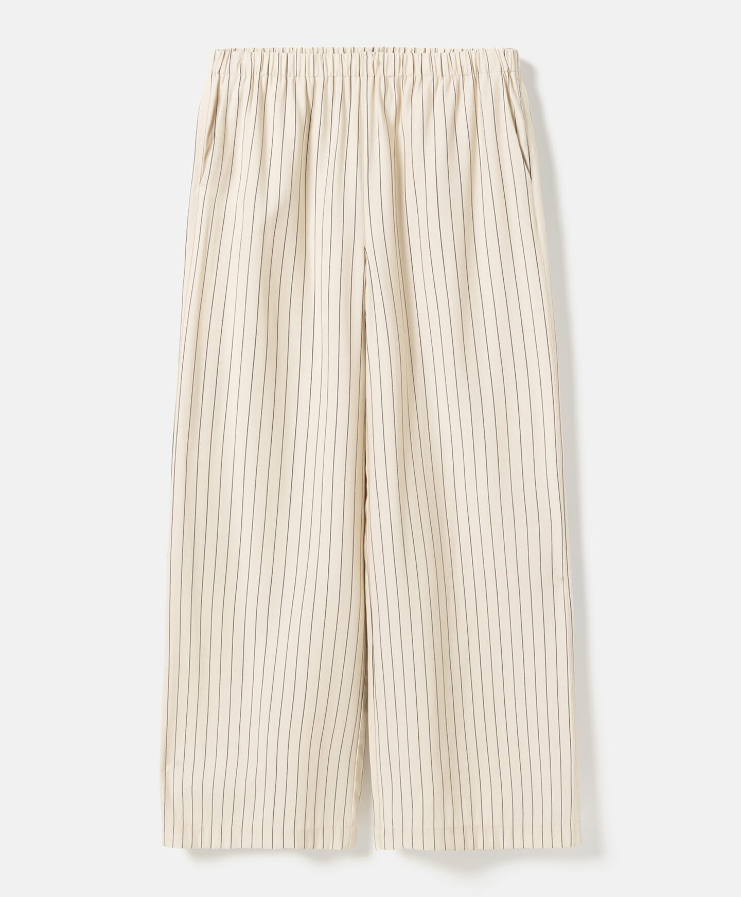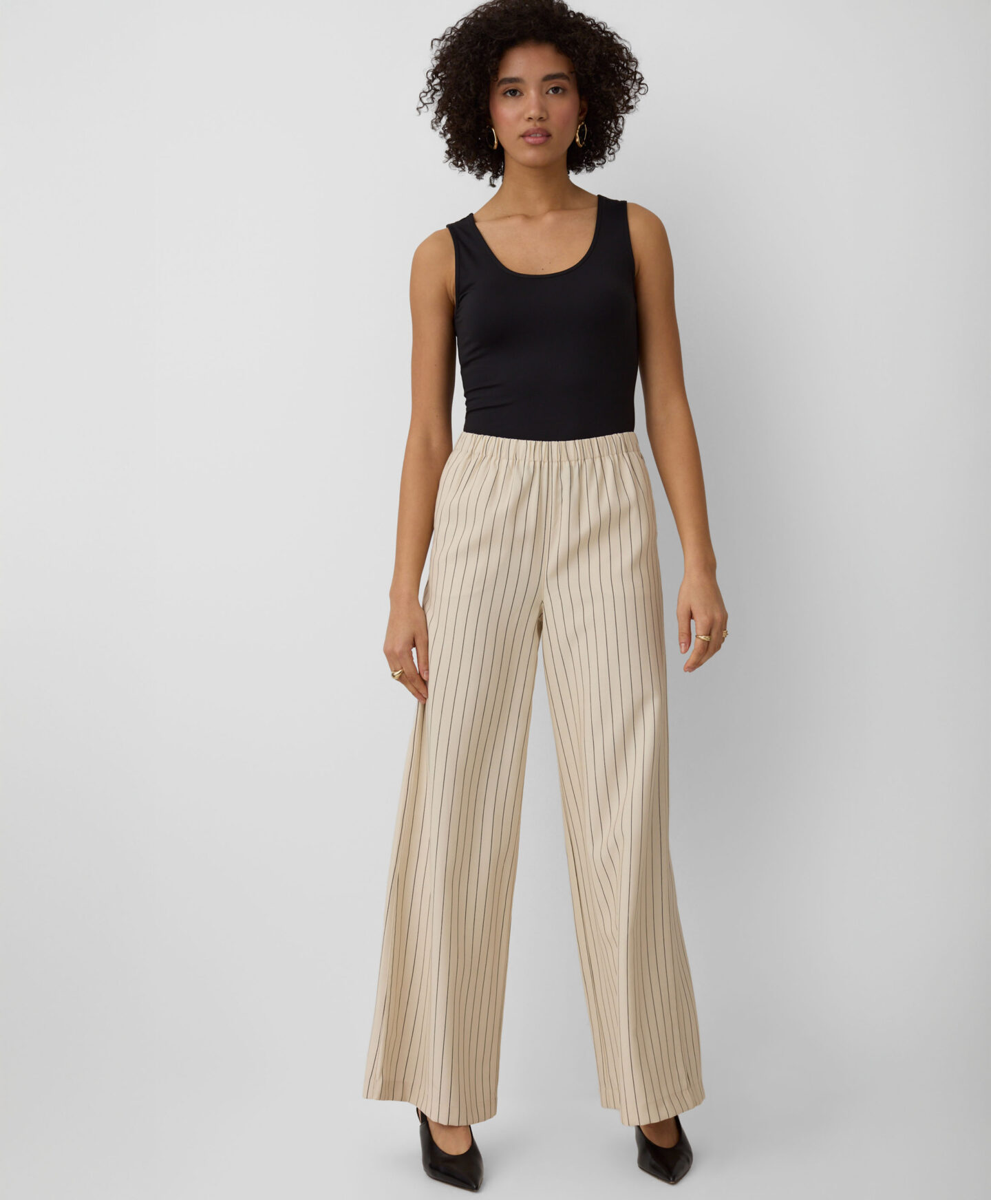 Črtaste hlače za ženske lahko kombinirate s telovnikom z istim vzorcem. Zaradi visoke vsebnosti viskoze so lahke, zračne in lepo padejo. Zaradi nevtralnih barv jih lahko enostavno kombinirate z enobarvnimi zgornjimi deli, od bluz do elegantnih srajc.