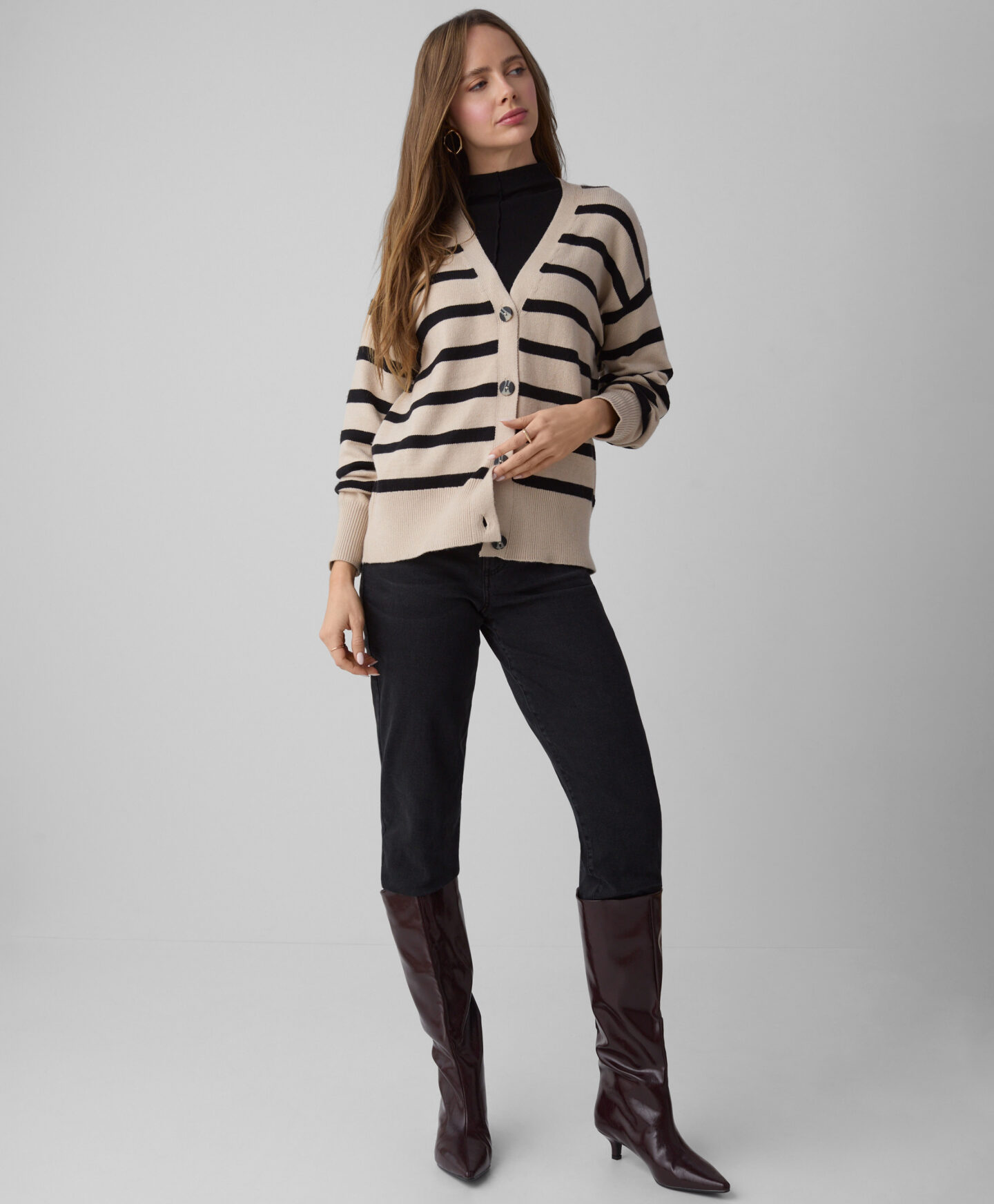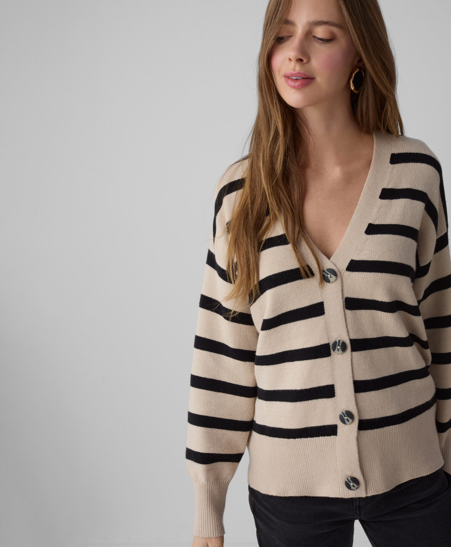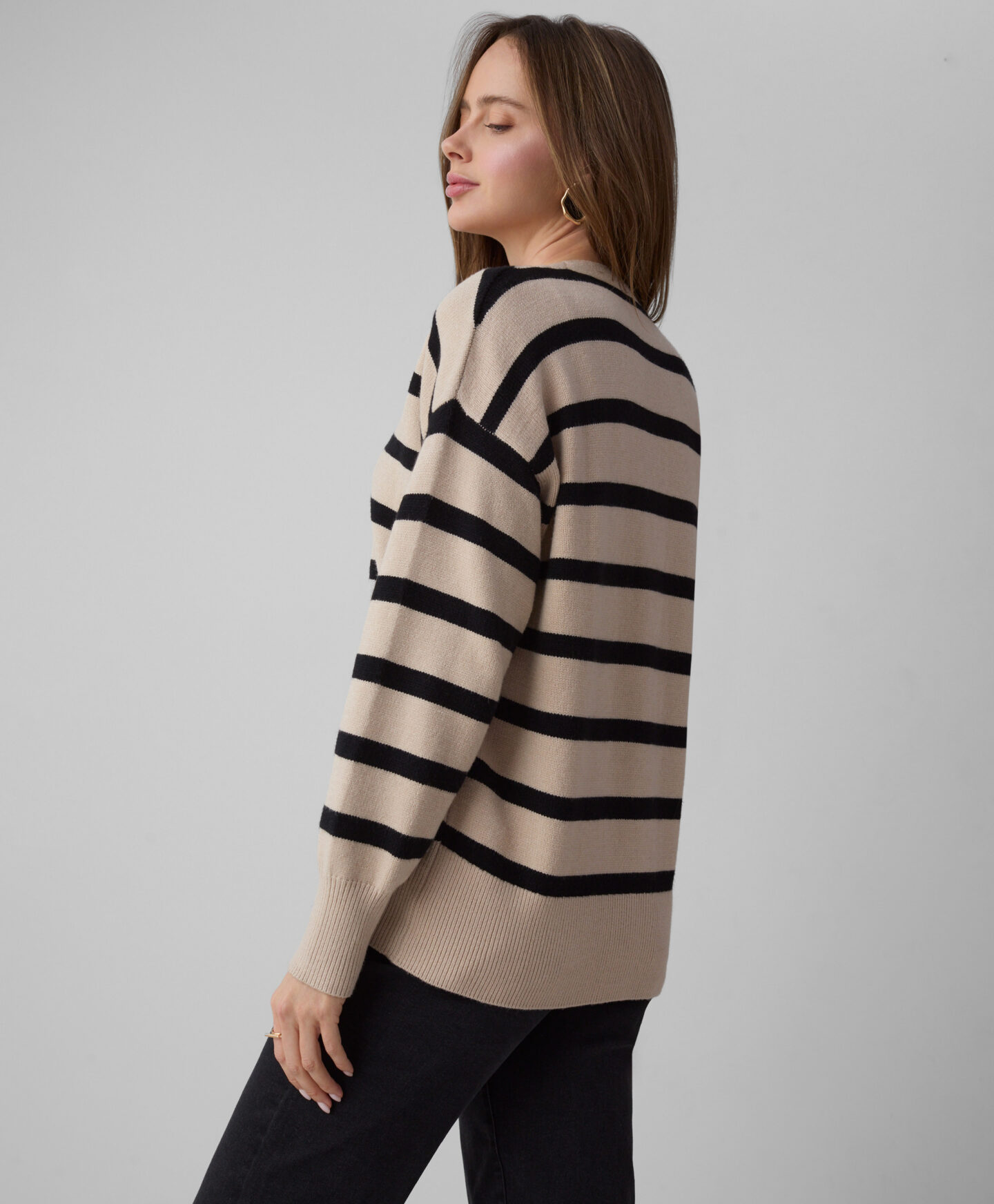 Jopica za ženske s črnimi in bež črtami z ohlapnim krojem je popolna za ljubiteljice klasičnega sloga in hkrati udobja. Črtast vzorec nikoli ne gre iz mode in je videti odlično v kombinaciji tako z elegantnimi hlačami kot s klasičnimi kavbojkami. Mehak material iz viskoze nežno objame kožo in nudi toploto v hladnih zimskih dneh. Na voljo sta dve barvni različici.