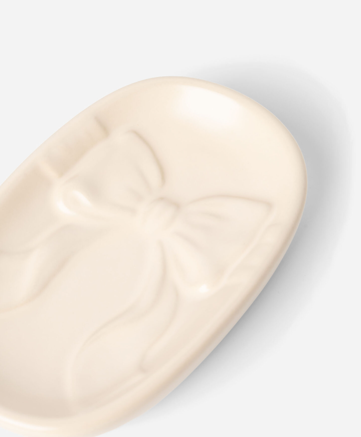 Keramična posoda za milo s pentljo je popolna za ljubitelje trdih mil. Zaradi okrasne pentlje se popolnoma ujema z drugimi kopalniškimi dodatki iz kolekcije. Premišljena oblika pomaga pri učinkovitem odtekanju vode, preprečuje nered in ohranja milo čisto.