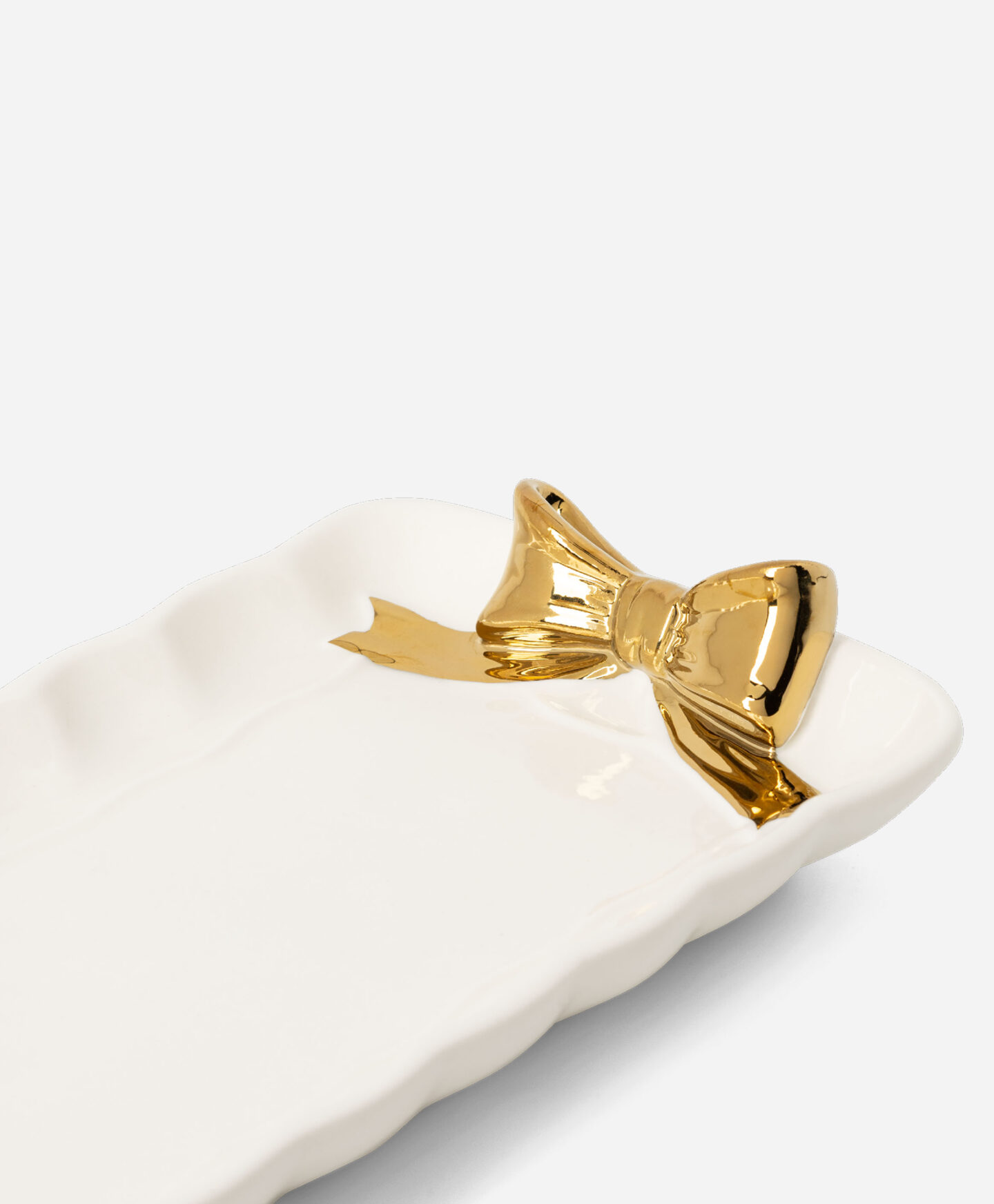 Keramični krožnik za pecivo z okrasnimi zlatimi pentljami je sinonim za eleganco in stil. Izdelan je iz trpežne kamenine, zato ni samo enostaven za čiščenje, temveč tudi čudovit dekorativni element omizja. Sijoč finiš odbija svetlobo, zaradi česar bo krožnik predstavljal središče omizja. Kot nalašč je za postrežbo peciva, sadja ali prigrizkov za goste.