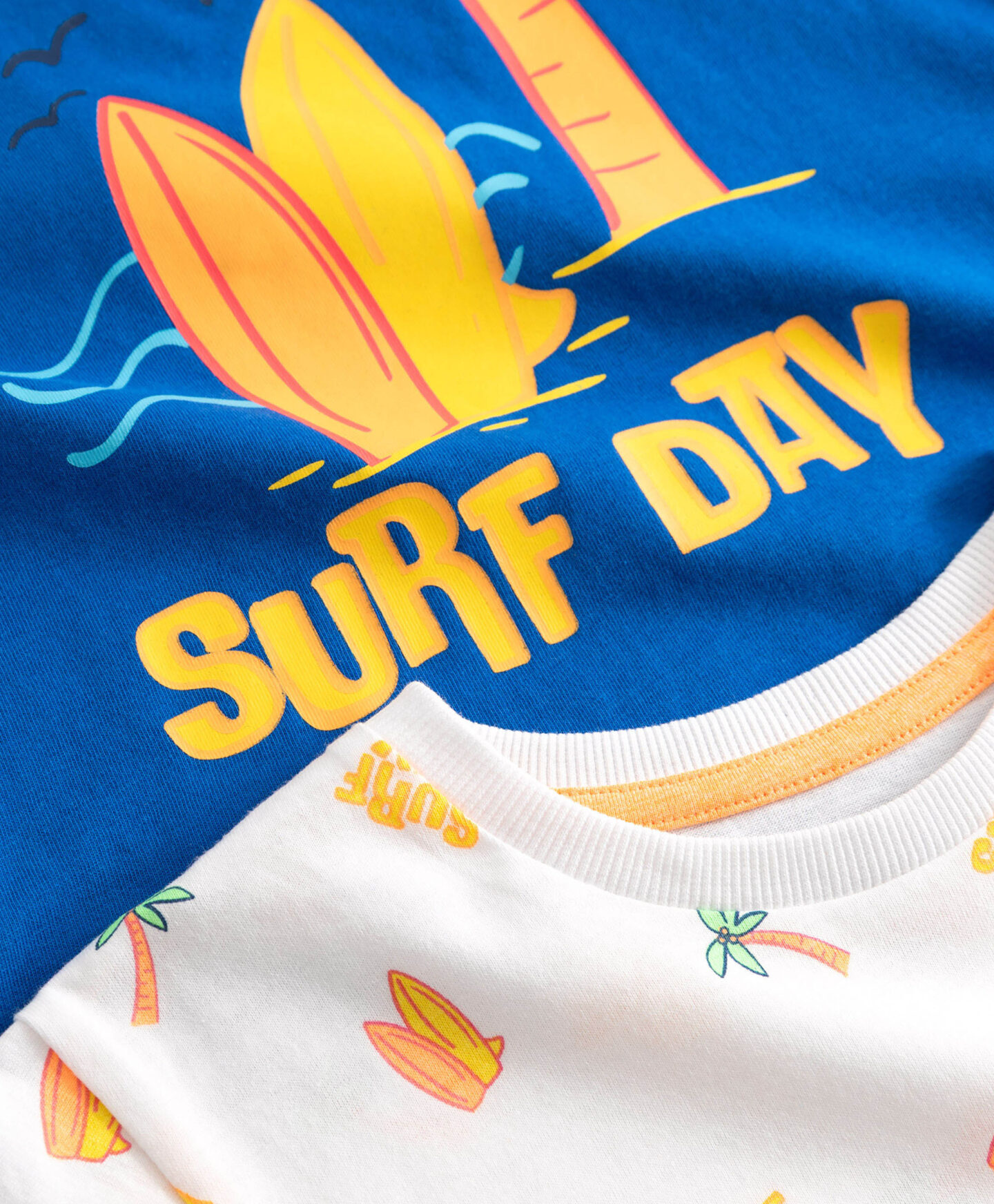 Komplet 2 majic za dojenčke iz 100% bombaža združuje udobje z najbolj modnimi poletnimi barvami. Ustvarjen je bil z mislijo na nežno otroško kožo, zato zagotavlja udobje, ki ga vaš malček potrebuje med igro in raziskovanjem sveta. Komplet vključuje dve različni majici.