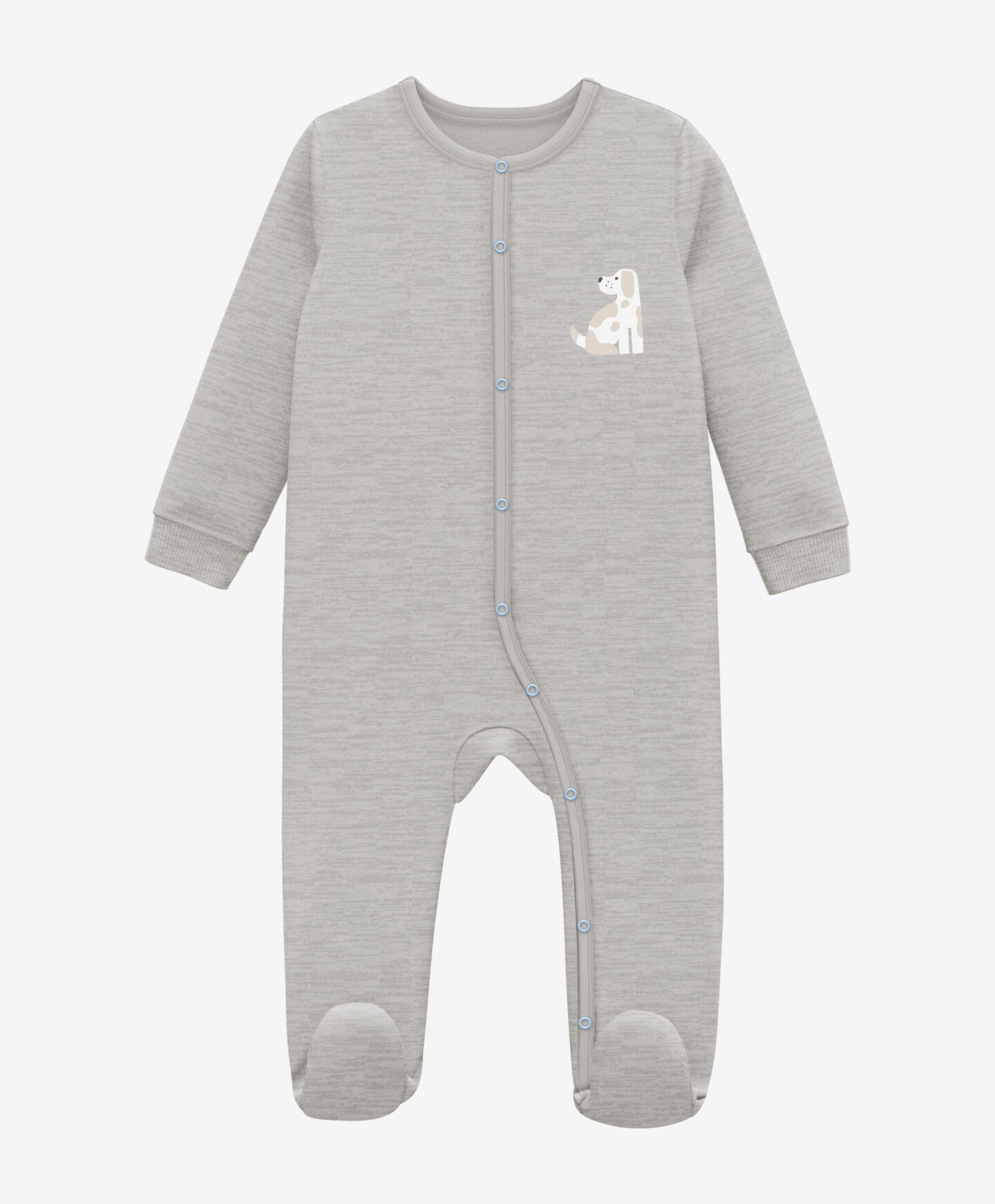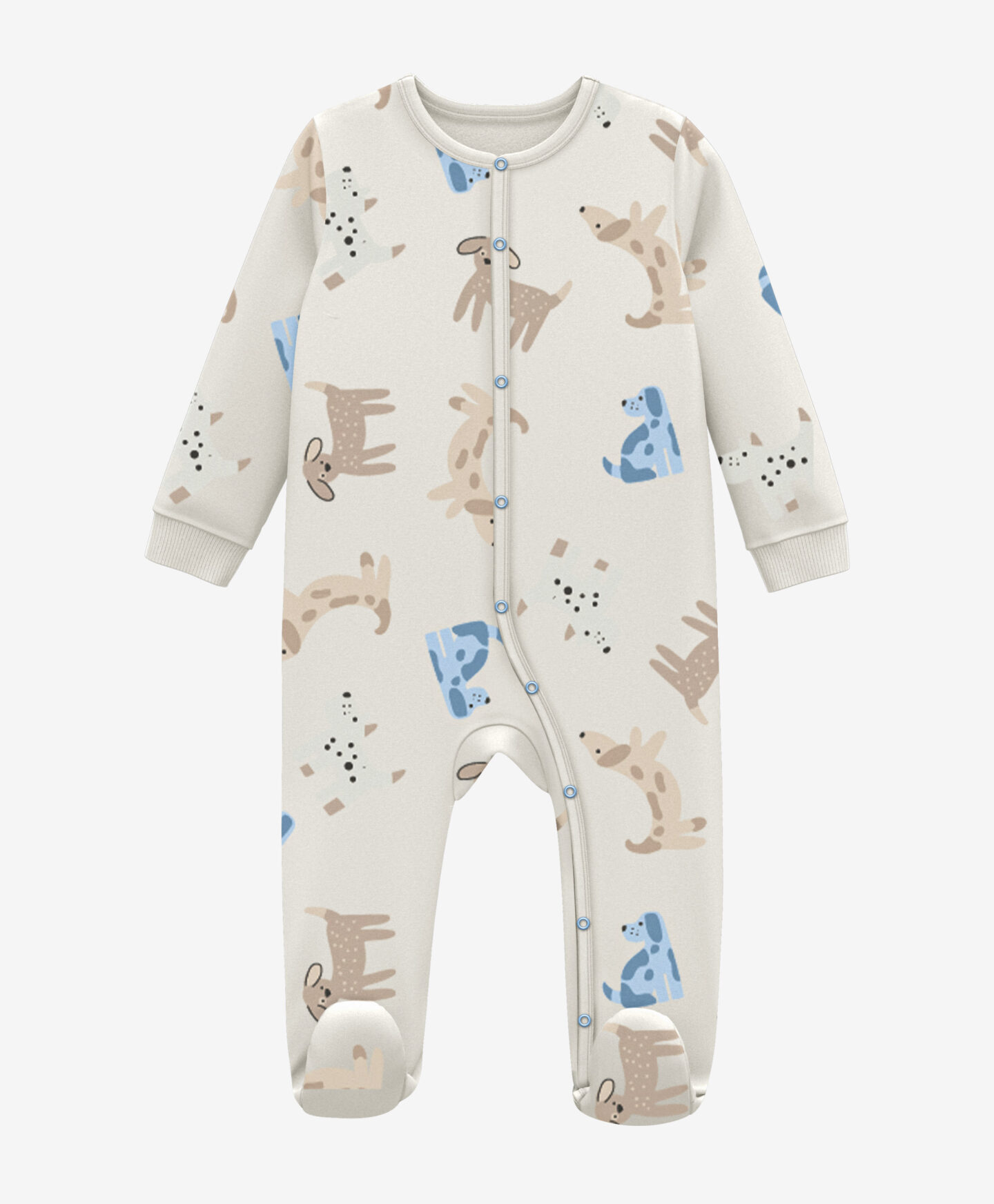 Komplet 2 pajacev za dojenčke iz 100 % bombaža je popolna izbira za nežno dojenčkovo kožo. Pajaca sta v celoti narejena iz bombaža, zato zagotavljata udobje med igro in spanjem. Praktično zapenjanje na pritiskače po vsej dolžini je nadvse praktično in omogoča hitro ter enostavno preoblačenje in menjavo plenic. Motivi psičkov kompletu dajejo čar in igriv značaj. Na voljo so tudi drugi motivi.