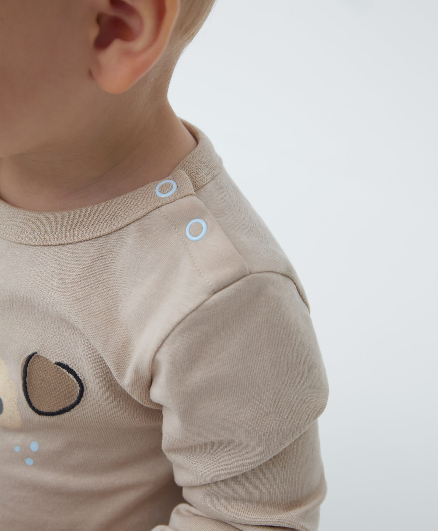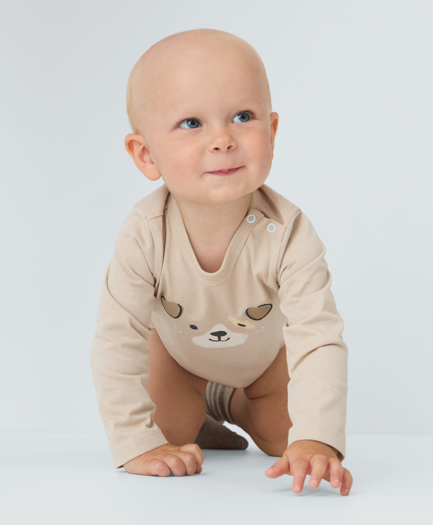 Komplet 3 bodijev za dojenčke iz 100% bombaža z motivom psičkov je ustvarjen za male pasje ljubitelje. Bodiji so izdelani iz naravnih vlaken, zato so mehki, lahki in udobni za nošenje. Praktično zapenjanje na pritiskače omogoča hitro oblačenje in menjavo plenic. Motivi psičkov bodo otroški garderobi dodali igriv značaj. Na voljo so tudi drugi motivi.
