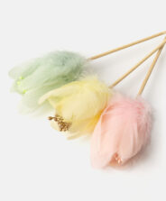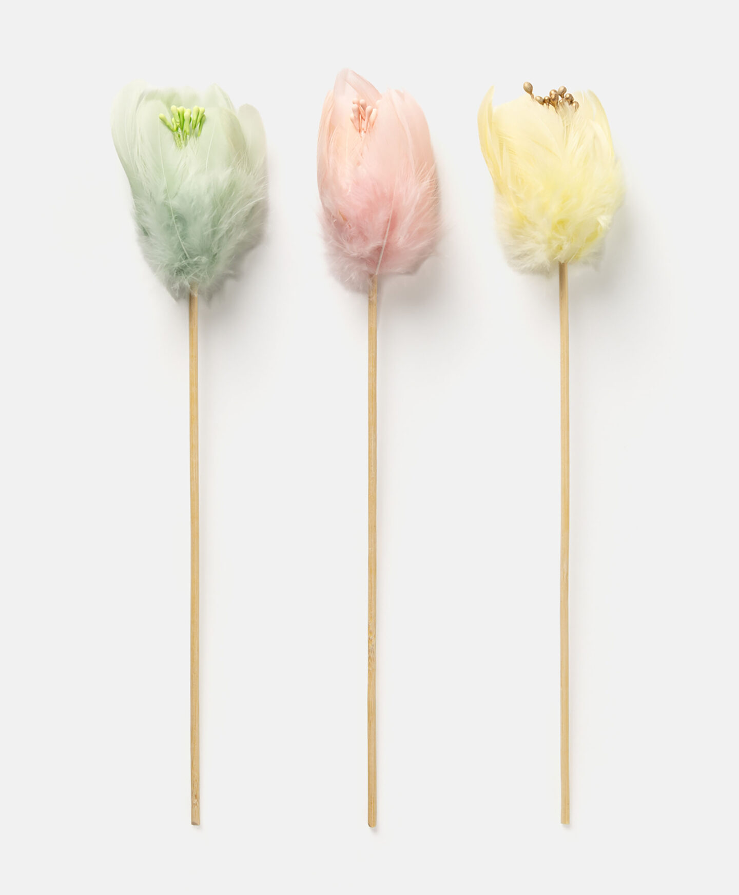 Komplet 3 cvetov s perjem na leseni palčki bo dodal čar in velikonočni pridih vsakemu cvetličnemu aranžmaju ali namizni dekoraciji. Cvetlice lahko postavite tudi v velikonočno košarico ali okrasni lonček s sobno rastlino. Pastelne barve pritegnejo oko, perje pa doda dekorativni pridih in kanček lahkotnosti.
