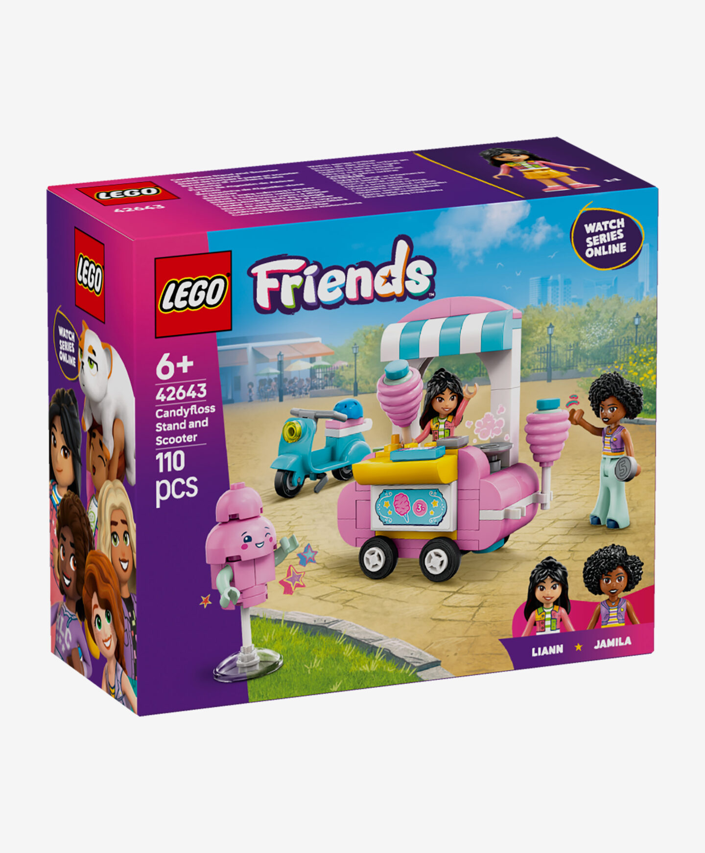 Komplet LEGO® Friends Stojnica s sladkorno peno in skuter omogoča uprizoritev zabave v mestu. Barvit voziček in figure likov igri dodajo realističnost, s skuterjem pa se otroci odpravijo na nove dogodivščine.