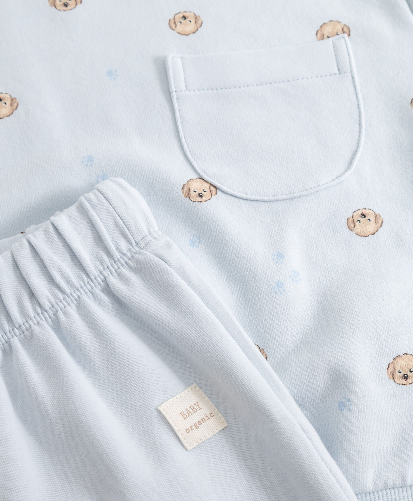 Komplet za dojenčke vključuje spodnji in zgornji del trenirke z motivom kužkov. Nežna modra barva bo odlično dopolnila dojenčkovo garderobo. Tako zgornji kot spodnji del trenirke imata elastične manšete, ki otroku zagotavljajo toploto in udobje. Mehak material z visoko vsebnostjo bombaža je kot nalašč za nošenje že od prvih dni življenja.