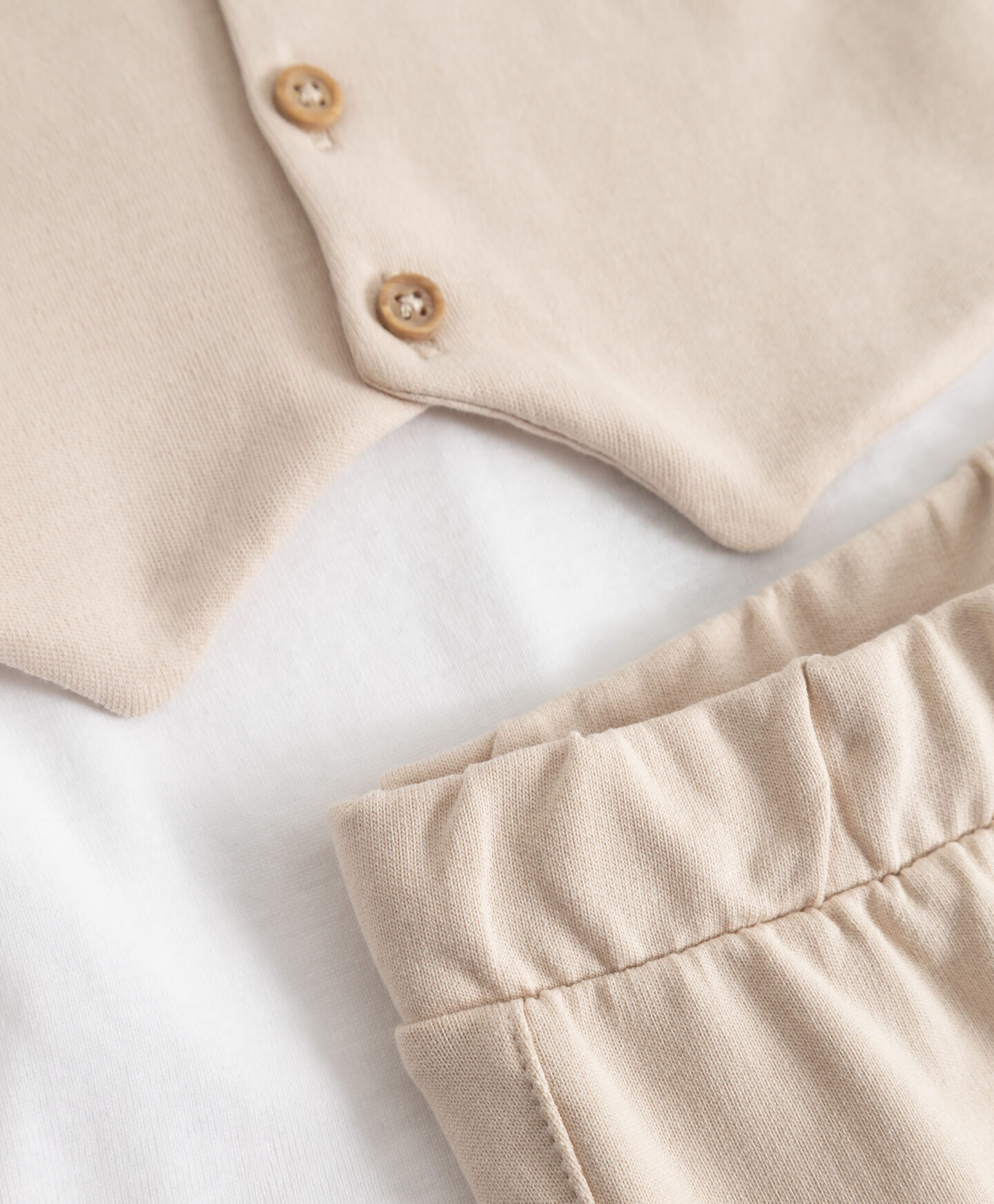 Komplet za dojenčke vključuje bodi s telovnikom in hlače. Gre za popoln komplet za posebne priložnosti. Nežen material je koži prijazen in zagotavlja udobje ter svobodo gibanja. Gumbi med nogami olajšajo oblačenje bodija in menjavo plenic. Hlače z elastičnim pasom se popolnoma prilegajo trebuščku.