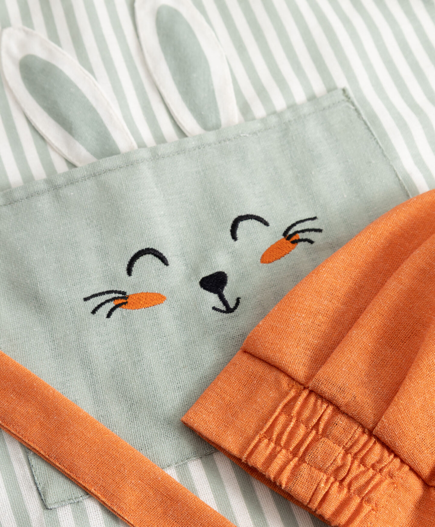 Kuhinjski predpasnik z zajčkom zagotavlja nasmehe do ušes med skupno pripravo najljubših jedi. Pomladni vzorec zajčka spodbuja otroke k pomoči v kuhinji, zapiranje na ježka in zavezovanje pa zagotavljata popolno prileganje. Predpasnik je udoben, lahek in odporen na pogosto pranje. Priložena kapica dopolnjuje kuharsko opravo.