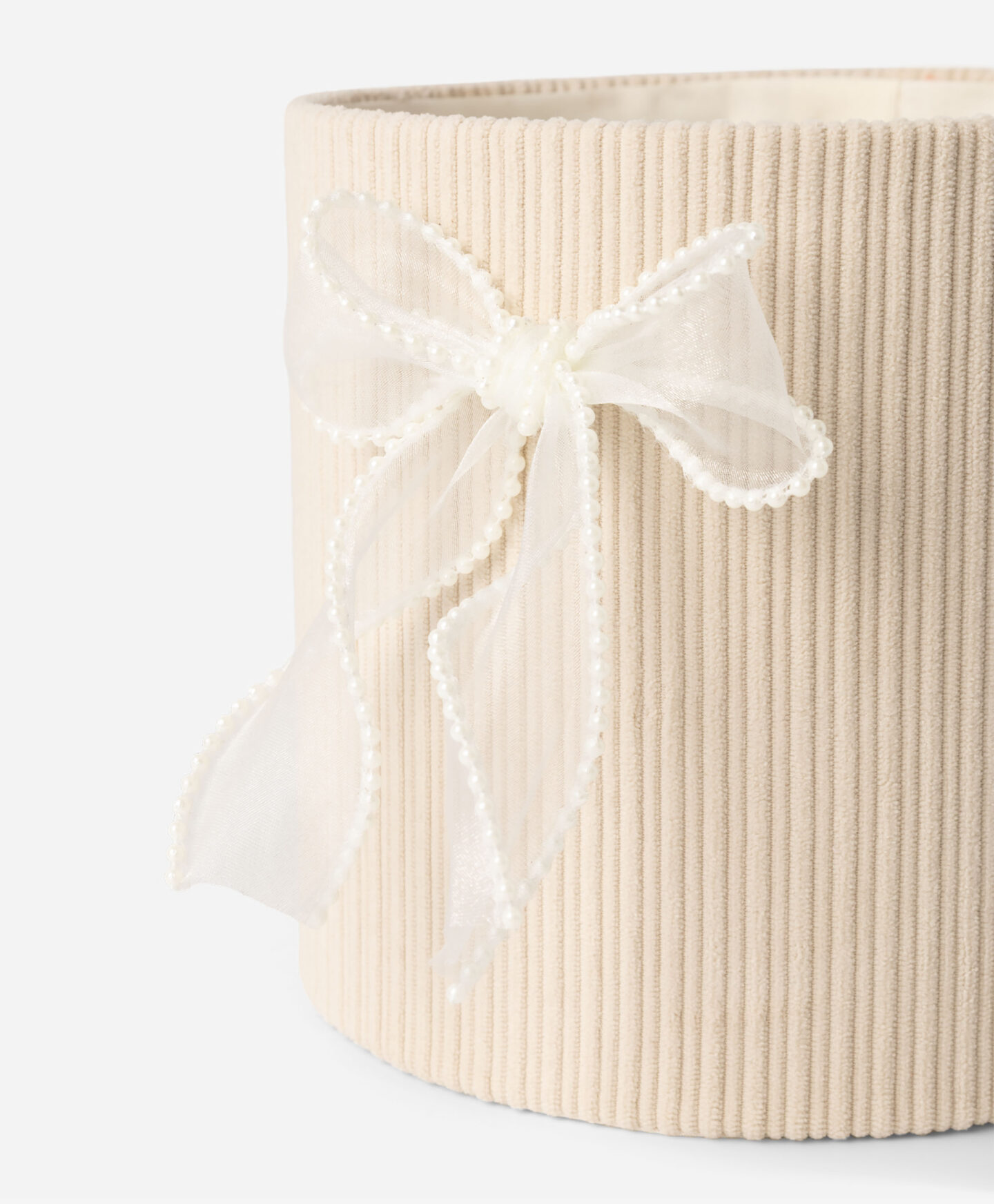 Majhna okrogla škatla s pentljo služi kot subtilna dekoracija prav vsakega prostora. Popolna je za shranjevanje malenkosti, kot so nakit, ključi ali druge drobnarije. Ker nima pokrova, omogoča hiter dostop do njene vsebine. Zaradi elegantnega dizajna jo lahko postavite tako na nočno omarico v spalnici kot na pisalno mizo v pisarni.