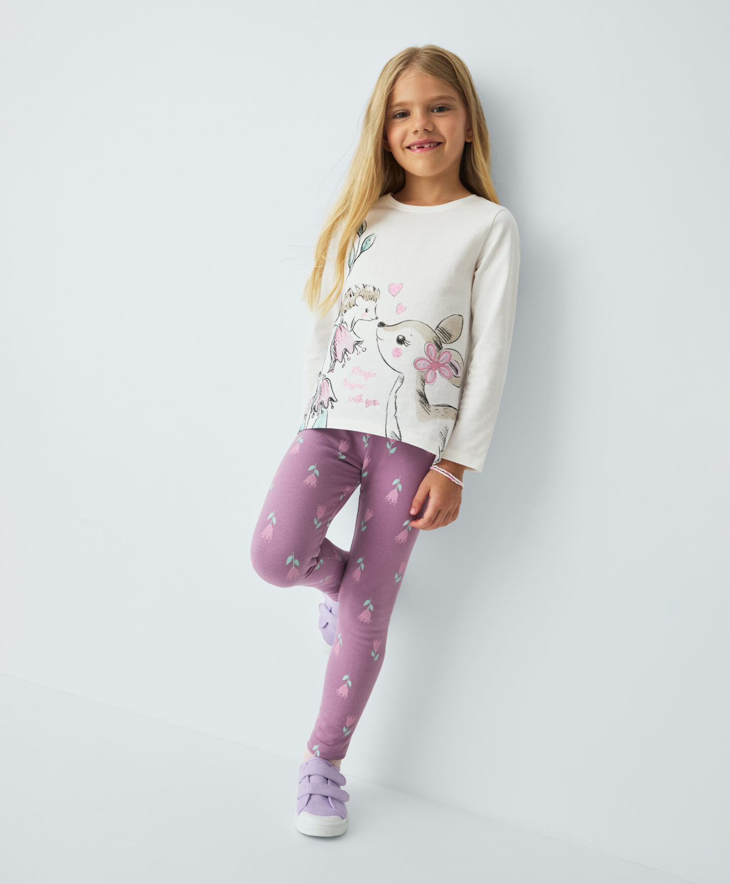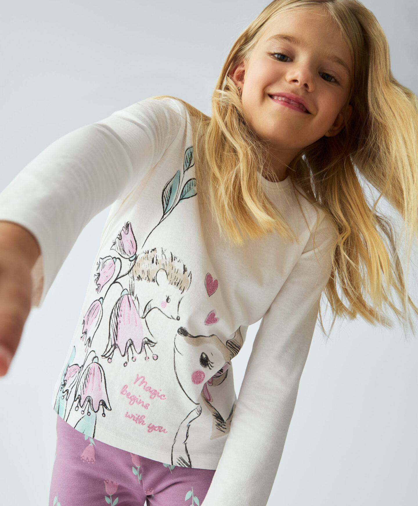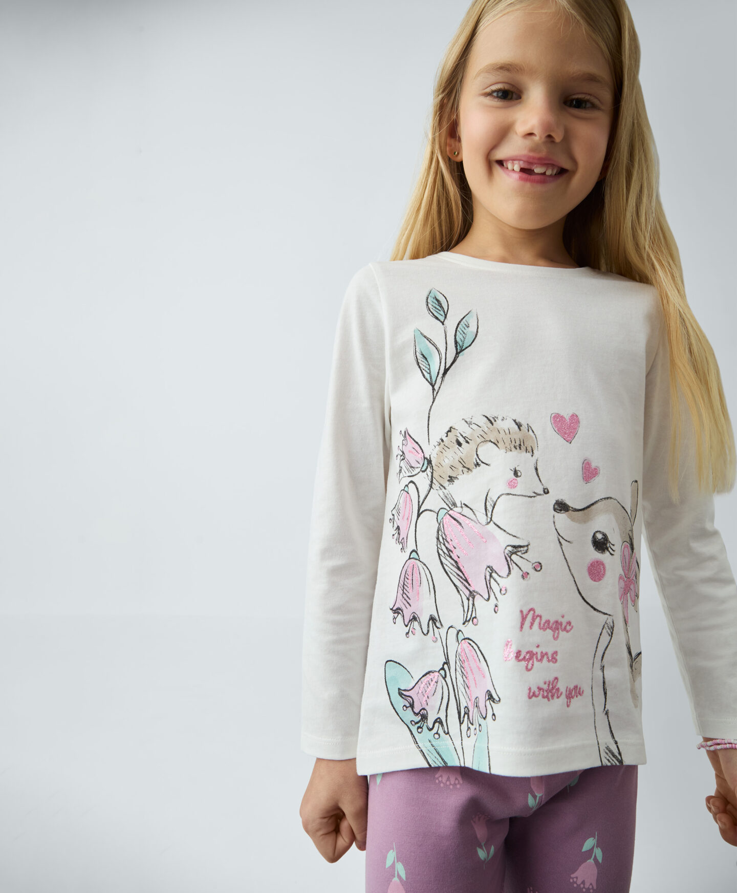 Majica za deklice iz 100% bombaža ima dolge rokave in čudovit potisk na sprednji strani. Popolnoma se prilega k pajkicam iz iste kolekcije. Primerna je za v vrtec, šolo ali za prosti čas. Mehak material nežno ovije otrokovo kožo in zagotovi toploto ob prvih jesenskih hladnih dneh. Nežna barva bo služila kot osnova za številne lepe stajlinge.