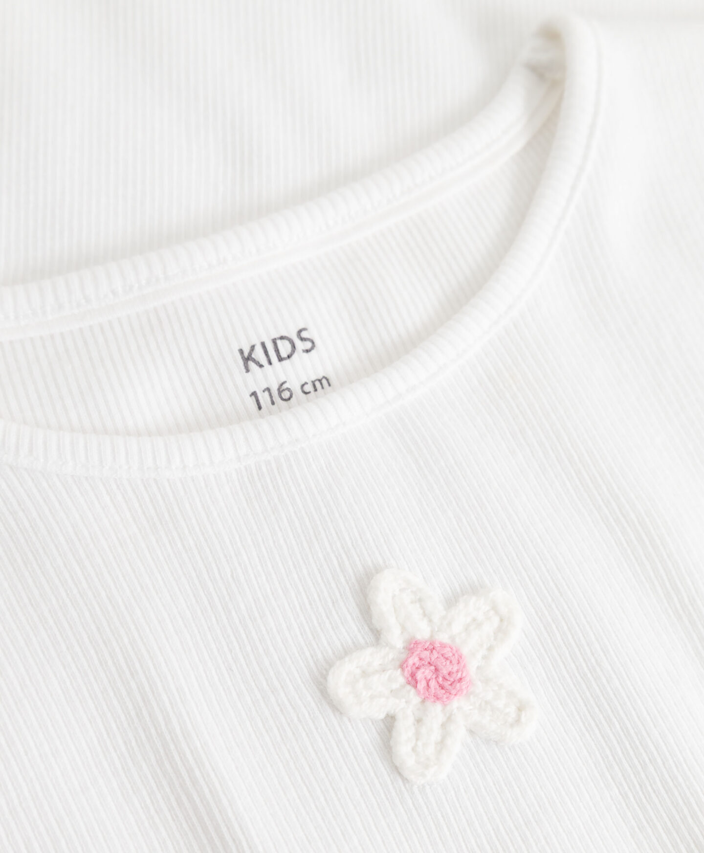 Rebrasta majica za deklice z našitkom cvetlice je očarljiva izbira za mlade dame. Visoka vsebnost bombaža zagotavlja udobje, dodatek elastana pa popolno prileganje. Majica se odlično ujema s kavbojkami, pajkicami ali športnimi hlačami. Ustvarjena je bila za vsakodnevne pustolovščine, zato ne omejuje gibanja med igro na igrišču ali kolesarjenjem. Popolna je za vsako priložnost.