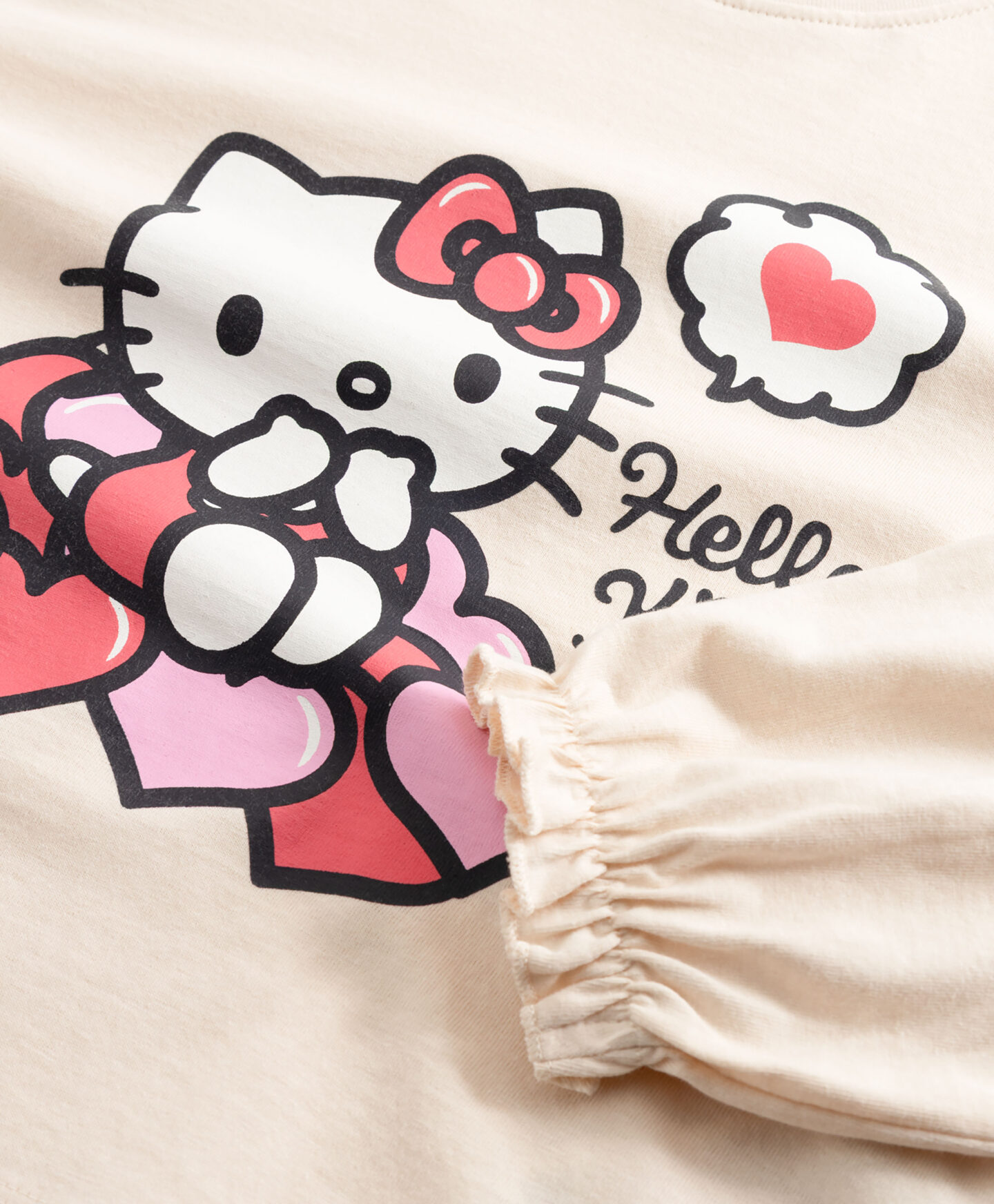 Majica za deklice Hello Kitty z dolgimi rokavi iz 100% bombaža zagotavlja toplino in udobje. Čudovita aplikacija na sprednji strani z motivom priljubljene risane junakinje bo vsaki opravi dodala kanček barvitosti. Kot nalašč za vrtec, šolo ali za igro v prostem času.