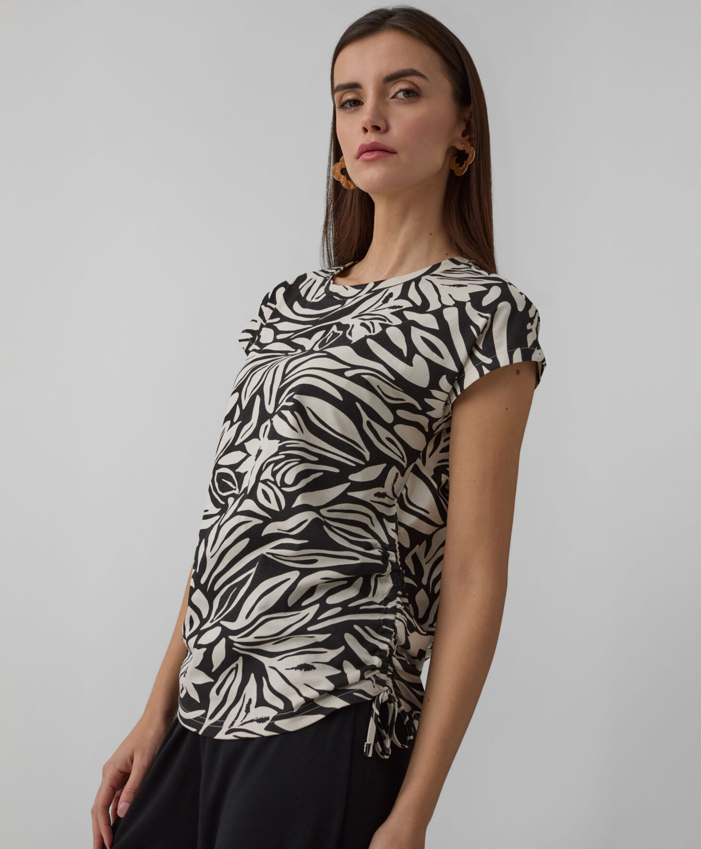 Majica za ženske iz 100% bombaža je nepogrešljiv kos vsake garderobe. Zavezovanje na sprednji strani je moden element, ki vsakemu outfitu doda ženstvenost in edinstven značaj. Mehka, zračna tkanina zagotavlja celodnevno udobje v vseh letnih časih. Majica se čudovito poda tako h kavbojkam kot tudi bolj elegantnim kosom, na primer elegantnim hlačam in krilom.