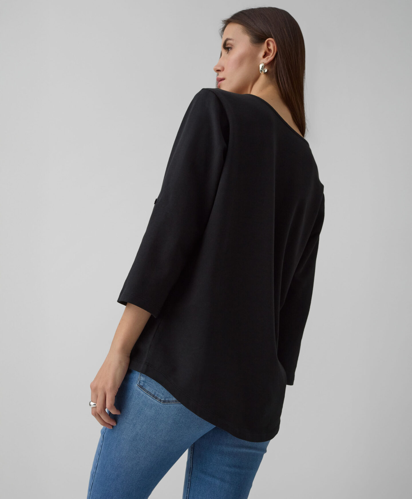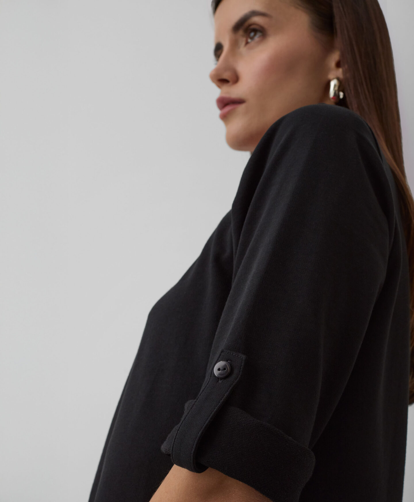 Majica za ženske z zaobljenim krojem in zavihanimi rokavi je klasičen kos s posebnim značajem. Univerzalna črna barva in mehek material z visoko vsebnostjo bombaža bosta poskrbela, da bo majica postala vaša najljubša izbira! Odlično bo videti v kombinaciji z najljubšimi kavbojkami, pa tudi elegantnimi ali bolj športnimi hlačami. Izberete jo lahko za vikend sprehod v kombinaciji z brezrokavnikom, za v pisarno pod suknjičem, pa tudi v kombinaciji z udobnimi kosi za doma.