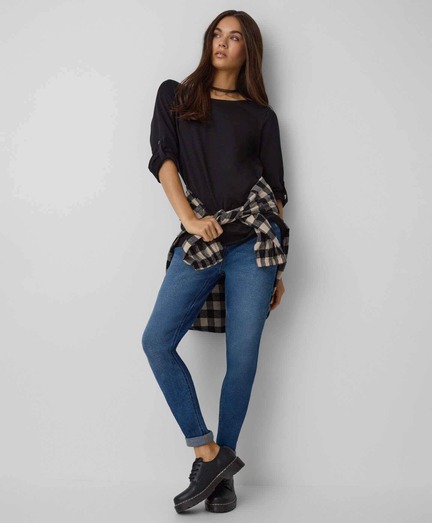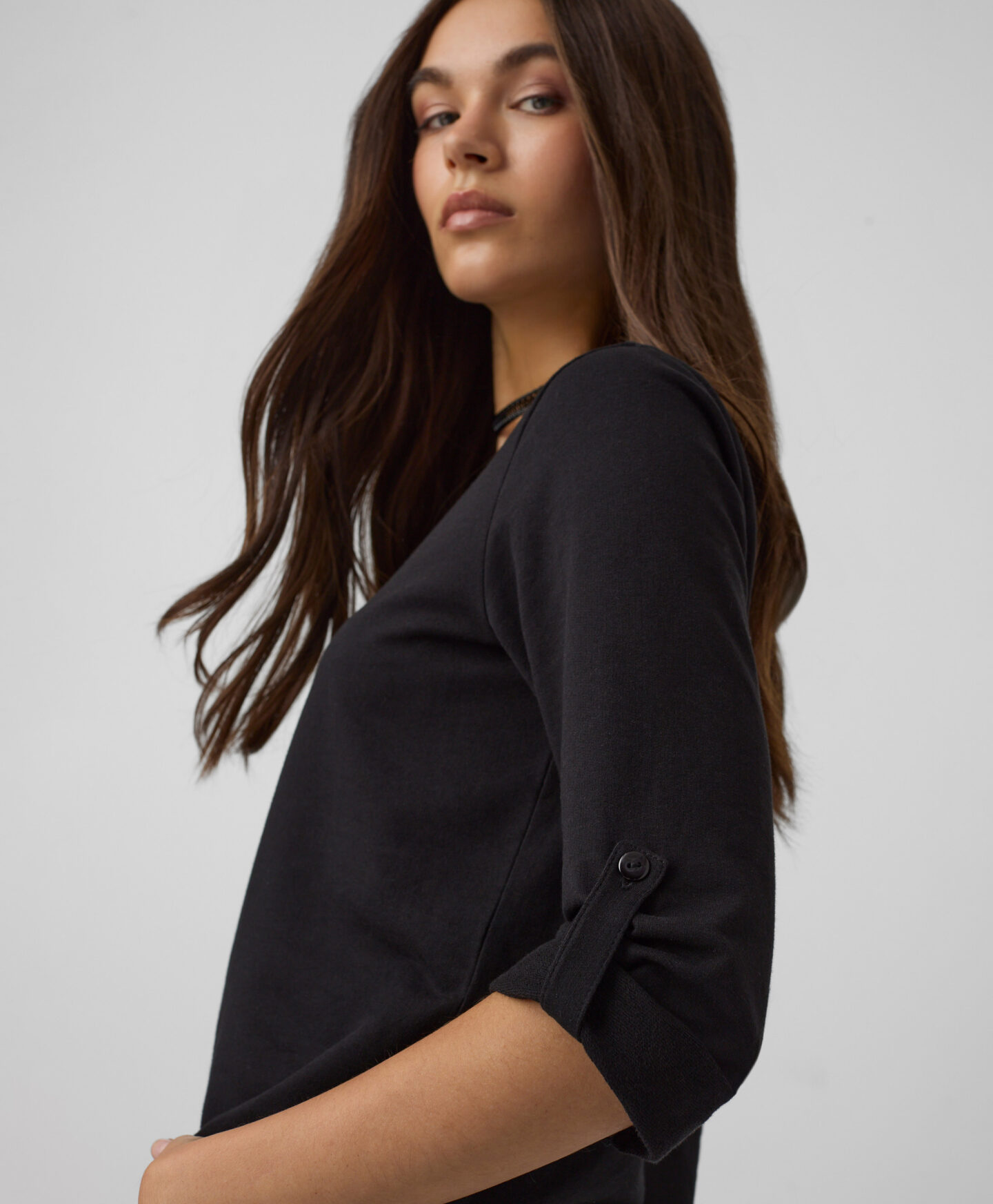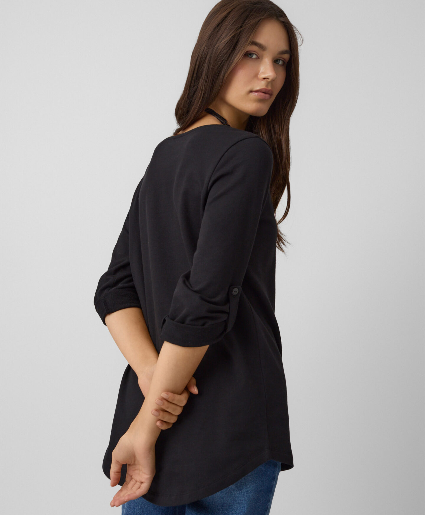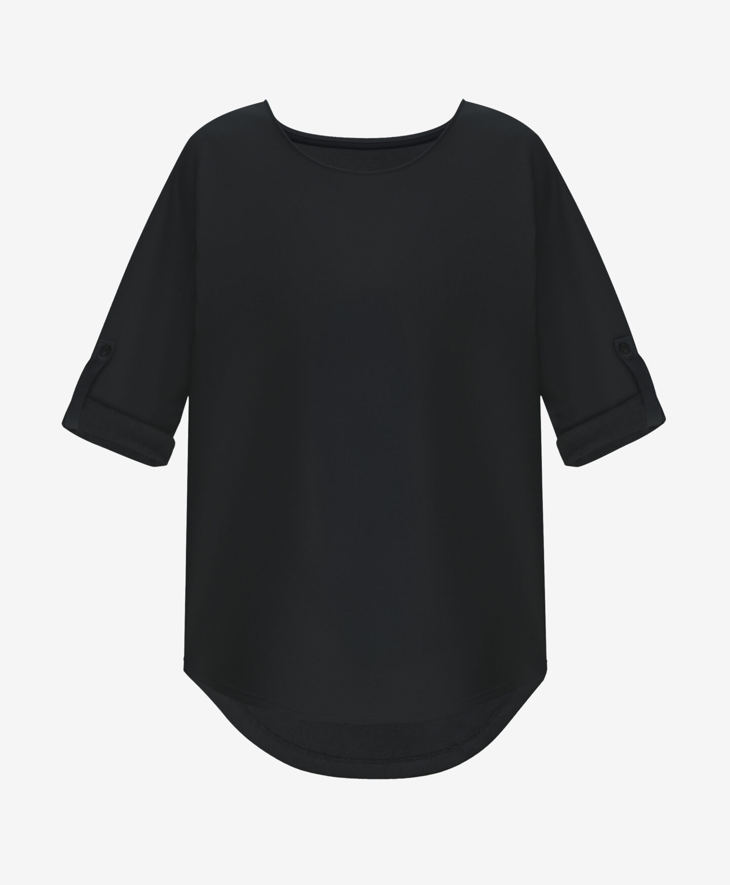 Majica za ženske z zaobljenim spodnjim delom in zavihanimi rokavi je idealna izbira za tiste, ki cenijo eleganco in udobje. Zaradi edinstvenega kroja bo vsakemu outfitu dodala čar in poudarila vaš osebni slog. Zaradi visoke vsebnosti bombaža je majica zračna in koži prijazna.