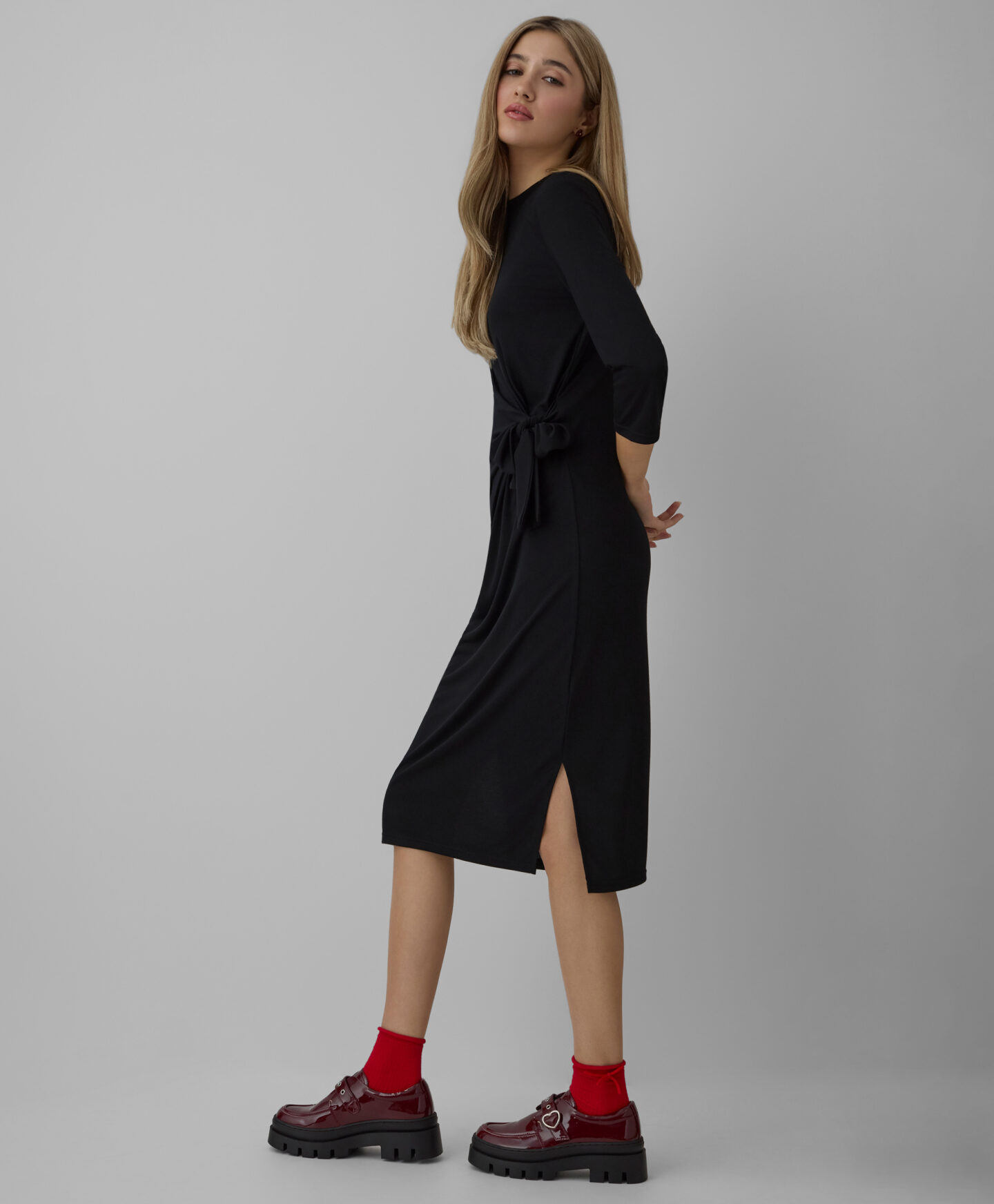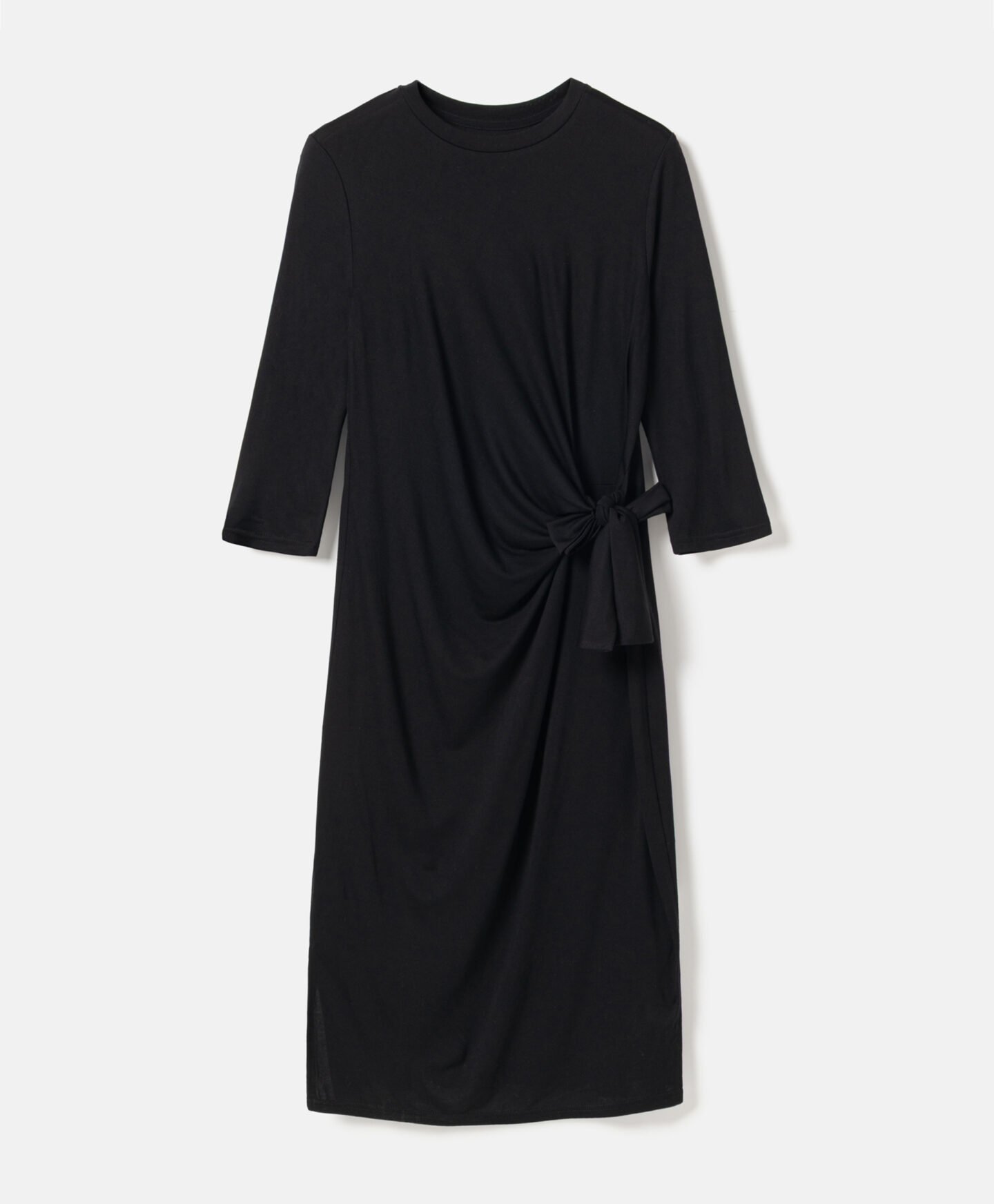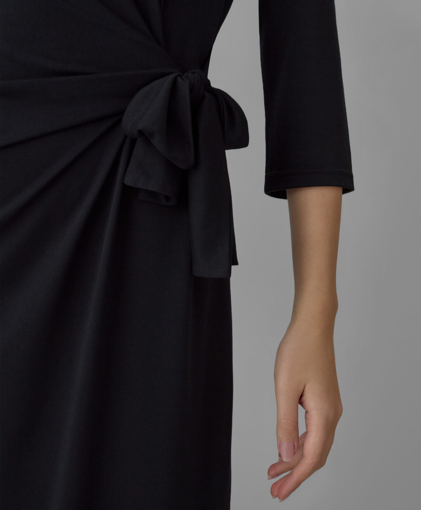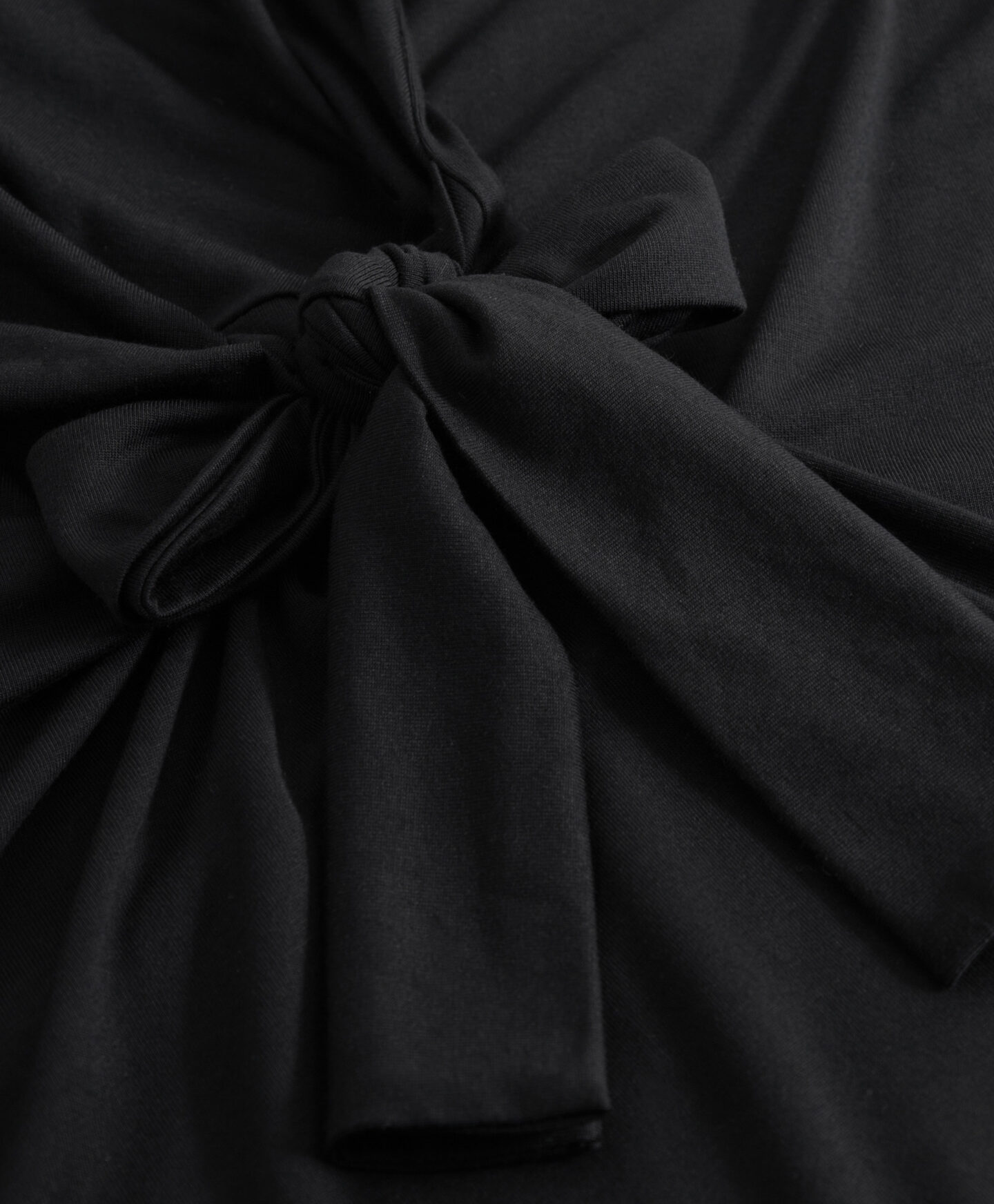 Obleka za ženske z zavezovanjem je narejena iz blaga z viskozo ter je odlična izbira za posebne priložnosti. Klasična črna barva bo vsak outfit navdala z eleganco. Obleka je mehka na otip in lepo poudari postavo. Kombinirate jo lahko tako z elegantnimi petami kot s čevlji z nizko peto.