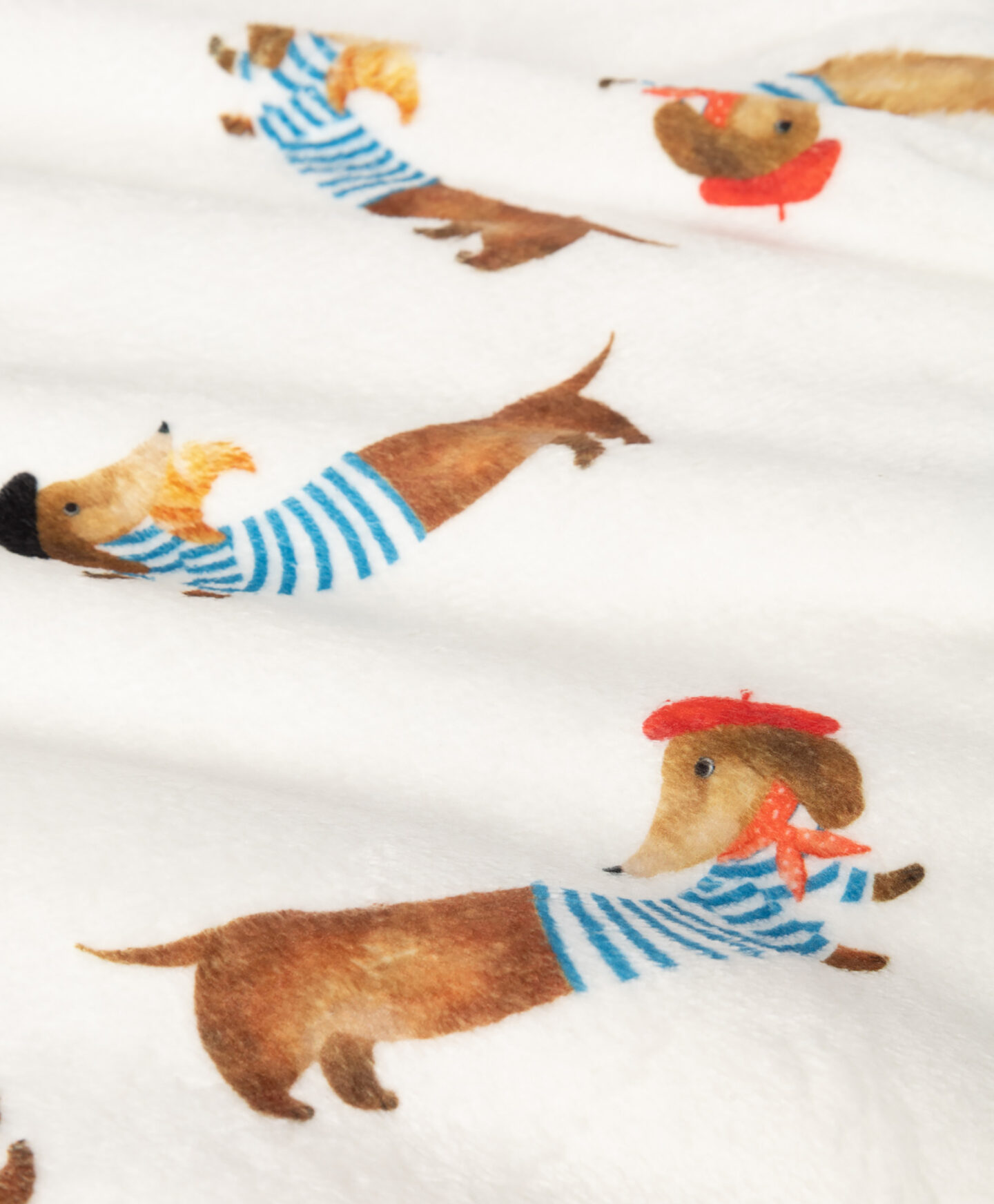 Odeja z motivom jazbečarja in merami 150×200 cm je lahka, topla in mehka. Razveselila vas bo ob dolgih večerih, saj bo nepogrešljiva med branjem ali gledanjem filma. Motiv elegantnih kužkov v baretkah bo popestril vsak skupni trenutek!