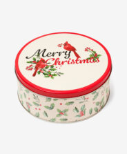 Okrogla pločevinasta posoda v rdeči barvi je klasika v praznični izdaji. Okrašena je s čudovitim napisom in zimskim motivom, ki polepša celo shranjevanje sladkarij ali oreščkov. Zaradi brezčasne oblike se lepo dopolnjuje tako s tradicionalnimi kot z modernimi aranžmaji.