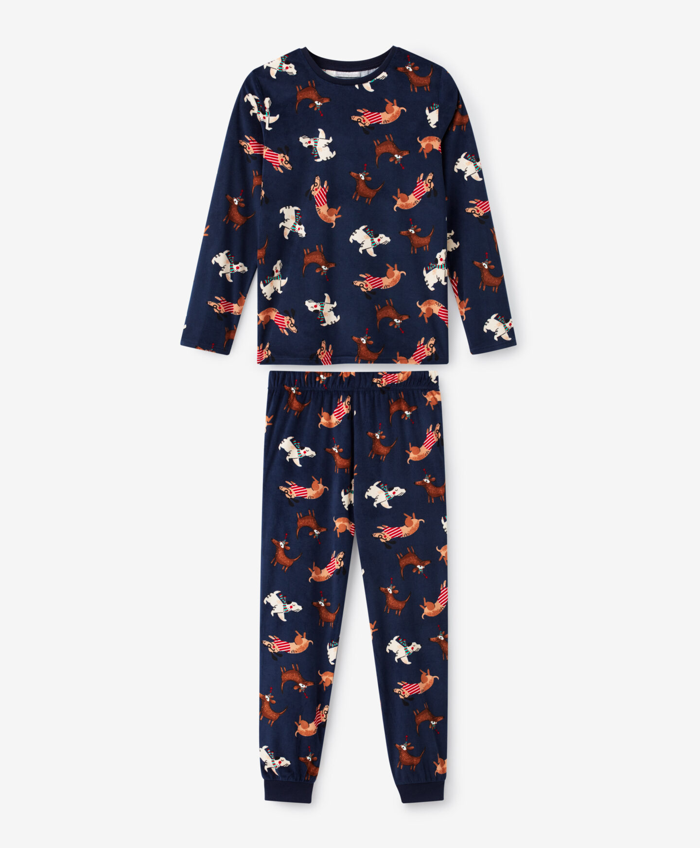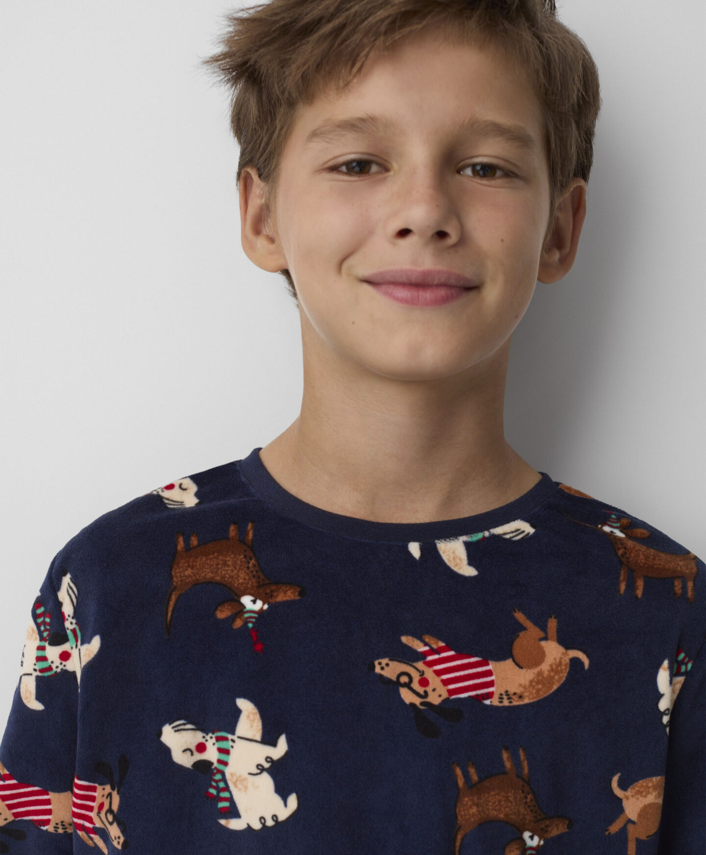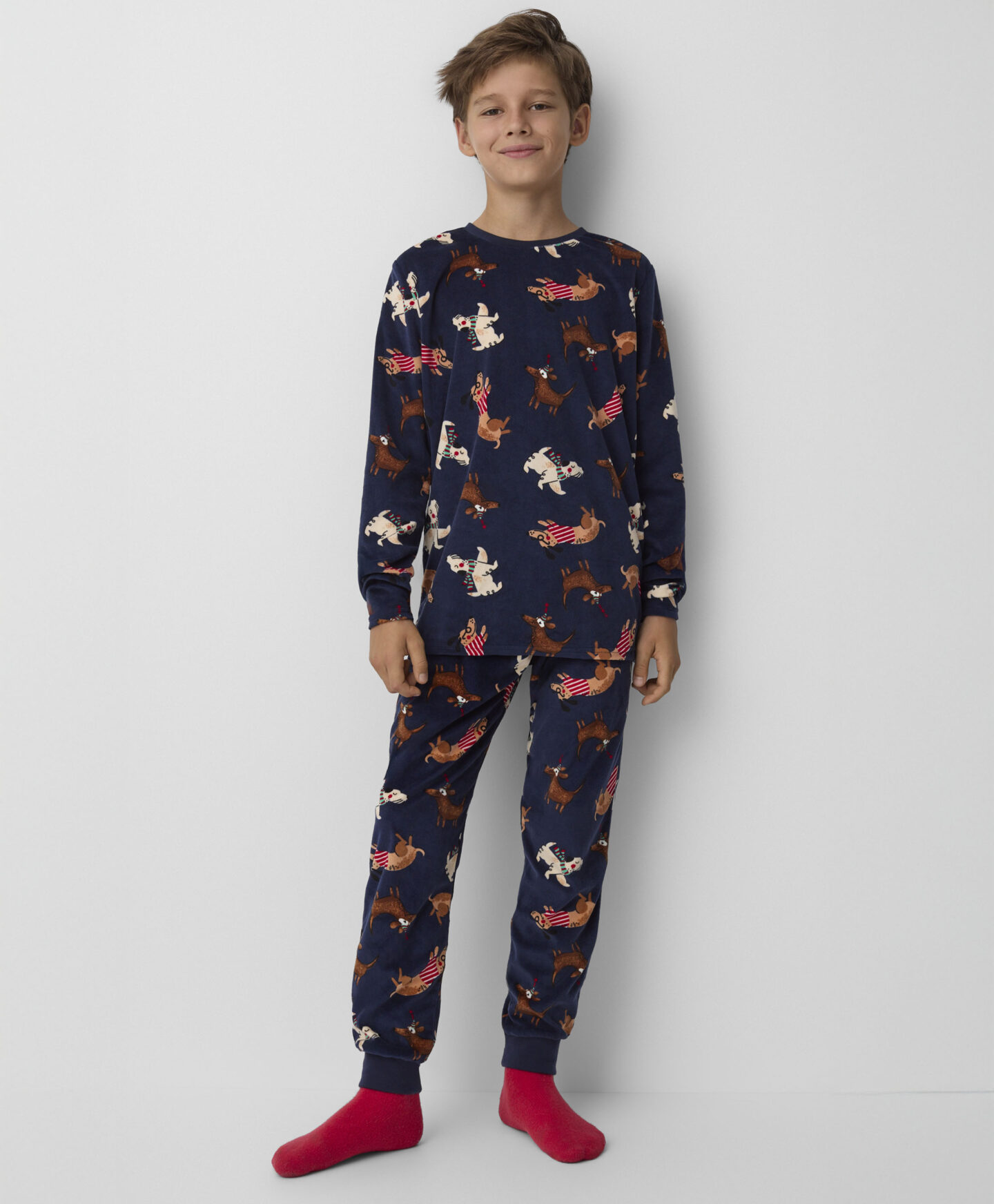 Pižama iz velurja za dečke z motivom psov zagotavlja udobje med spanjem in svobodo gibanja. Izdelana je iz mehkega velurja, ki je nežen na otip, zato je popolna izbira za hladnejše noči. Zagotavlja toplino in udobje. Igrivi vzorci z motivom psov bodo poskrbeli, da bo pižamo vsak deček želel nositi še pred spanjem.