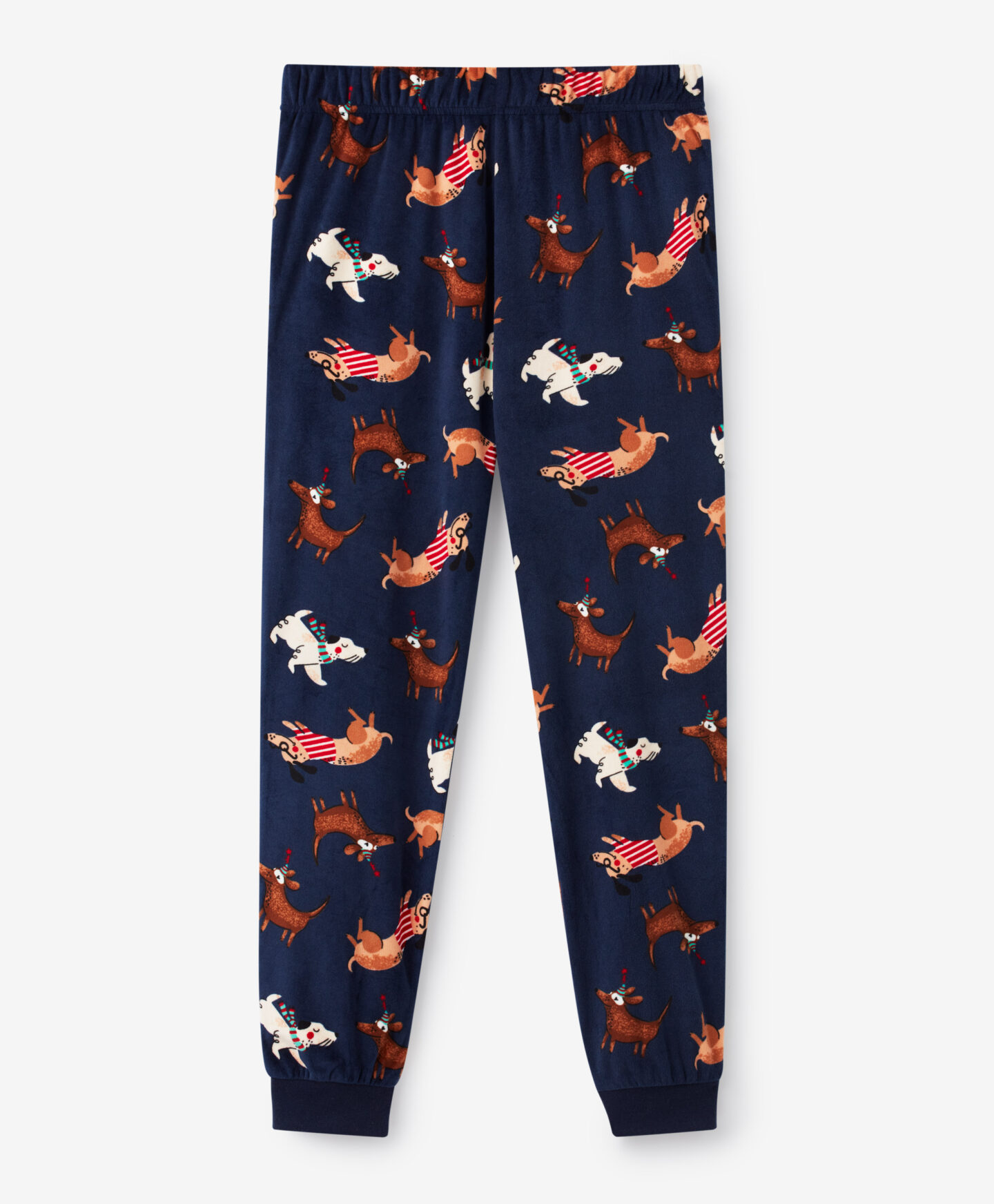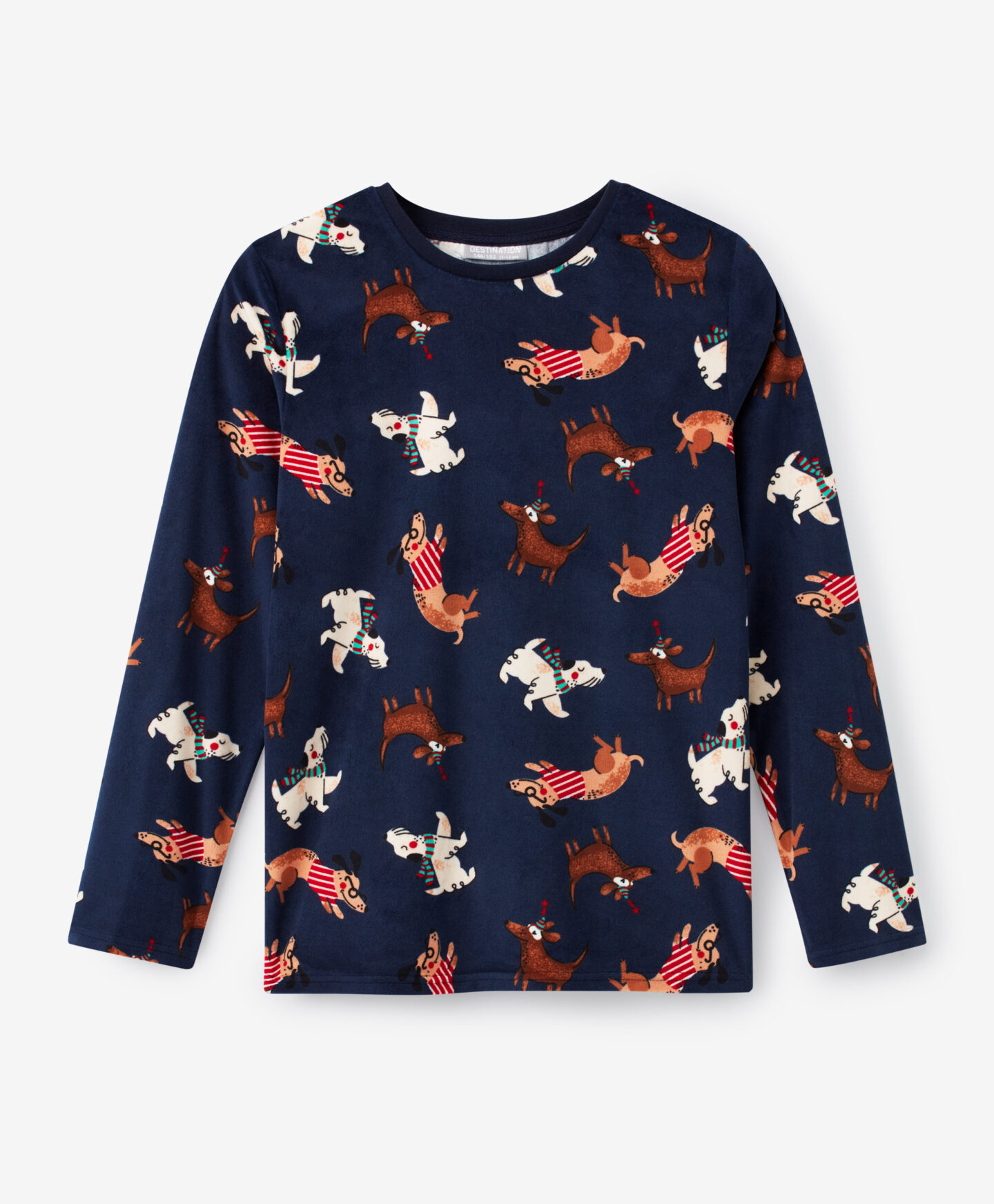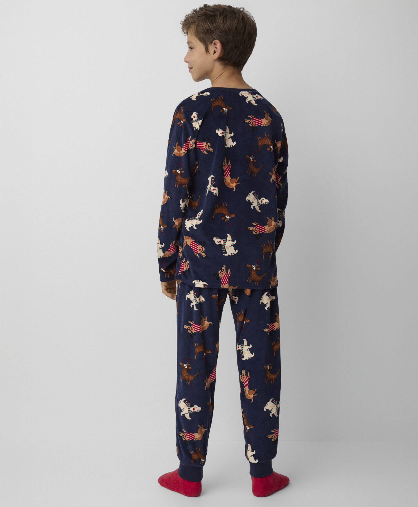 Pižama iz velurja za dečke z motivom psov zagotavlja udobje med spanjem in svobodo gibanja. Izdelana je iz mehkega velurja, ki je nežen na otip, zato je popolna izbira za hladnejše noči. Zagotavlja toplino in udobje. Igrivi vzorci z motivom psov bodo poskrbeli, da bo pižamo vsak deček želel nositi še pred spanjem.