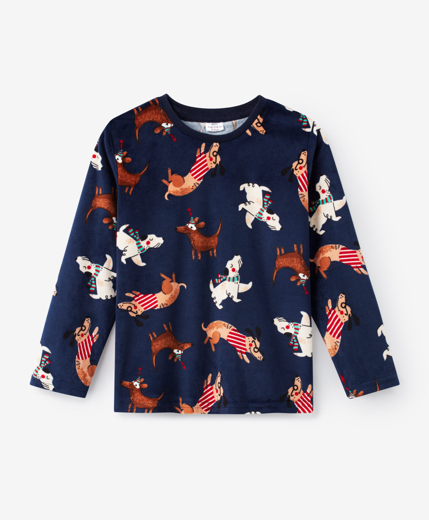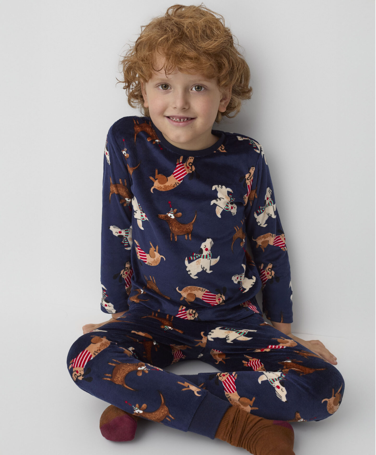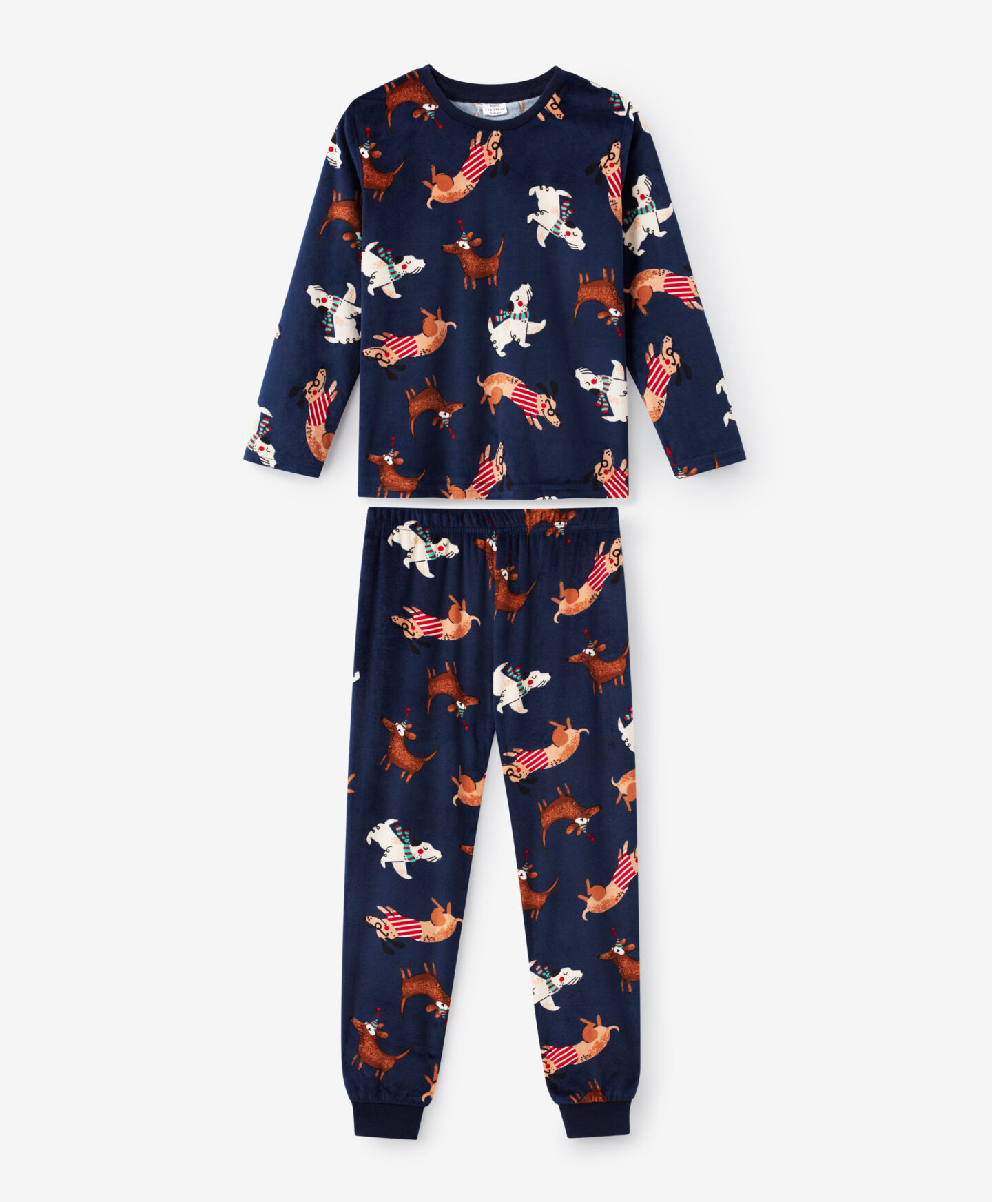 Pižama iz velurja za dečke z motivom psov je odlična izbira za male pasje ljubitelje. Izdelana je iz mehkega velurja, ki je nežen na otip, zato zagotavlja udobje med spanjem in svobodo gibanja. Igrivi vzorci z motivom psov bodo poskrbeli, da si bo pižamo vsak deček želel nadeti še pred spanjem. Pižama je popolna za hladnejše noči, saj zagotavlja toplino in udobje.