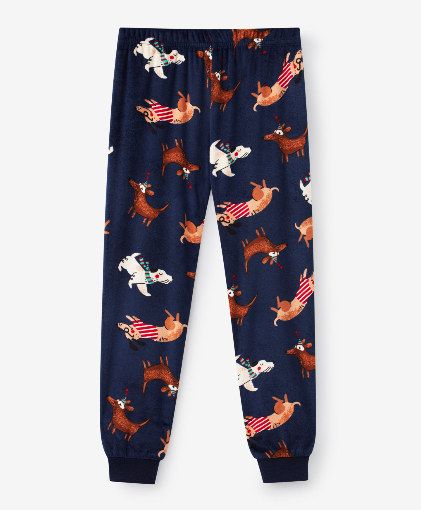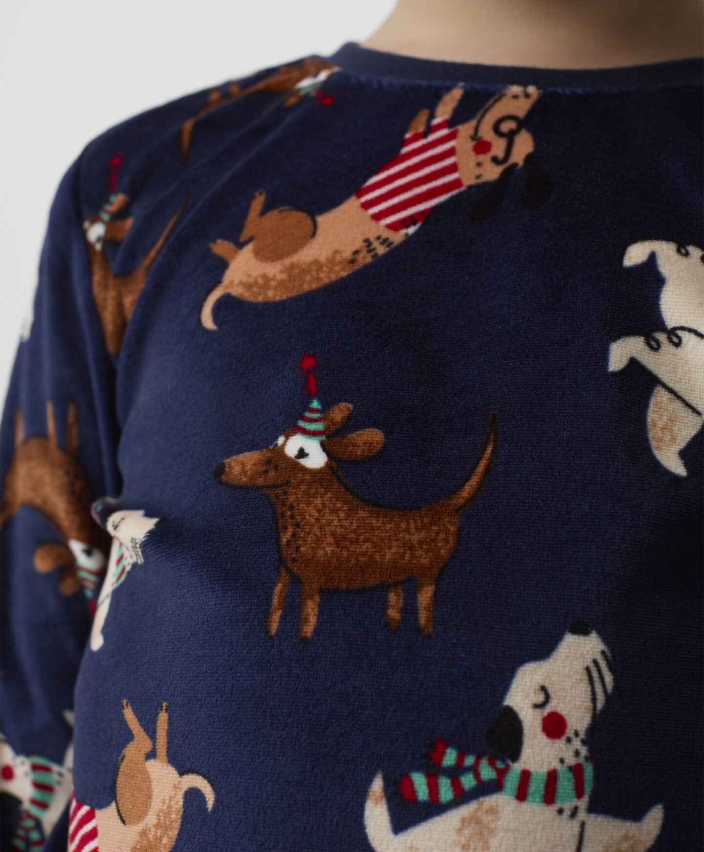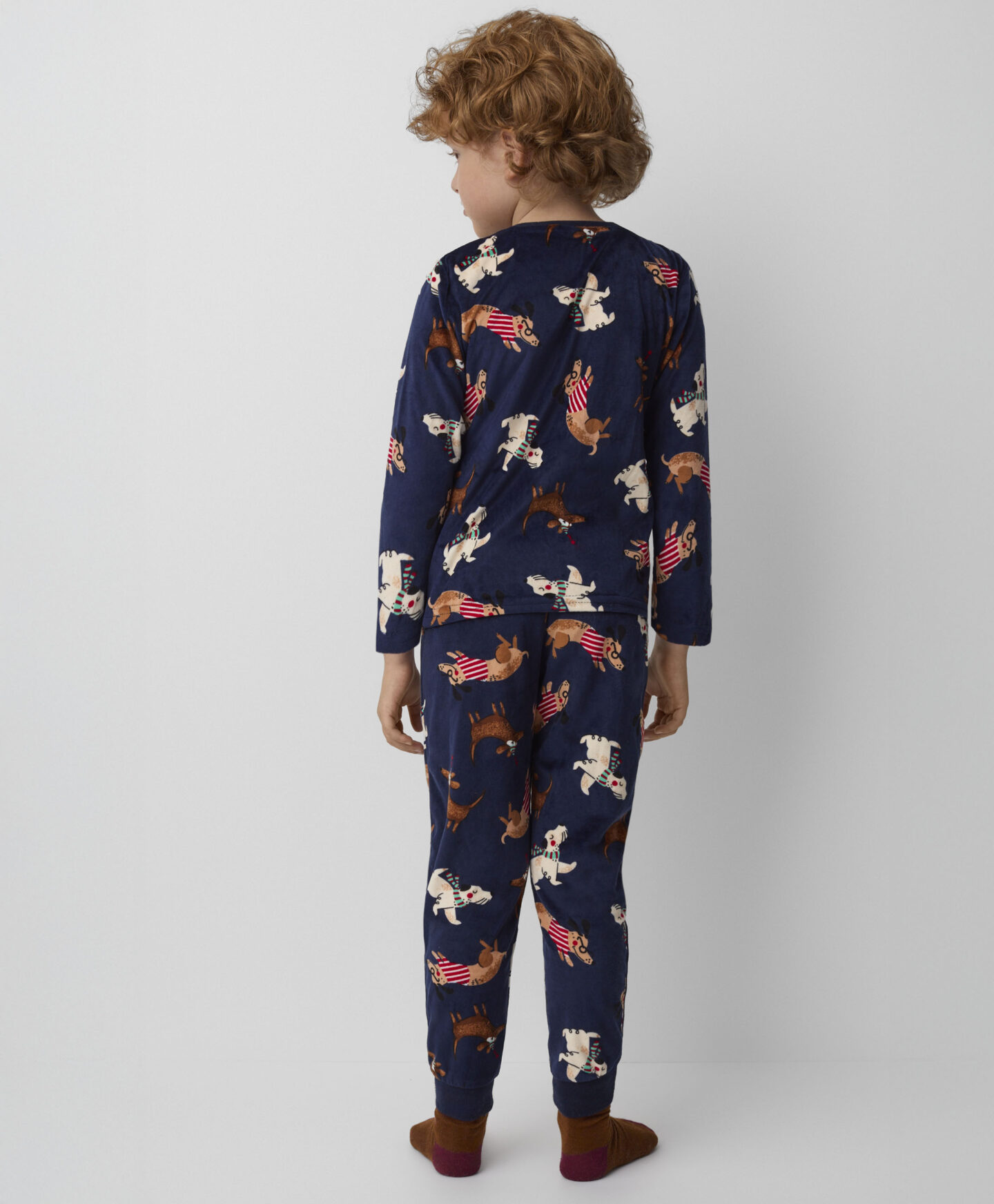 Pižama iz velurja za dečke z motivom psov je odlična izbira za male pasje ljubitelje. Izdelana je iz mehkega velurja, ki je nežen na otip, zato zagotavlja udobje med spanjem in svobodo gibanja. Igrivi vzorci z motivom psov bodo poskrbeli, da si bo pižamo vsak deček želel nadeti še pred spanjem. Pižama je popolna za hladnejše noči, saj zagotavlja toplino in udobje.