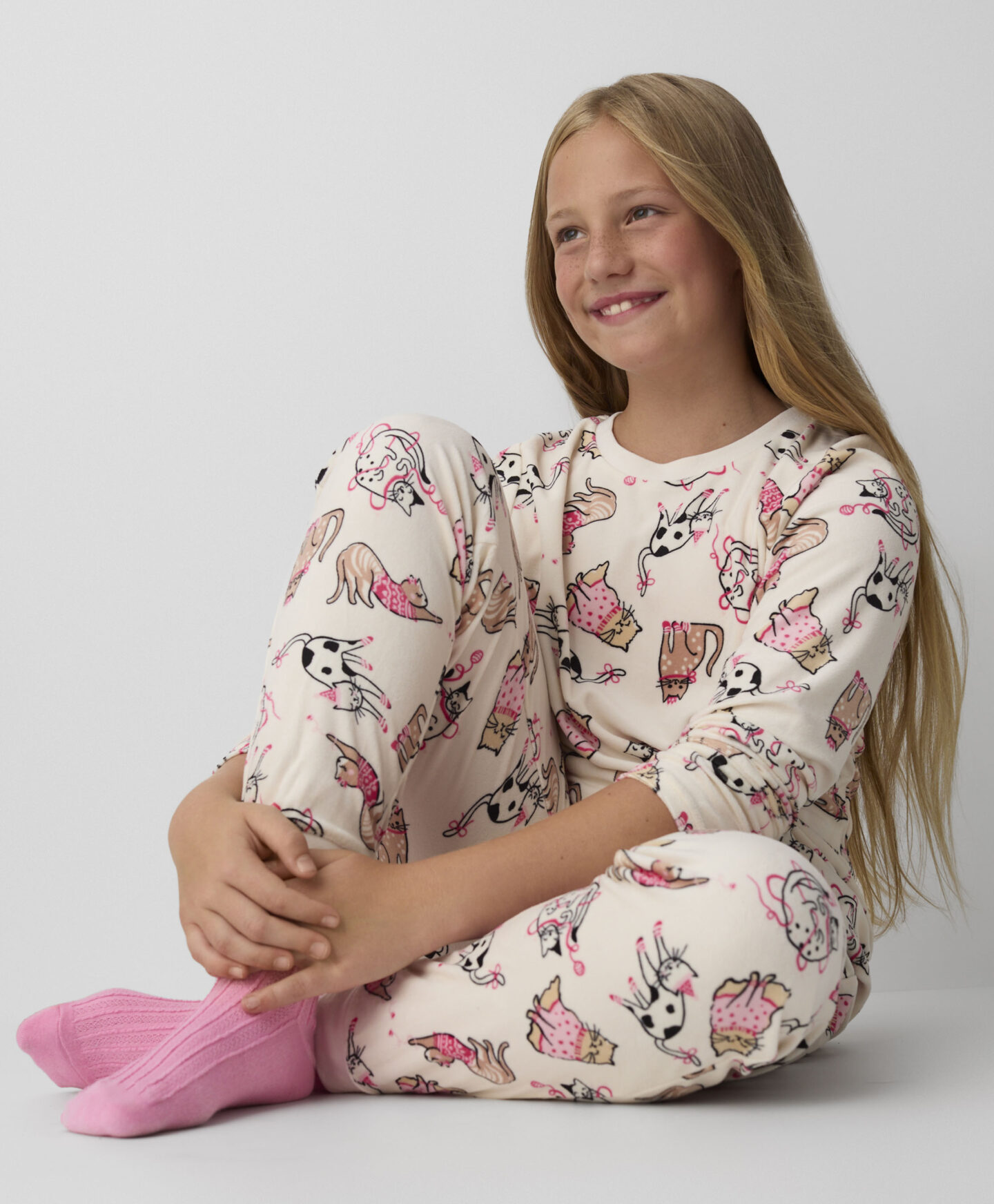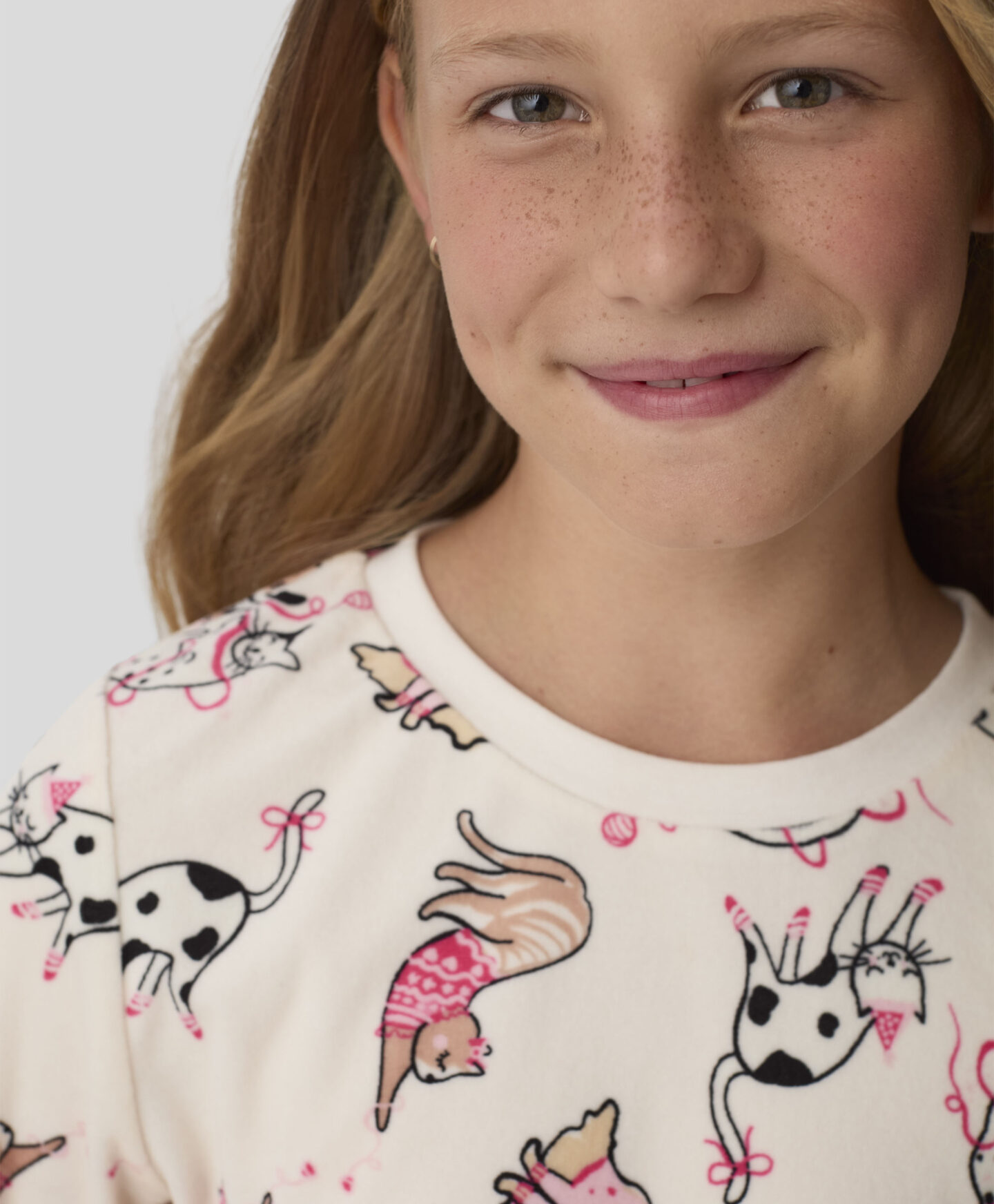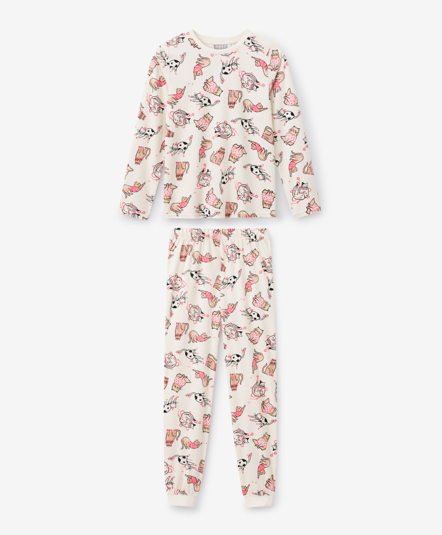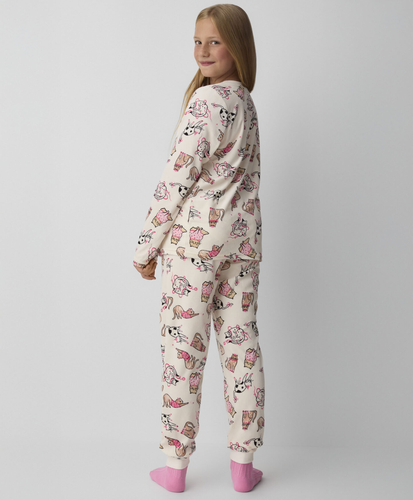 Pižama iz velurja za deklice z motivom mačk zagotavlja udoben spanec in svobodo gibanja. Narejena je iz mehkega in prijetnega velurja, ki nudi toplino in udobje. Igrivi motivi bodo navdušili vsako deklico. Idealna je za hladnejše noči. Odlična izbira za vse ljubiteljice mačk.