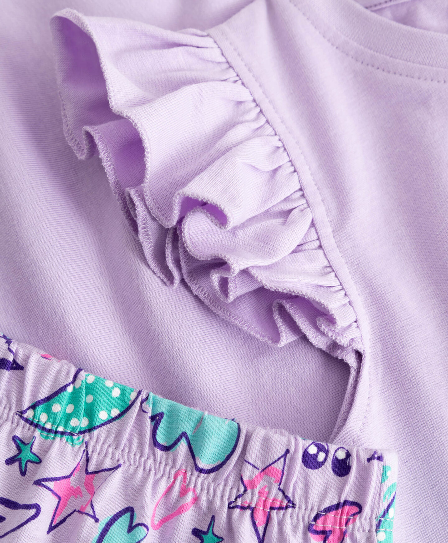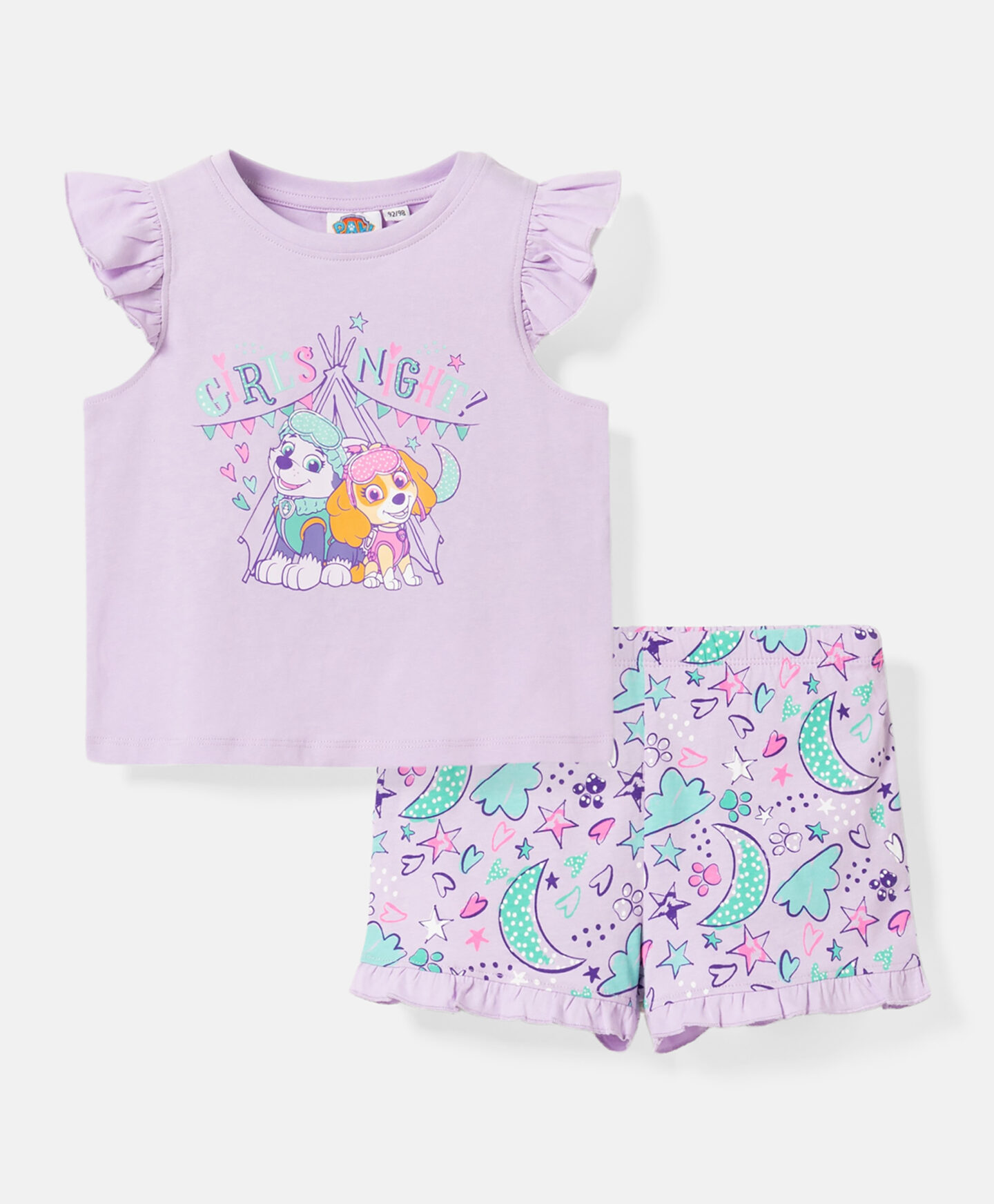 Pižama za deklice 100% bombaž Tačke na patrulji zagotavlja udobje vašega otroka. Komplet je sestavljen iz majice s kratkimi rokavi z naborki in kratkih hlač. Motiv z najljubšimi liki bo očaral vsako malo oboževalko serije. Material je mehek, zračen in prijeten do občutljive otroške kože. Klasičen kroj omogoča svobodo gibanja.