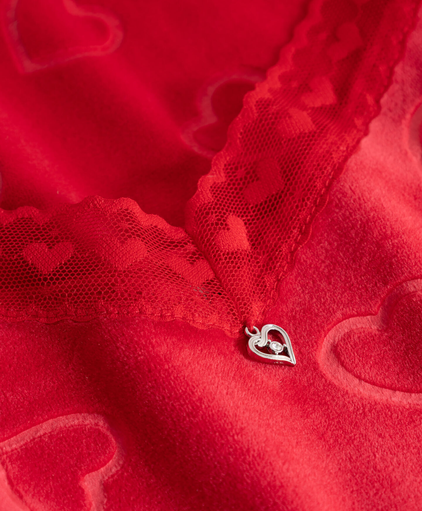 Rdeča pižama za ženske iz velurja s čipko in srčastim reliefom je romantična izbira za prihajajoče valentinovo. Komplet vključuje top s tankimi naramnicami in kratke hlače, ki se odlično prilegajo in lepo poudarijo postavo. Odlična ideja za darilo. V ponudbi sta na voljo dve barvni različici.