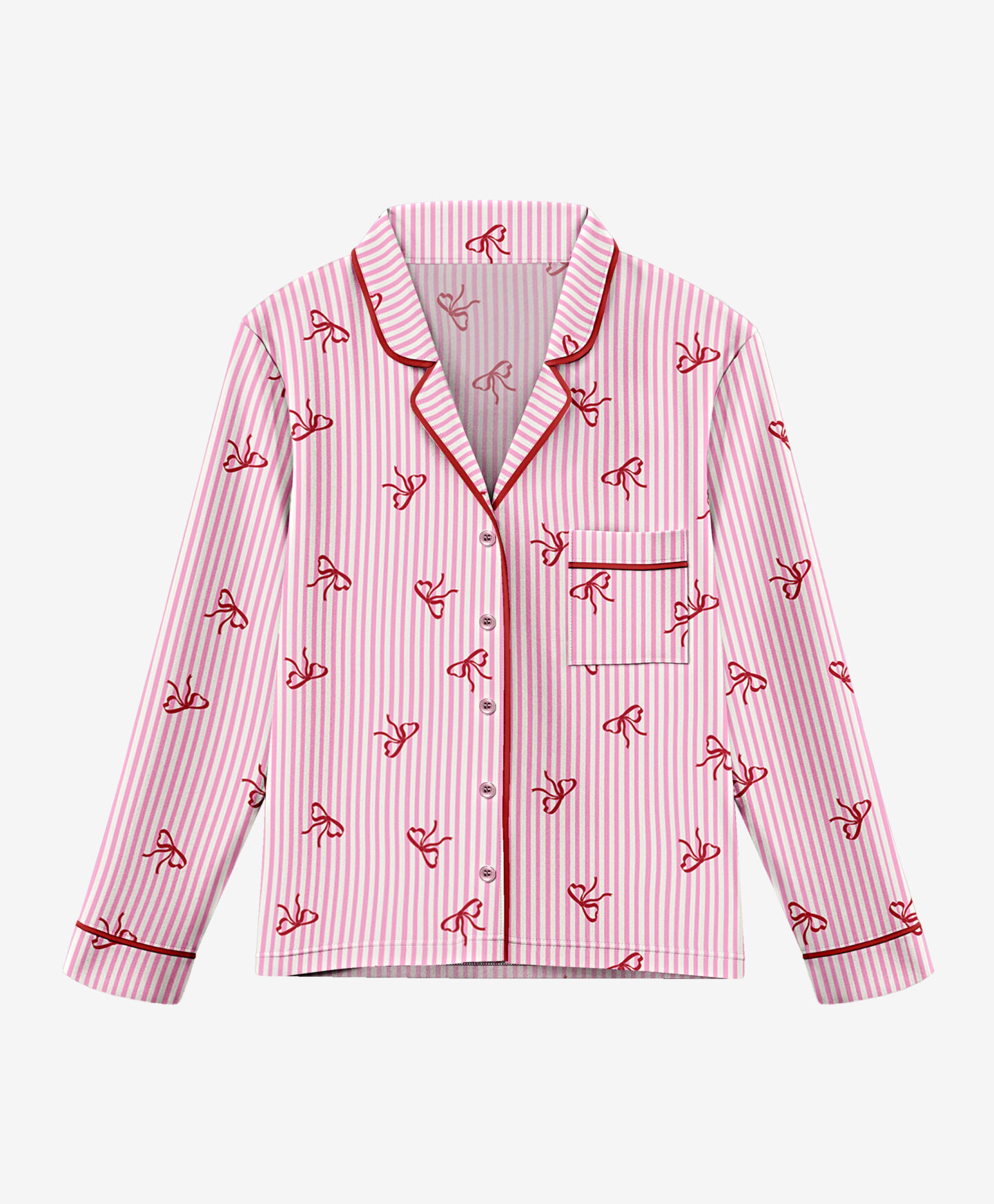 Pižama za ženske z motivom pentelj je sestavljena iz hlač in srajce z ovratnikom in ljubkimi roza gumbi. Pižama je mehka in topla, popolna za hladnejše noči ali večerno sprostitev s knjigo v roki. Komplet je tudi odlična ideja za darilo.