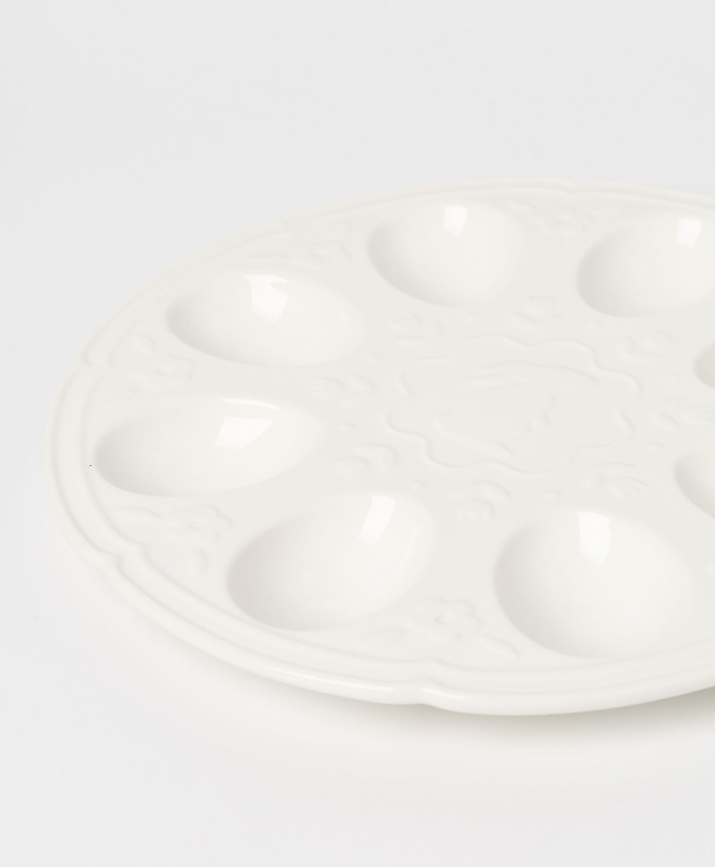Pladenj za pirhe iz porcelana je popoln za postrežbo prazničnega zajtrka. Je eleganten način za postrežbo polnjenih jajc, trdo kuhanih jajc ali mehko kuhanih jajc. Lahko služi tudi kot čudovit namizni okras ali da na njem razstavite okrašene pirhe.