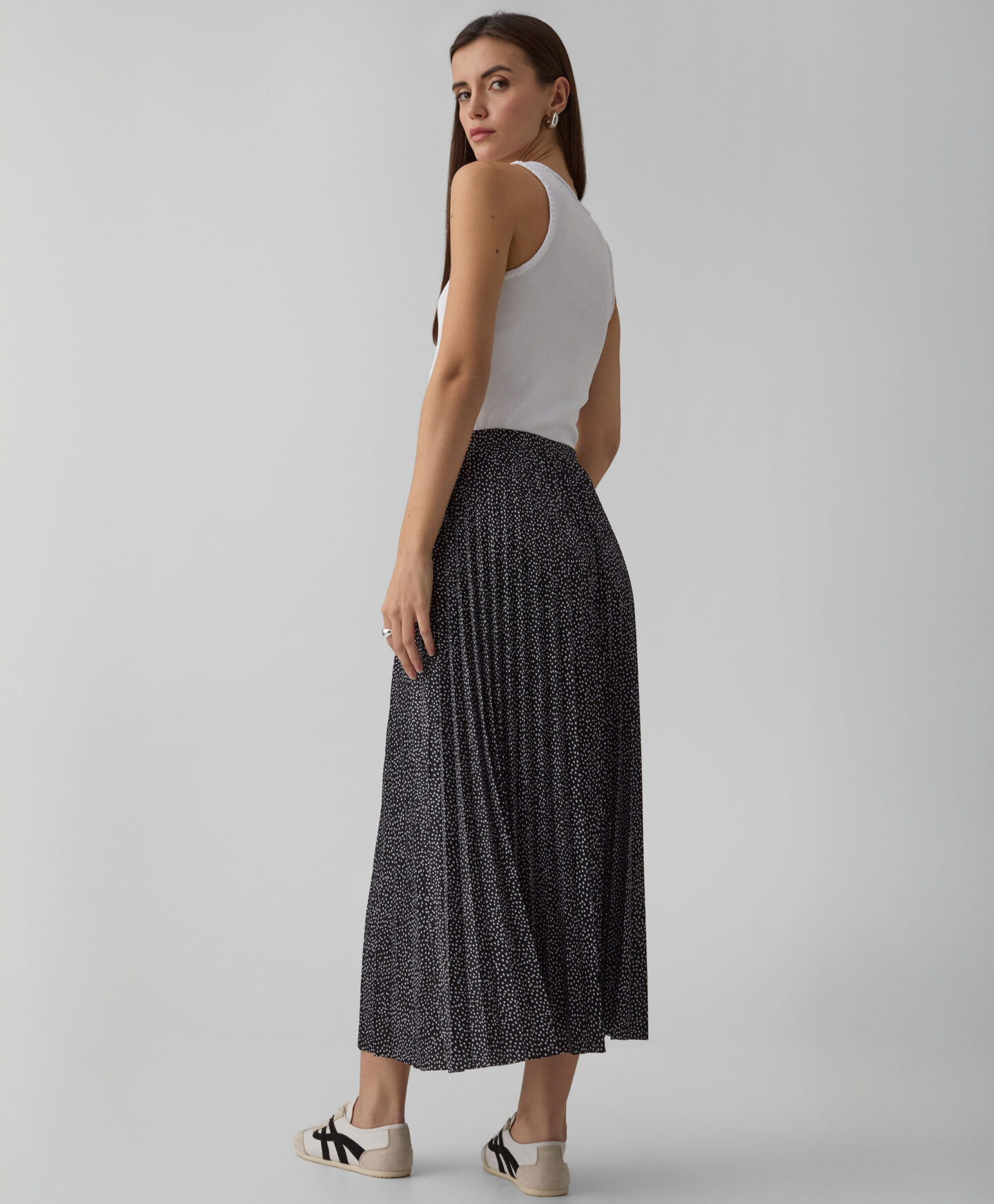 Plisirano krilo je elegantna izbira za vse romantične duše. Dolžina do gležnjev omogoča, da ga nosite tako za v pisarno kot za posebne priložnosti. Odlično bo videti v kombinaciji s preprosto bluzo, elegantno srajco ali suknjičem. Plisirane gube zagotavljajo popolno svobodo gibanja.