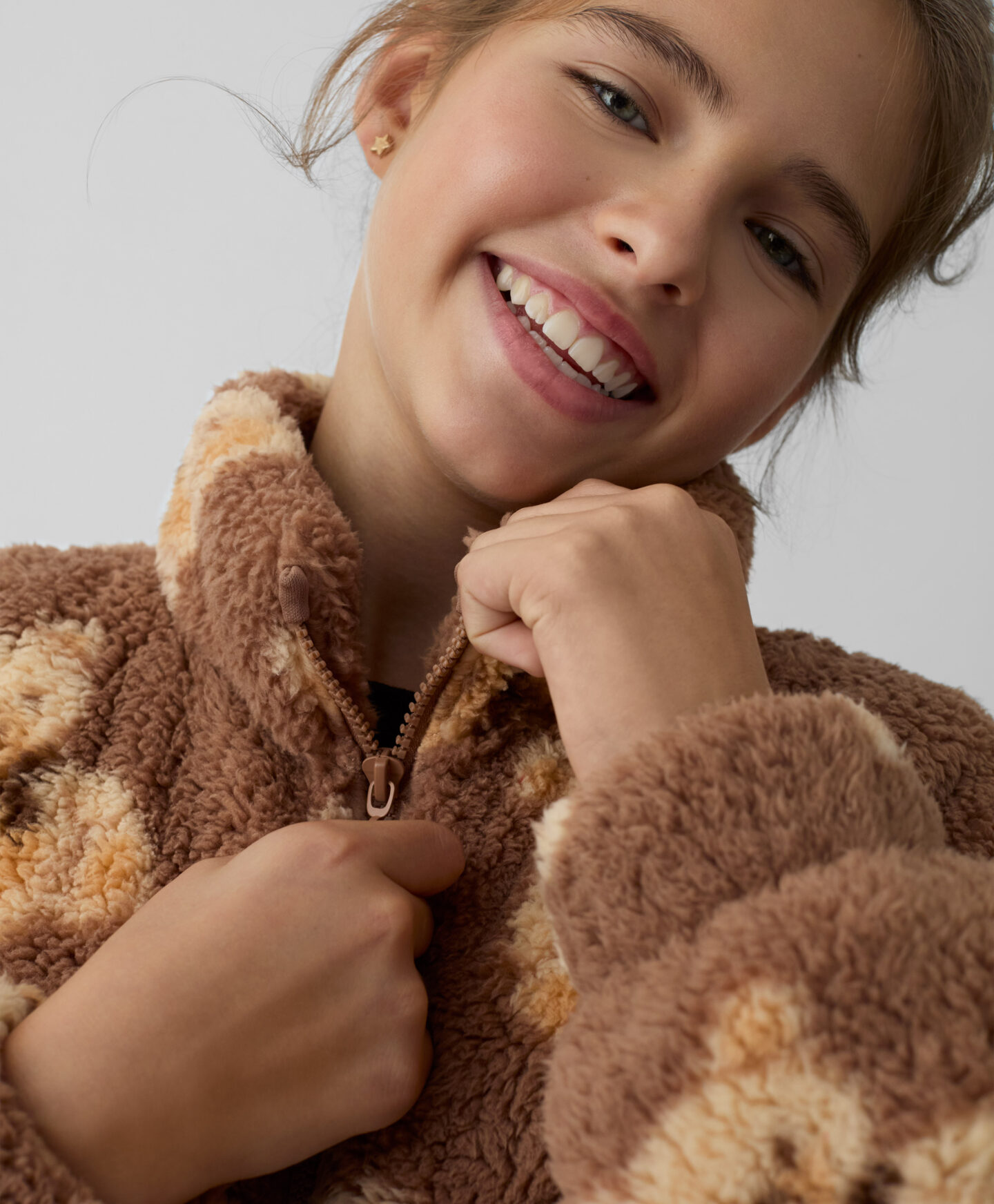 Pulover iz flisa sherpa za deklice z motivom medvedkov ima priročno zadrgo. Združuje stil, toplino in udobje. Narejen je iz materiala, ki je prijeten na otip, zato se nežno prilega otrokovi koži. Zadrga po celotni dolžini zagotavlja hitro oblačenje in slačenje, ohlapen kroj pa omogoča prosto gibanje in otroku nudi popolno svobodo.