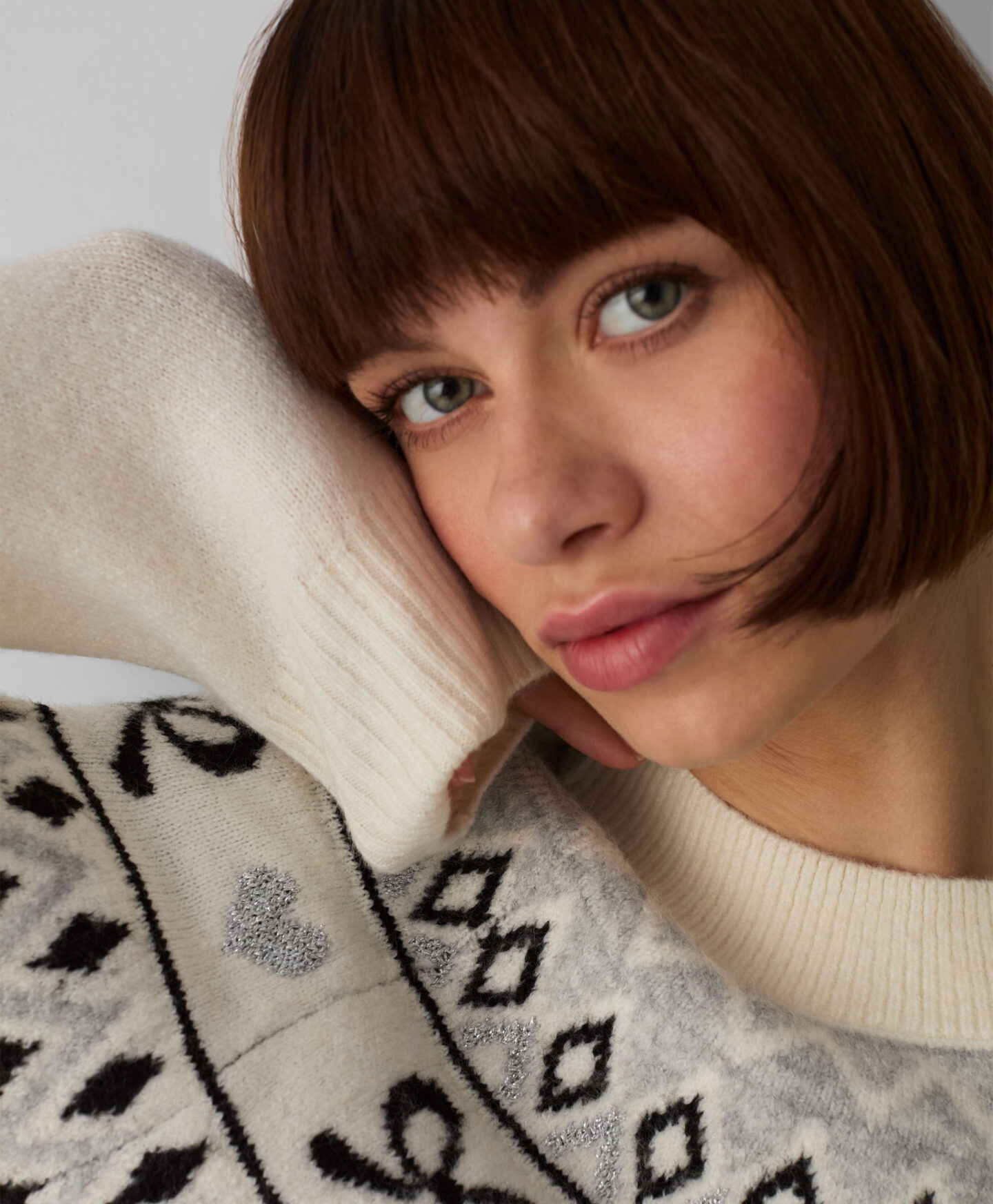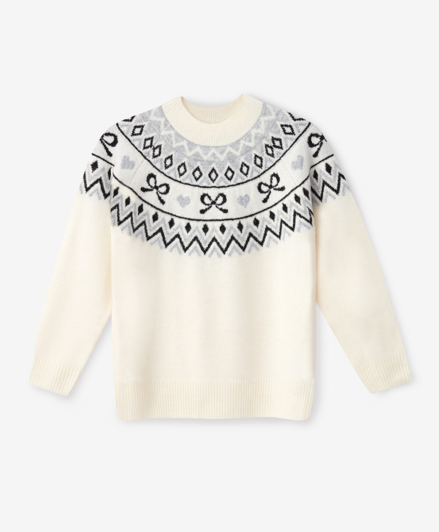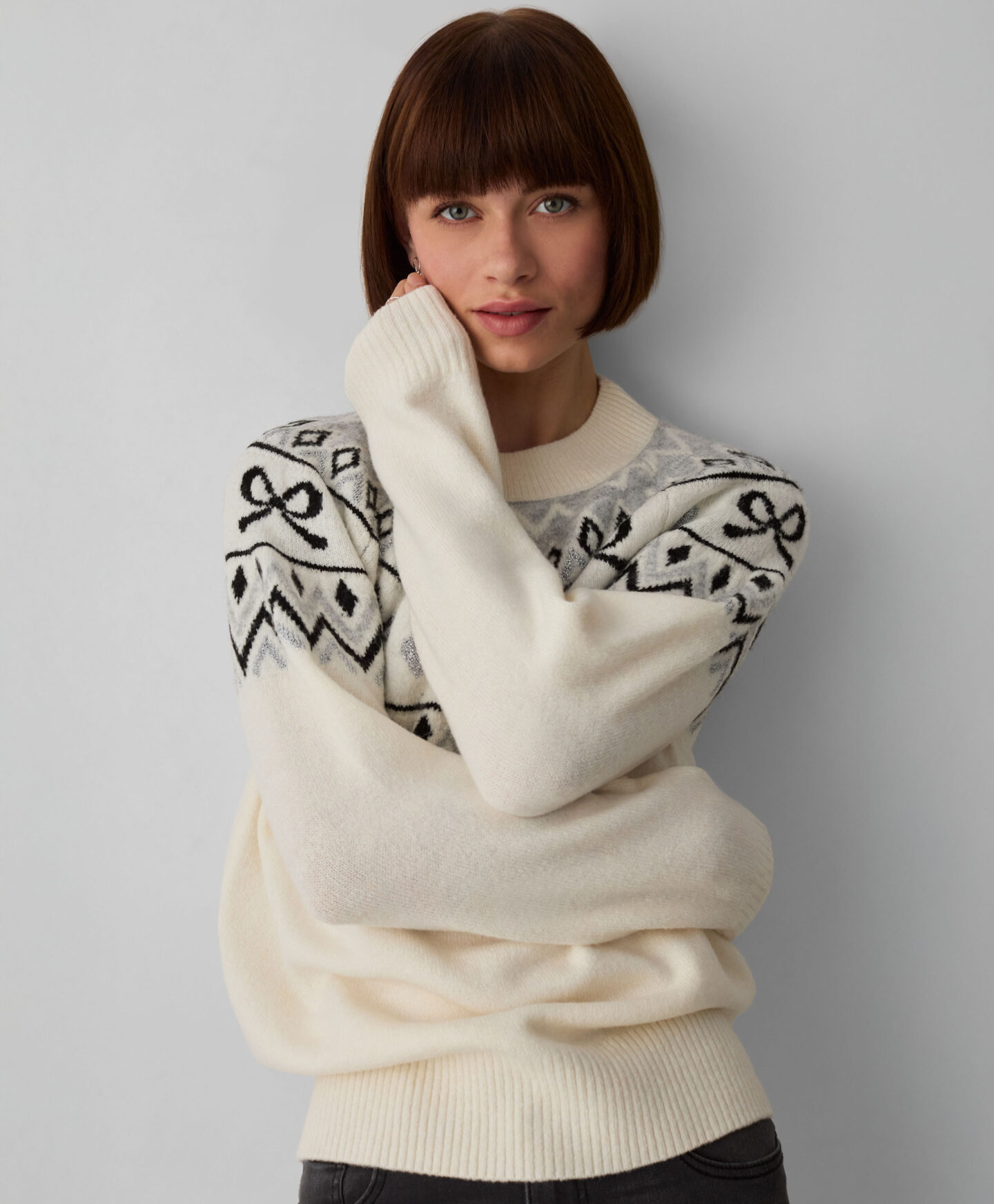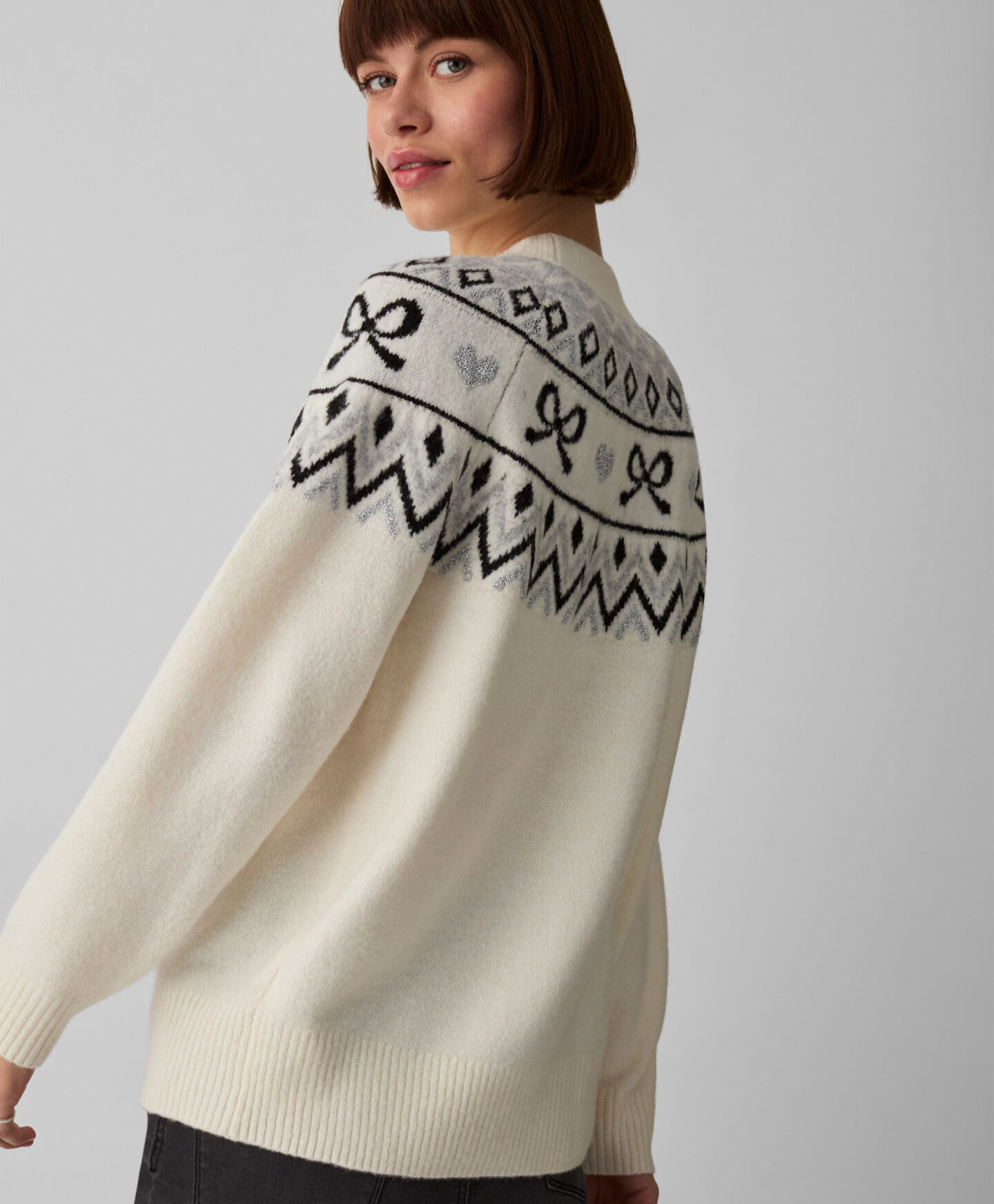Pulover za ženske z nordijskim vzorcem s pentljami ni le topel, temveč tudi eleganten. Bež barva, prepletena s sivimi in črnimi nordijskimi vzorci, bo navdušila prav vsakogar. Lahko ga kombinirate s krilom ali hlačami, zato zagotavlja čudovite kombinacije za vsak letni čas.