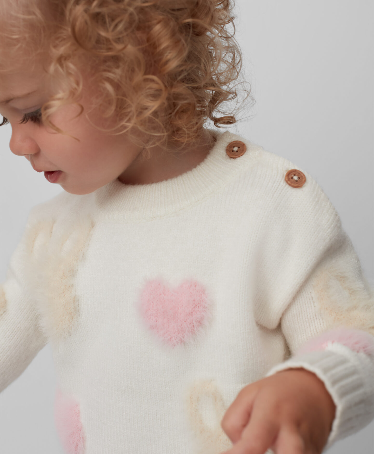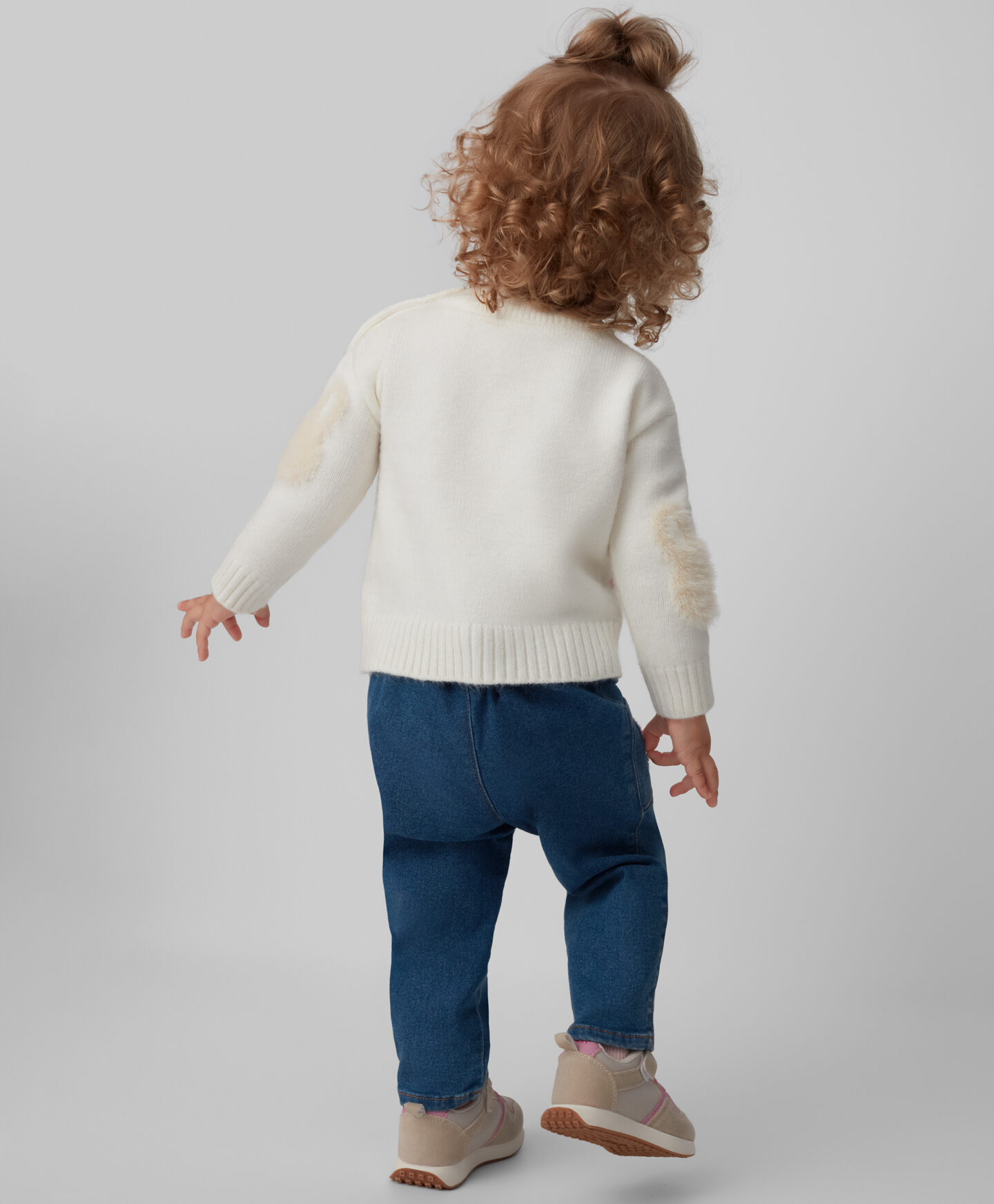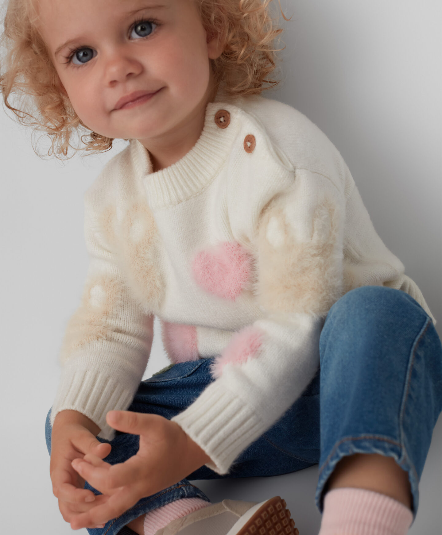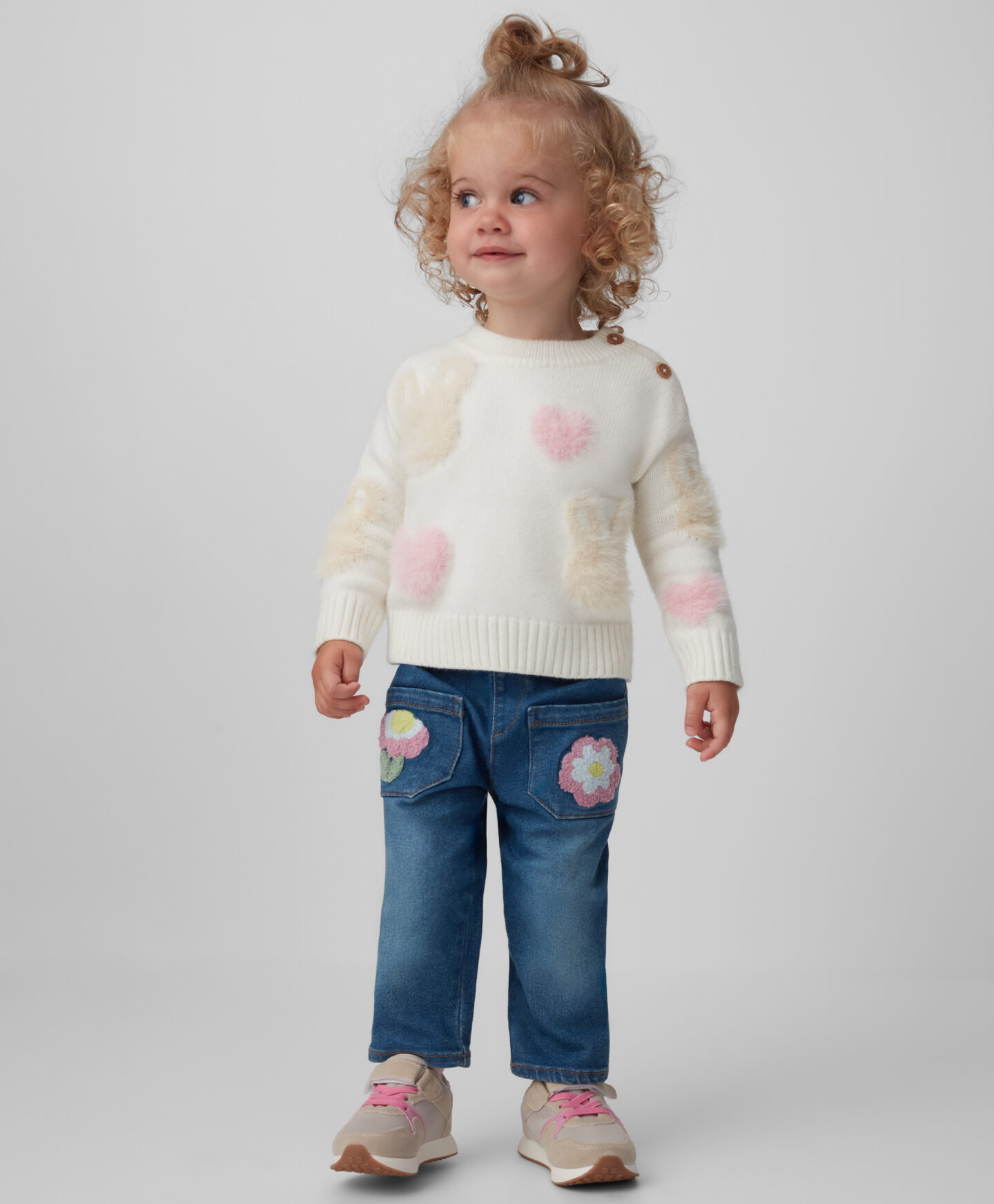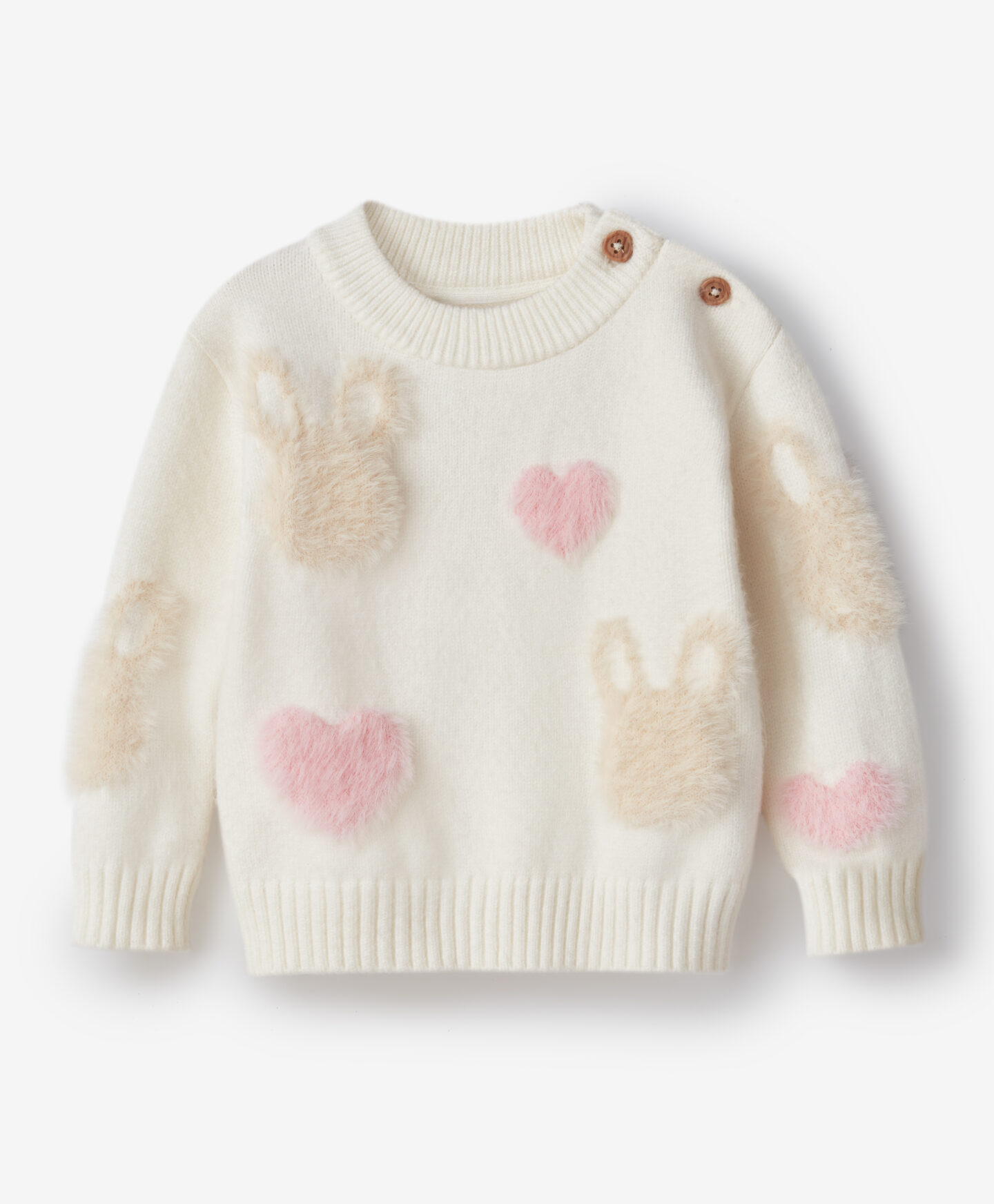 Pulover za dojenčice z zapenjanjem na gumbe je udobna vsakodnevna izbira. Gumbi bodo olajšali oblačenje vaših najmlajših, motivi zajčkov in srčkov pa bo vsaki opravi dodali poseben čar. Pulover je topel in nežen na otip.