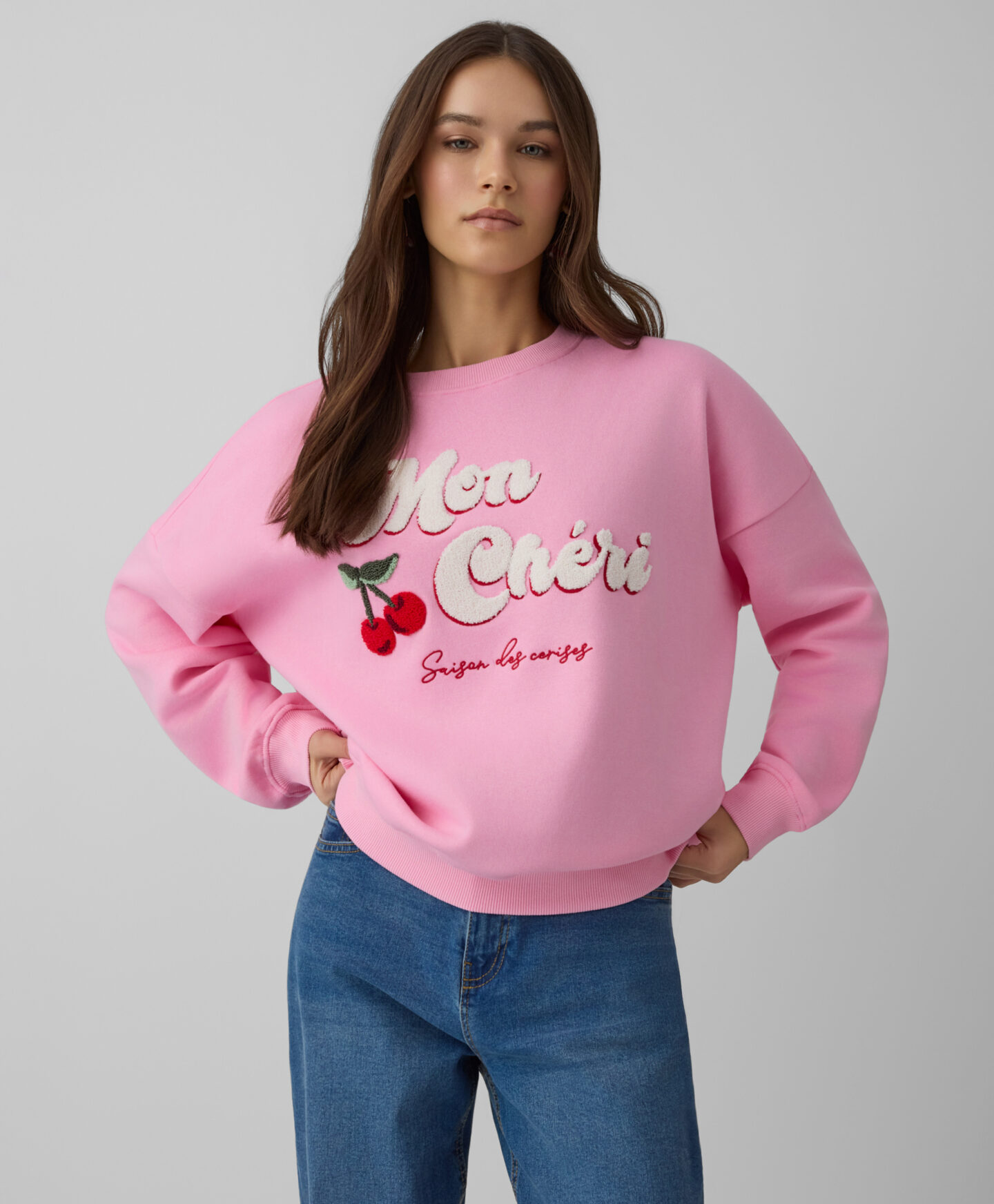 Pulover za ženske z motivom češenj je izdelan iz mehkega bombažnega materiala. Nežno objame kožo, saj je topel in trpežen, poleg tega pa je odporen na pogosto pranje. Motiv češenj na sprednji strani mu doda poseben čar. Odlično se ujema tako s kavbojkami kot s spodnjim delom trenirke.