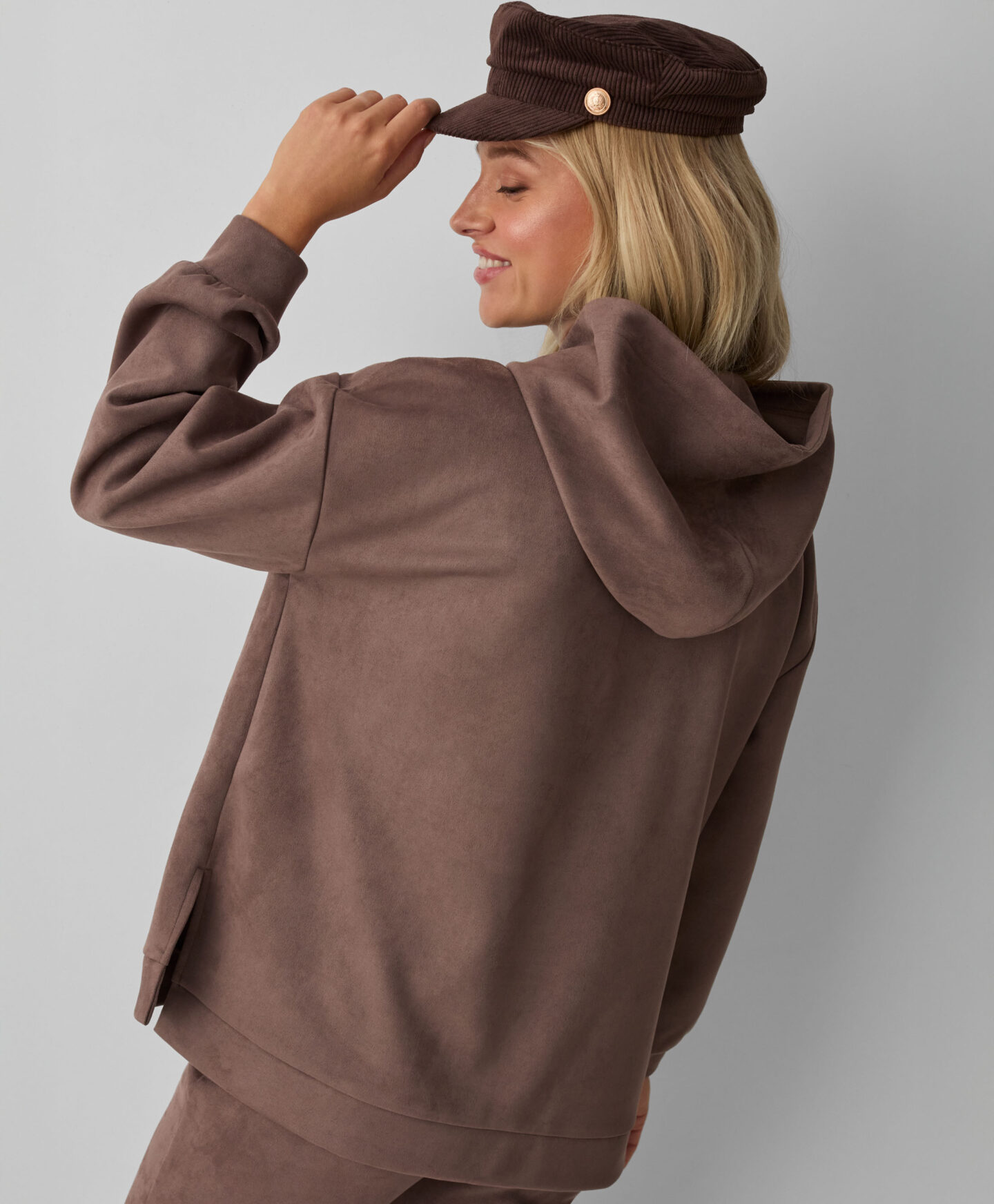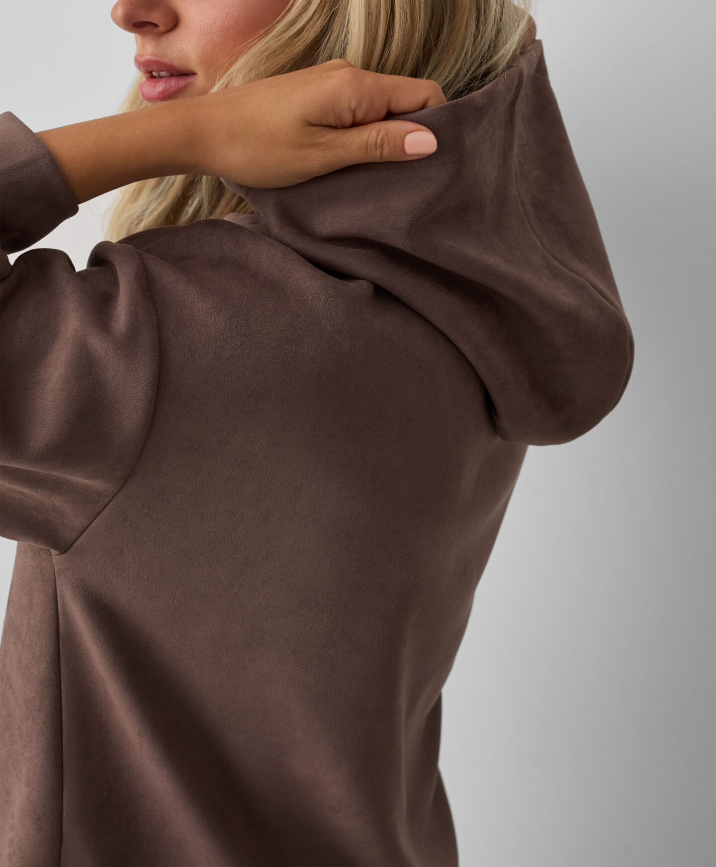 Rjav zgornji del trenirke za ženske iz semiša s kapuco vam bo nudil udobje in toploto v hladnih dneh. Ni le udoben, temveč tudi eleganten. Mehak material, skrbna zasnova in ženstvena barva zagotavljajo, da bo to postal vaš najljubši jesenski pulover! Popolno se ujema s spodnjim delom trenirke iz semiša iz kolekcije. V trgovini ga boste našli v dveh barvnih različicah.