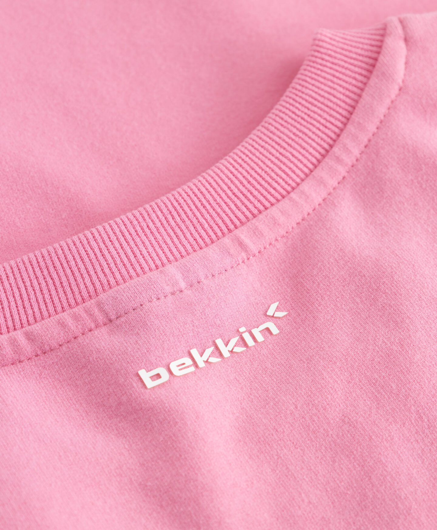 Roza majica za deklice Bekkin je sinonim za športni stil. Širok kroj nudi svobodo gibanja in popolno udobje. Široki rokavi majici dajejo moderen videz. Visoka vsebnost bombaža zagotavlja zračnost. Majica je kot nalašč za vsakodnevno nošenje ali za aktivnosti na prostem. Vsestranska roza barva se lepo poda k različnim outfitom, od vsakodnevnih do bolj elegantnih. Na voljo so tudi ujemajoče kratke hlače.
