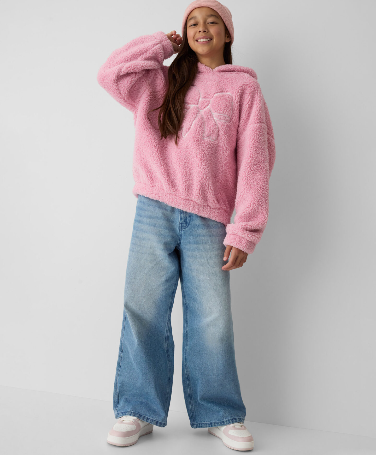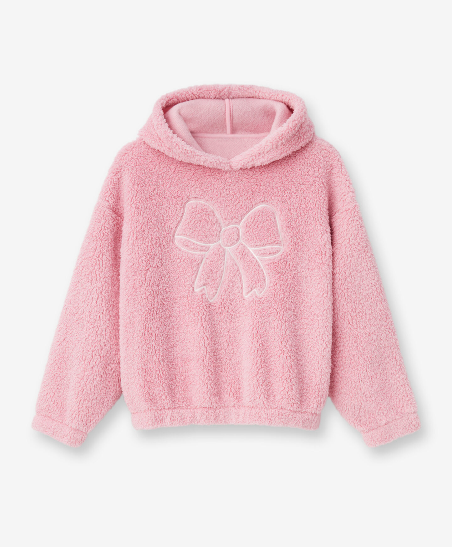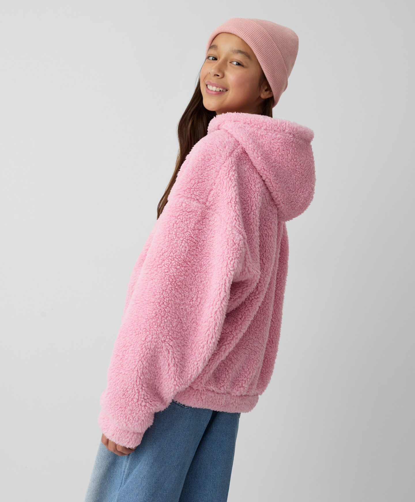 Roza pulover iz flisa sherpa s kapuco za deklice je sinonim za toplino in udobje. Izdelan je iz mehkega materiala, ki otroku nudi popolno udobje. Kapuca je kot nalašč za zaščito pred vetrom v hladnejših dneh. Ohlapen kroj omogoča svobodo gibanja in otroku nudi popolno udobje. Motiv pentlje na sprednji strani puloverju doda ženstven čar.